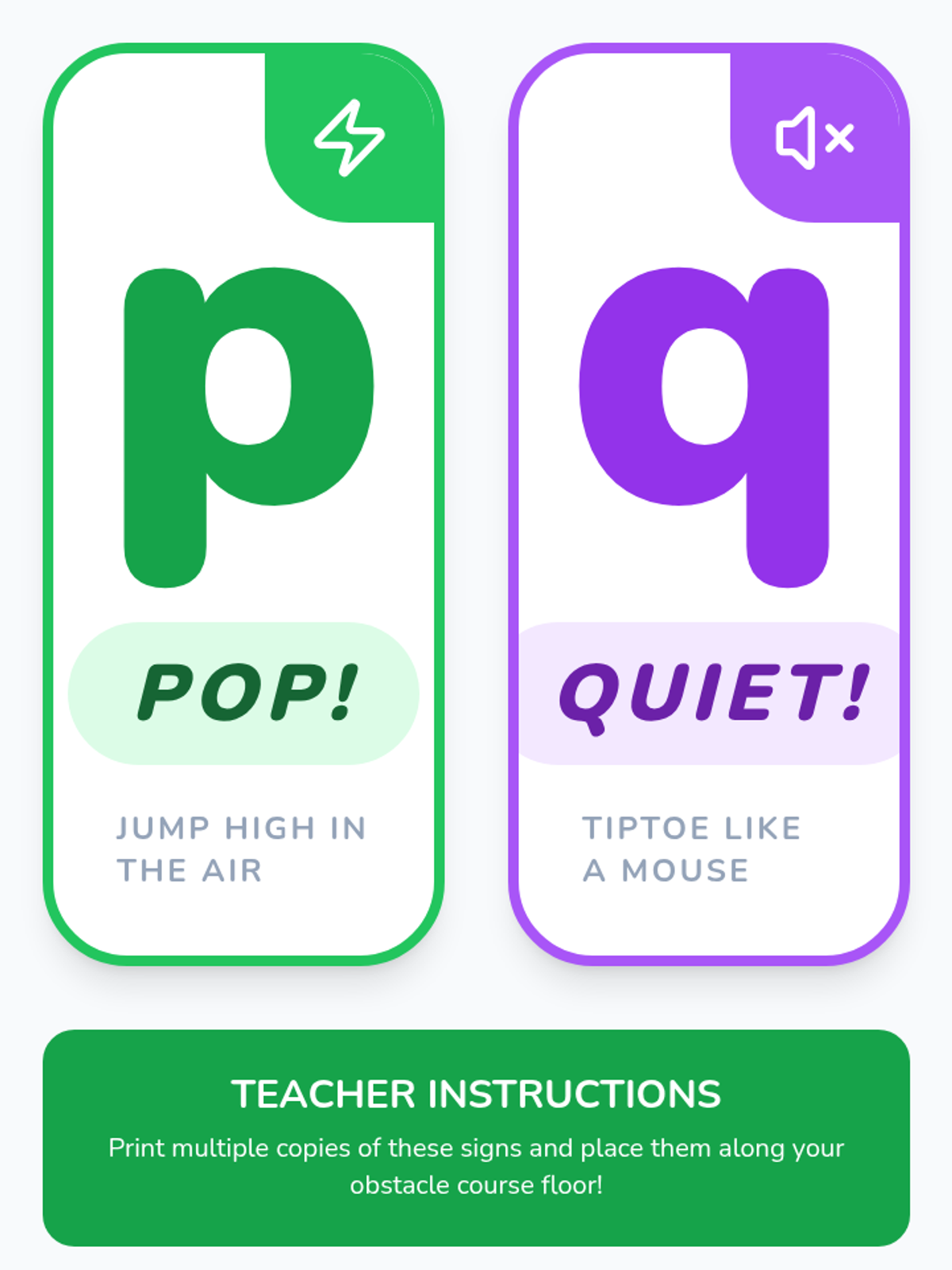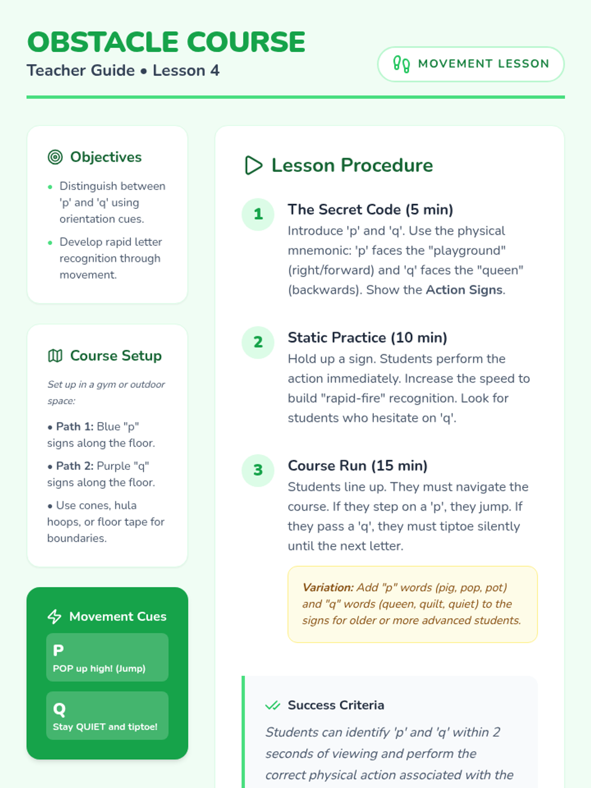 A gross-motor movement lesson focusing on 'p' and 'q' where students perform actions based on the letter they encounter.