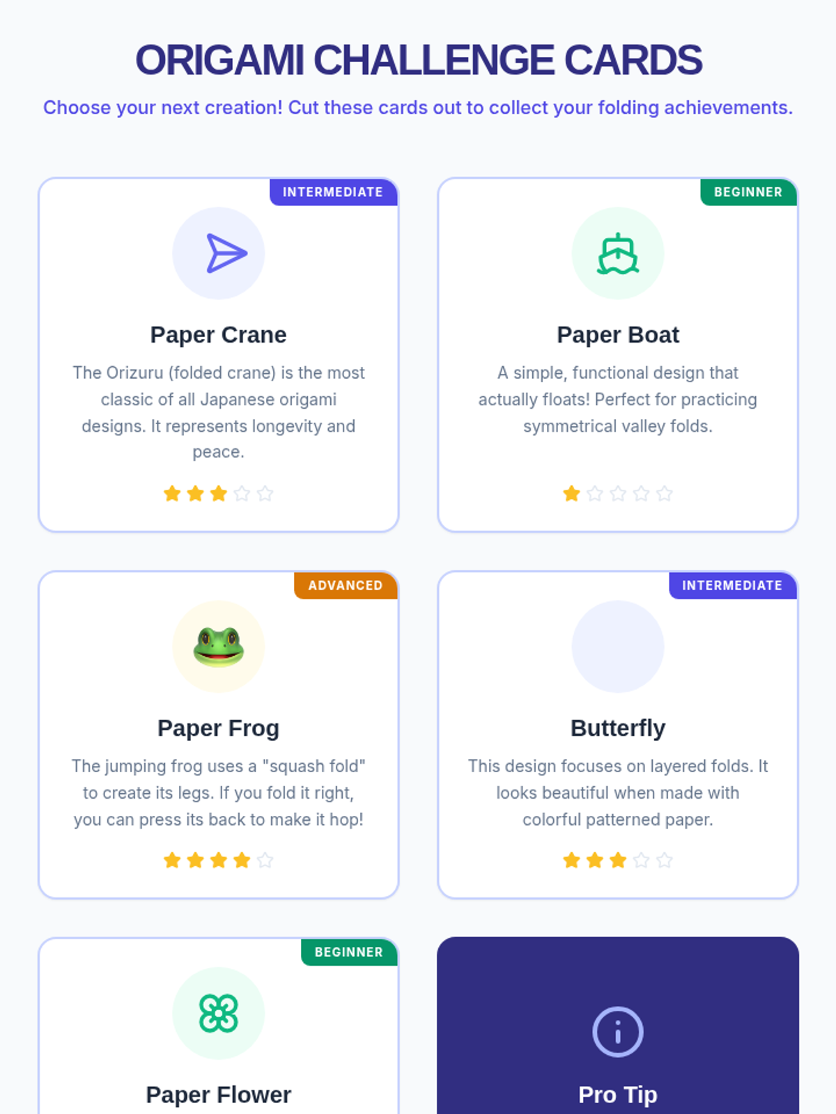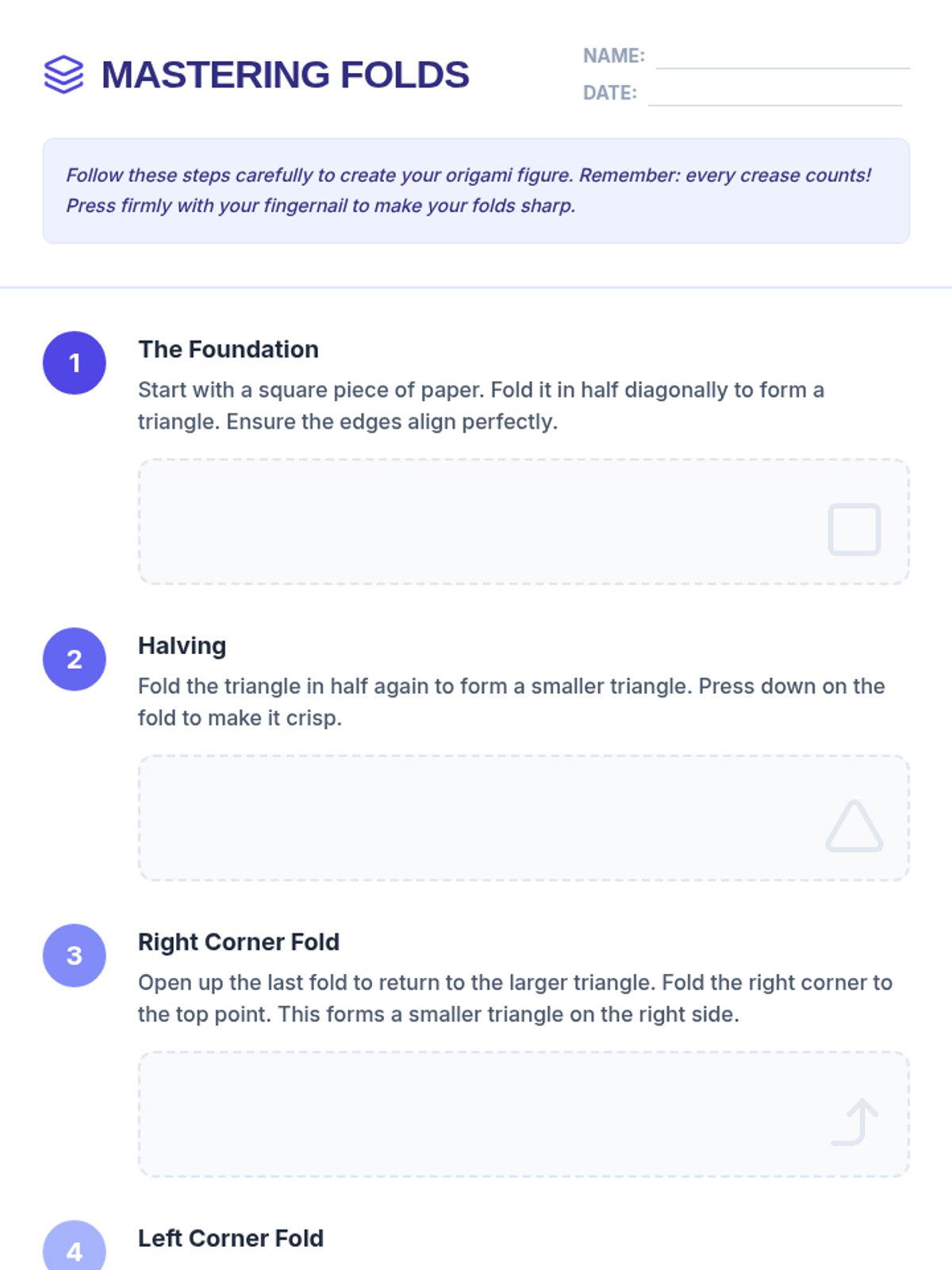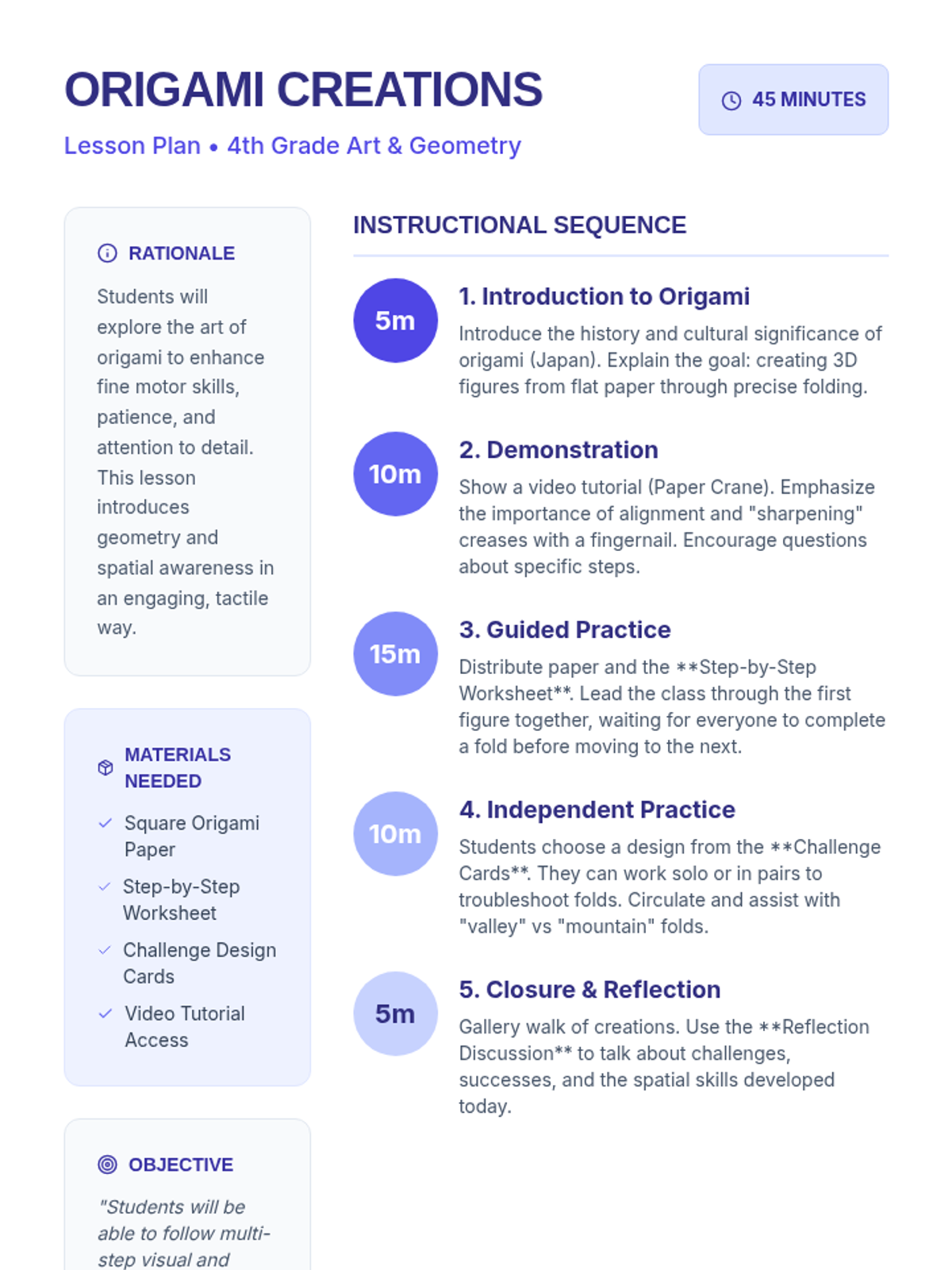 A hands-on exploration of origami where students develop fine motor skills, patience, and spatial awareness by creating paper figures. This lesson covers basic techniques and cultural context while guiding students through multiple designs.