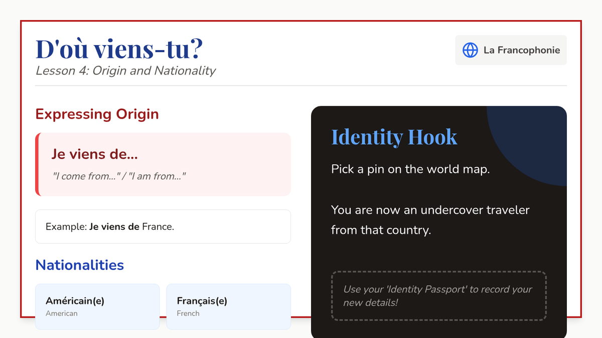 Exploring origin and nationality using 'Je viens de' and investigating the French-speaking world (La Francophonie).