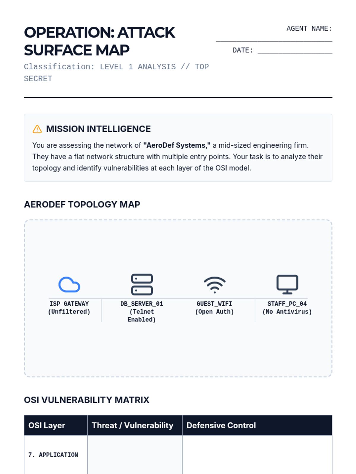 Students review the OSI model to map specific security threats to layers and identify potential entry points for attackers in a network topology.