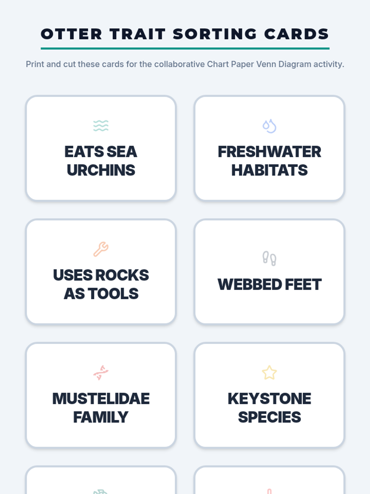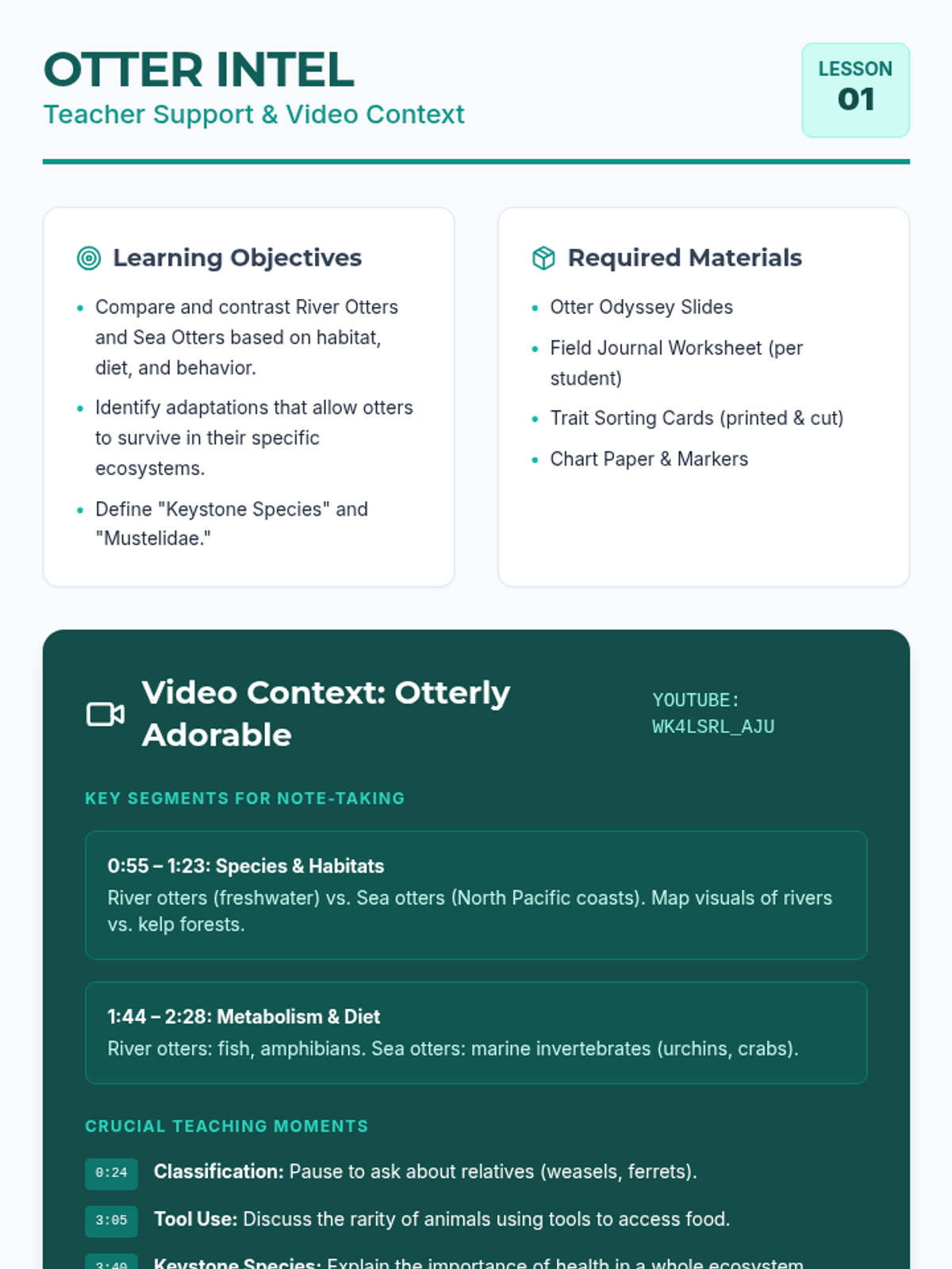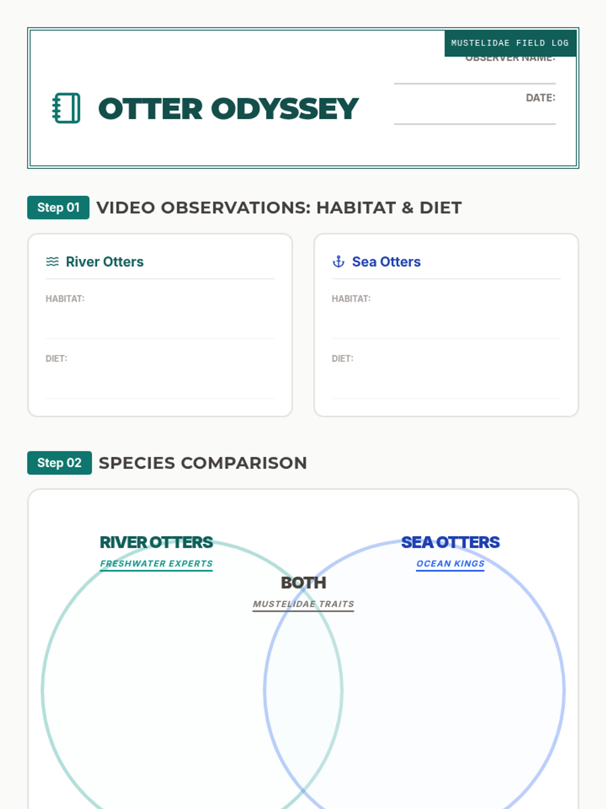 A 5th-6th grade biology lesson where students compare River Otters and Sea Otters using video analysis, collaborative sorting, and a Venn diagram activity. Students explore adaptations, habitats, and ecological roles while learning about the Mustelidae family.