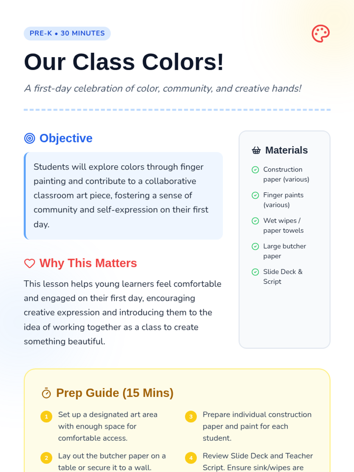 A fun, hands-on activity for Pre-K students to explore colors and express themselves creatively while getting to know their new classmates. Perfect for the first day of school to foster community through collaborative art.