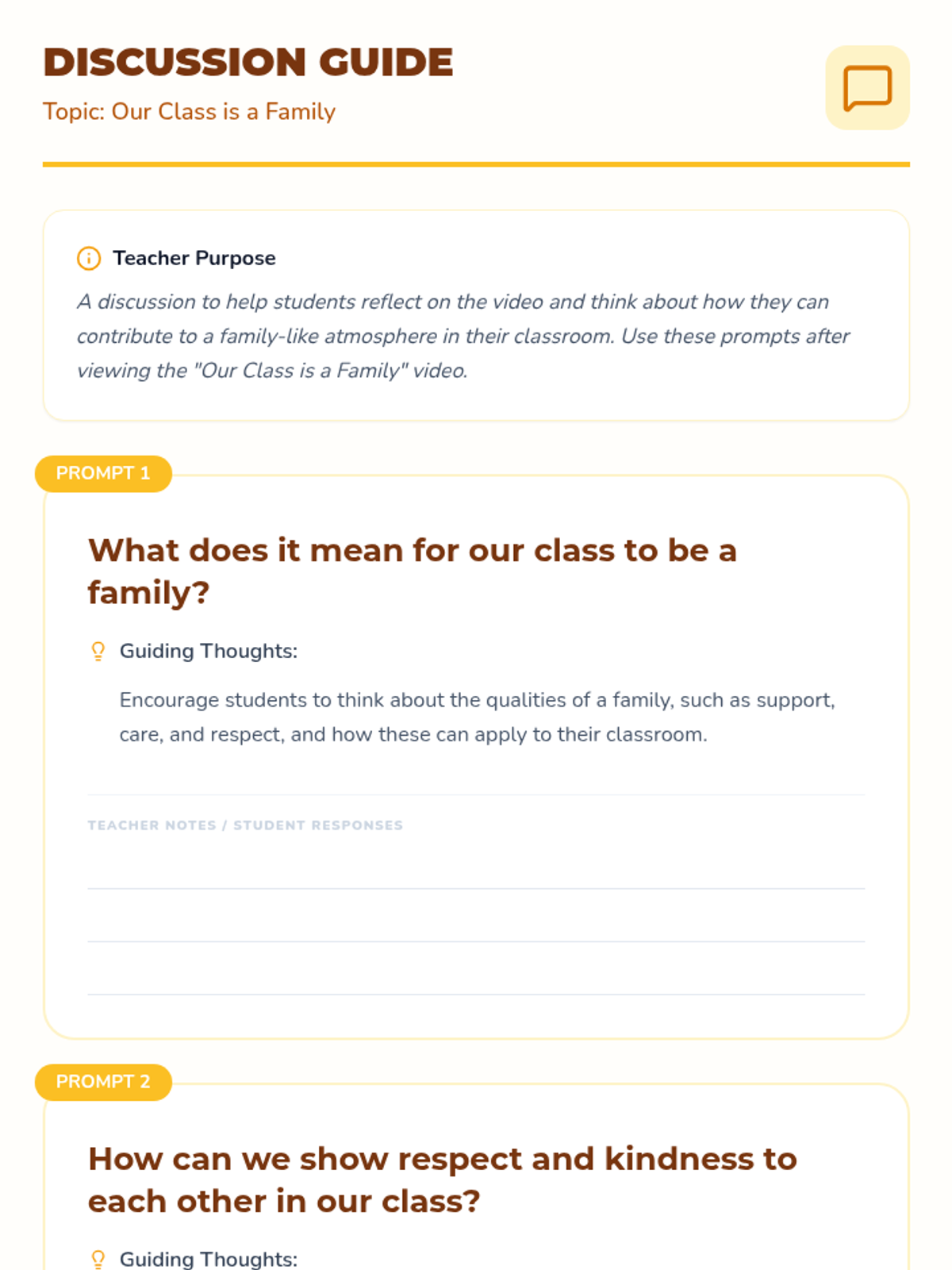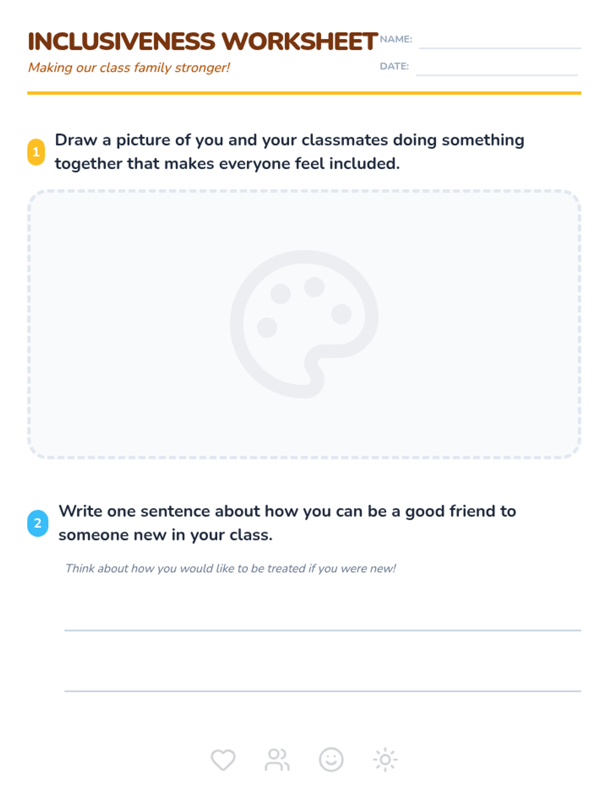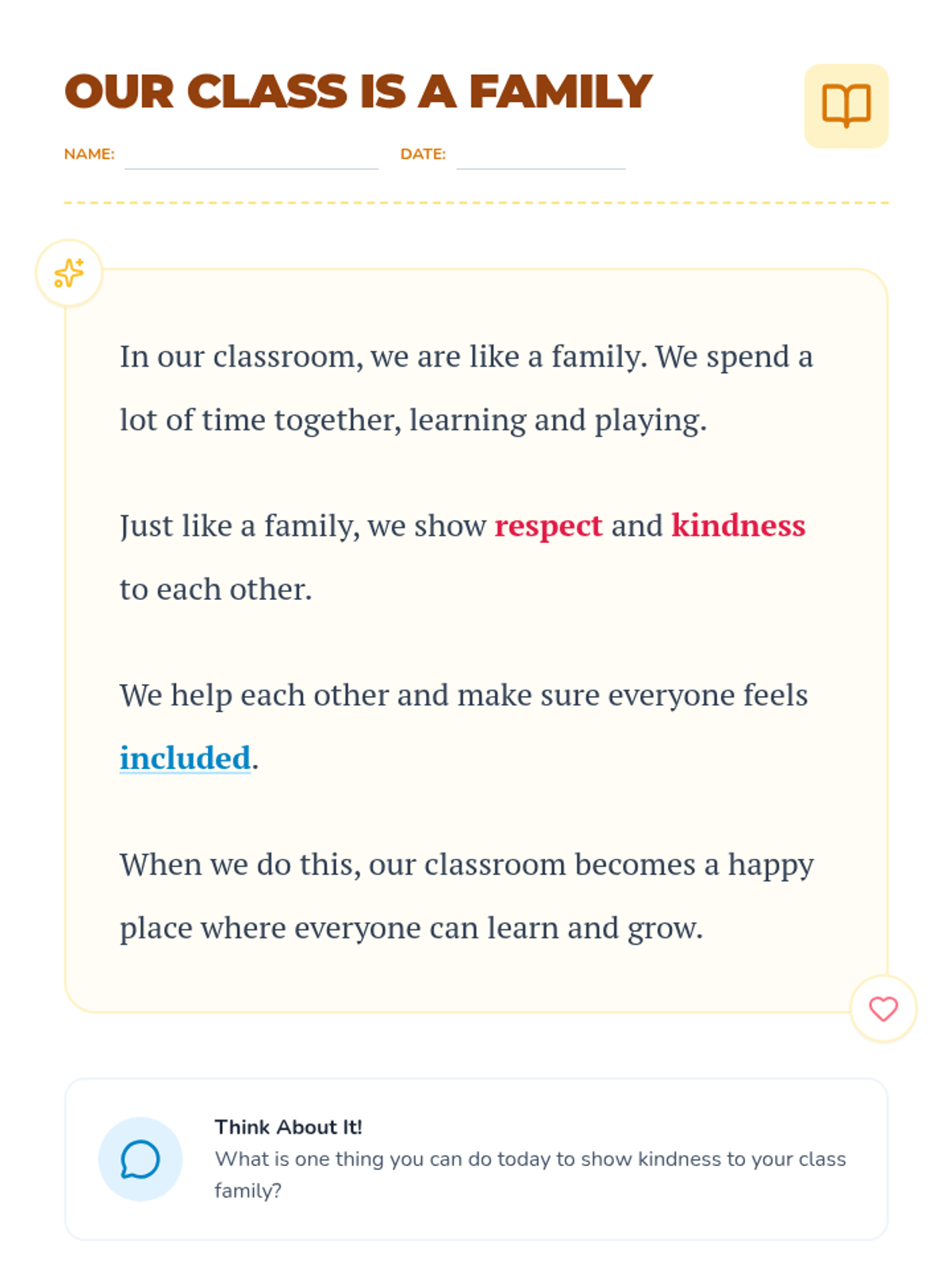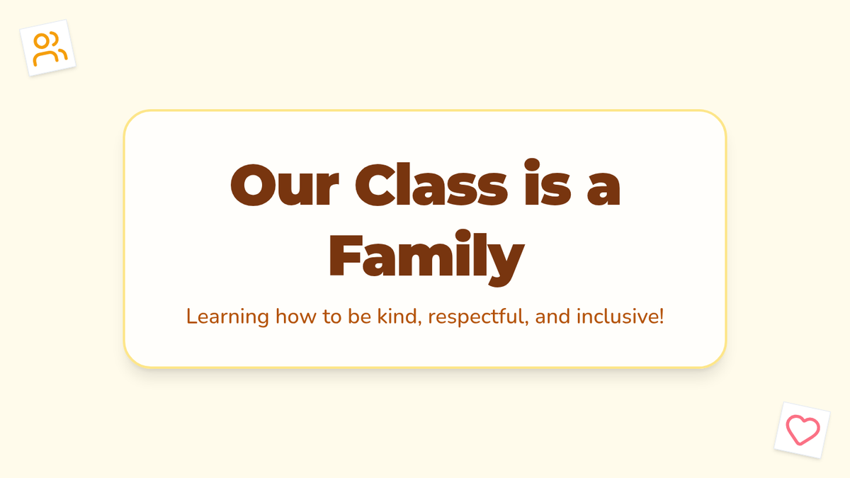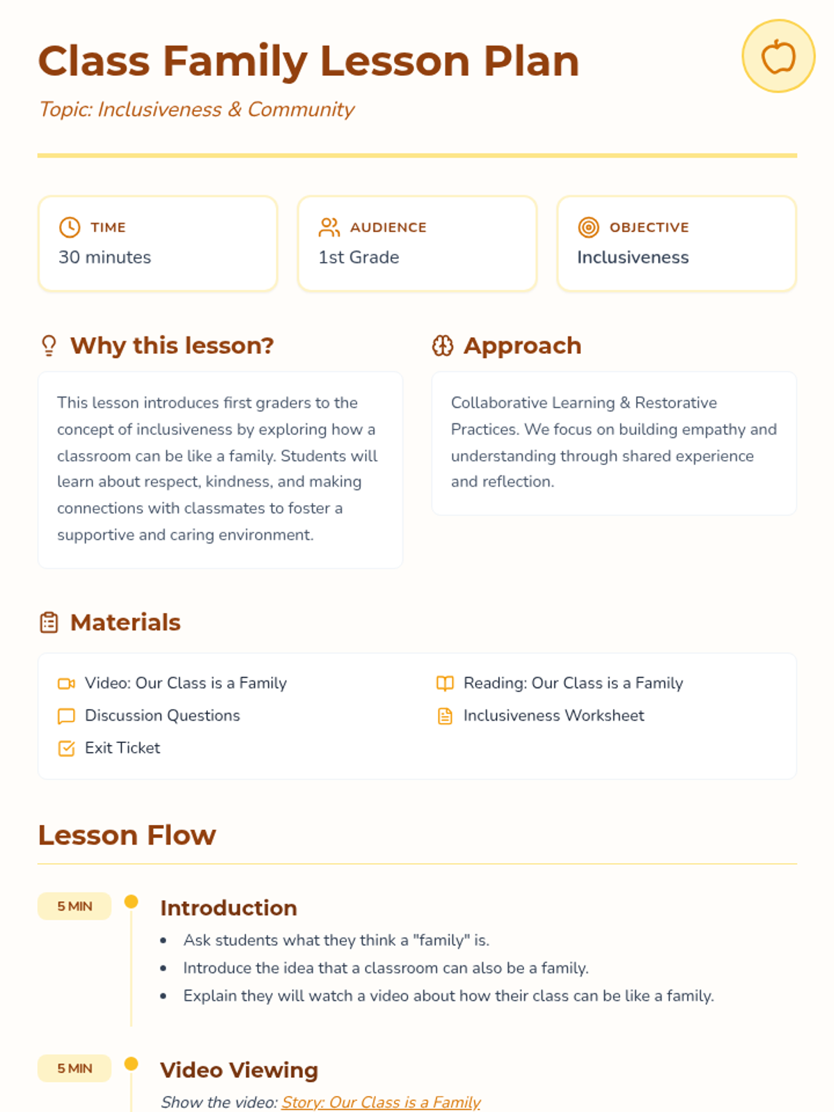 This lesson introduces first graders to the concept of inclusiveness by exploring how a classroom can be like a family. Students will learn about respect, kindness, and making connections through a story, collaborative activities, and reflection.