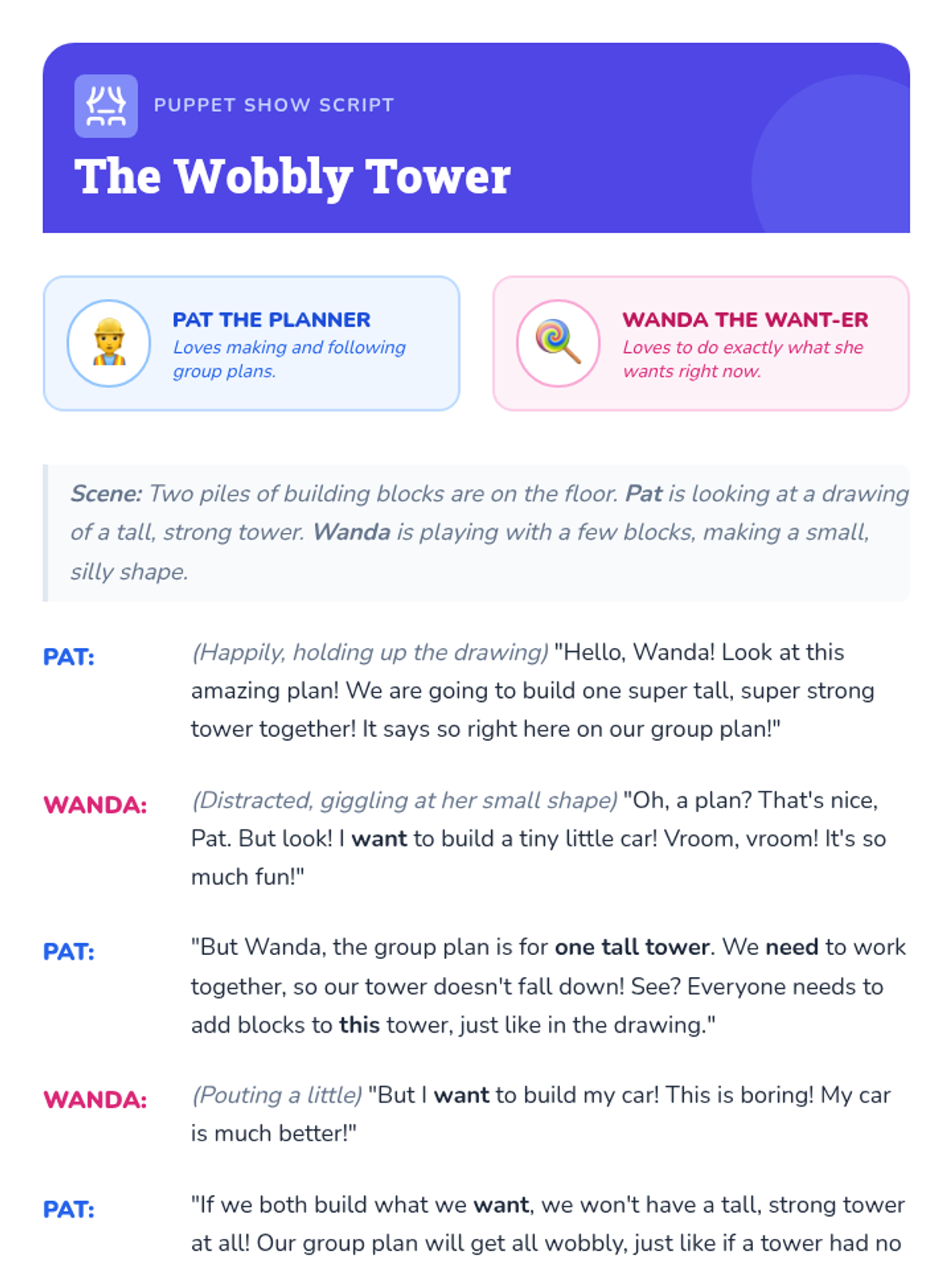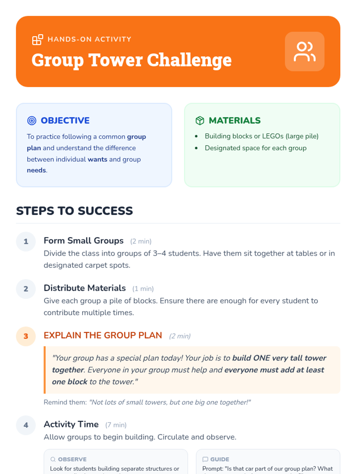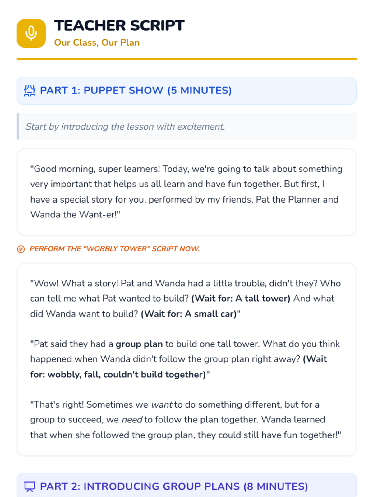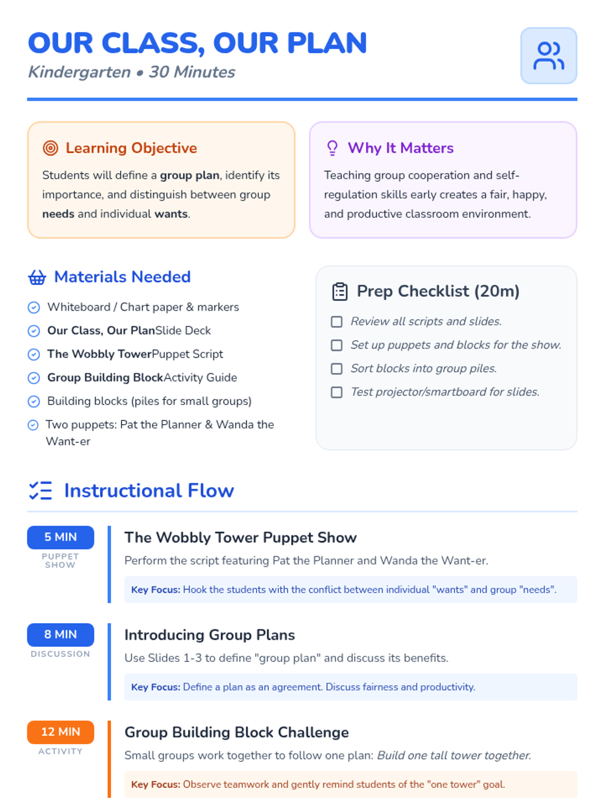 A Kindergarten lesson teaching students the importance of following group plans and distinguishing between 'needs' and 'wants' to achieve group goals together.