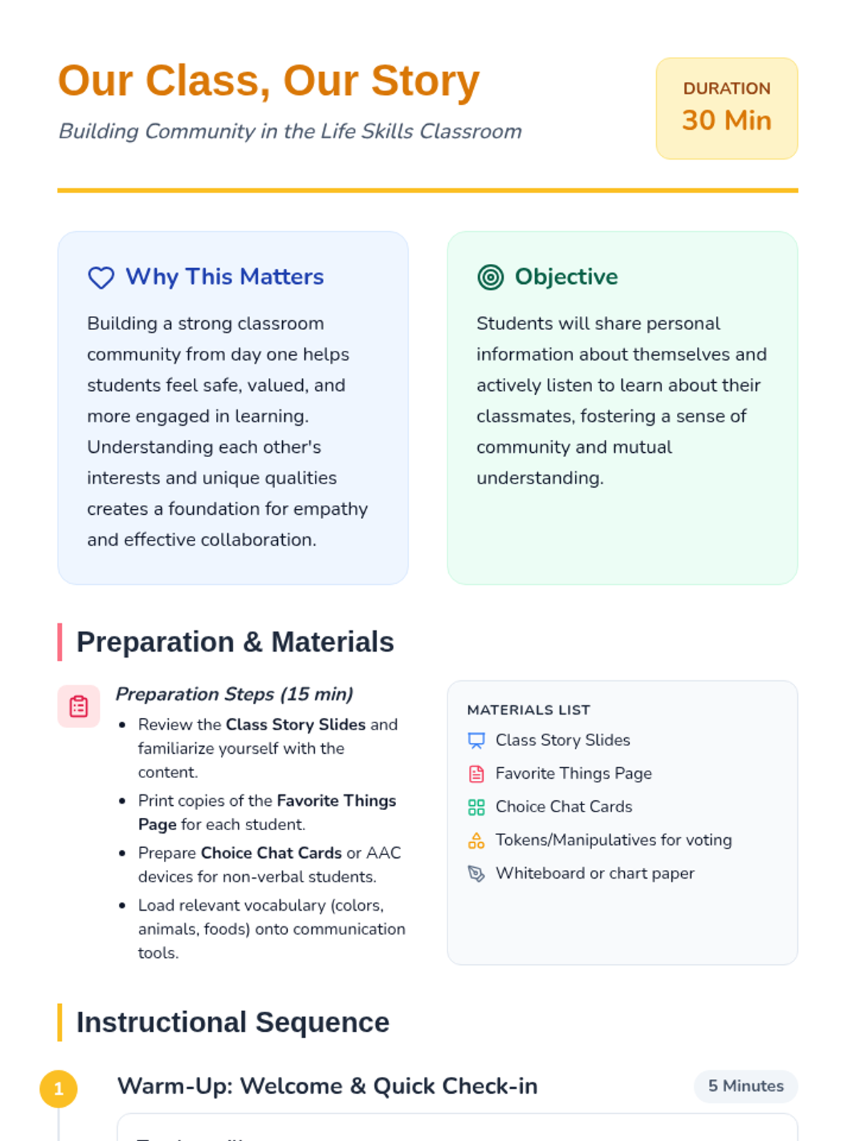 A 30-minute inclusive lesson for life skills classrooms focused on building community through sharing personal favorites and interests using verbal and non-verbal communication.