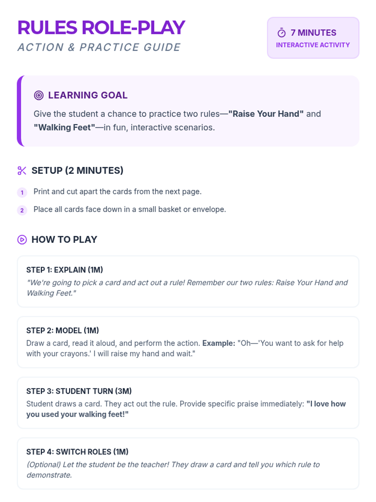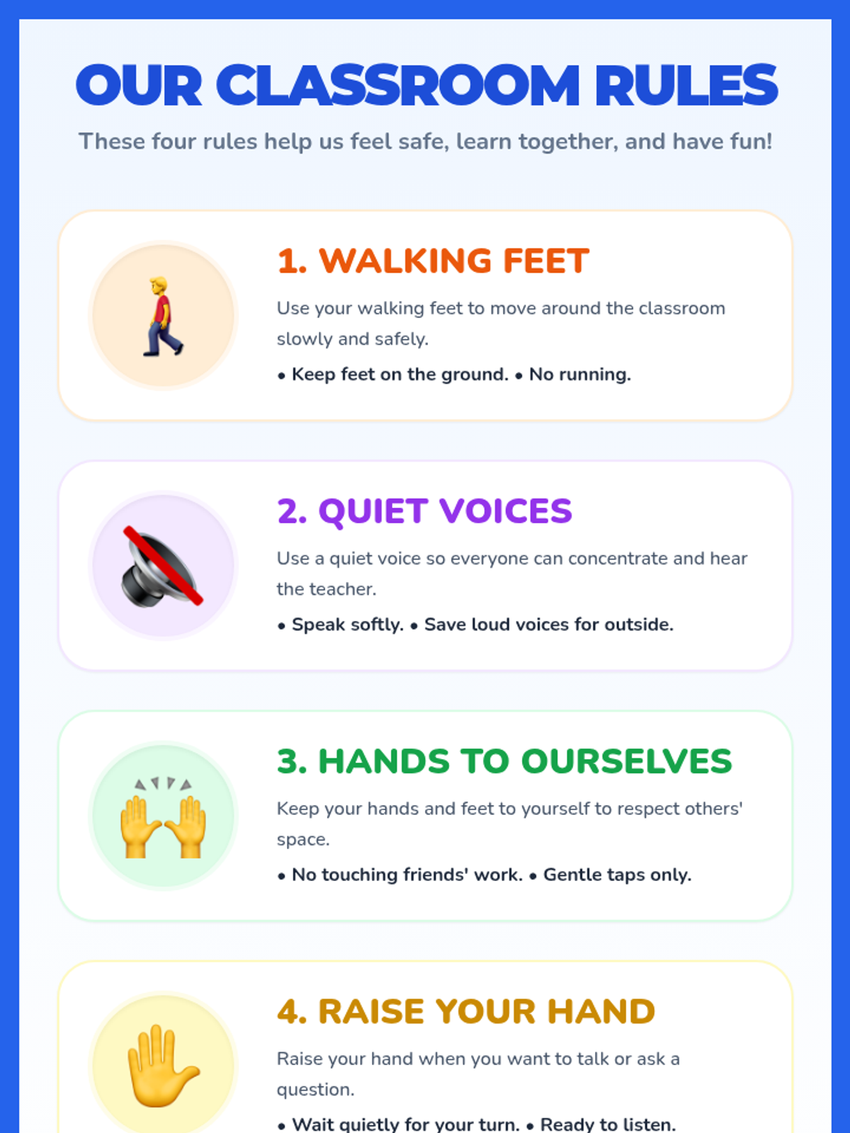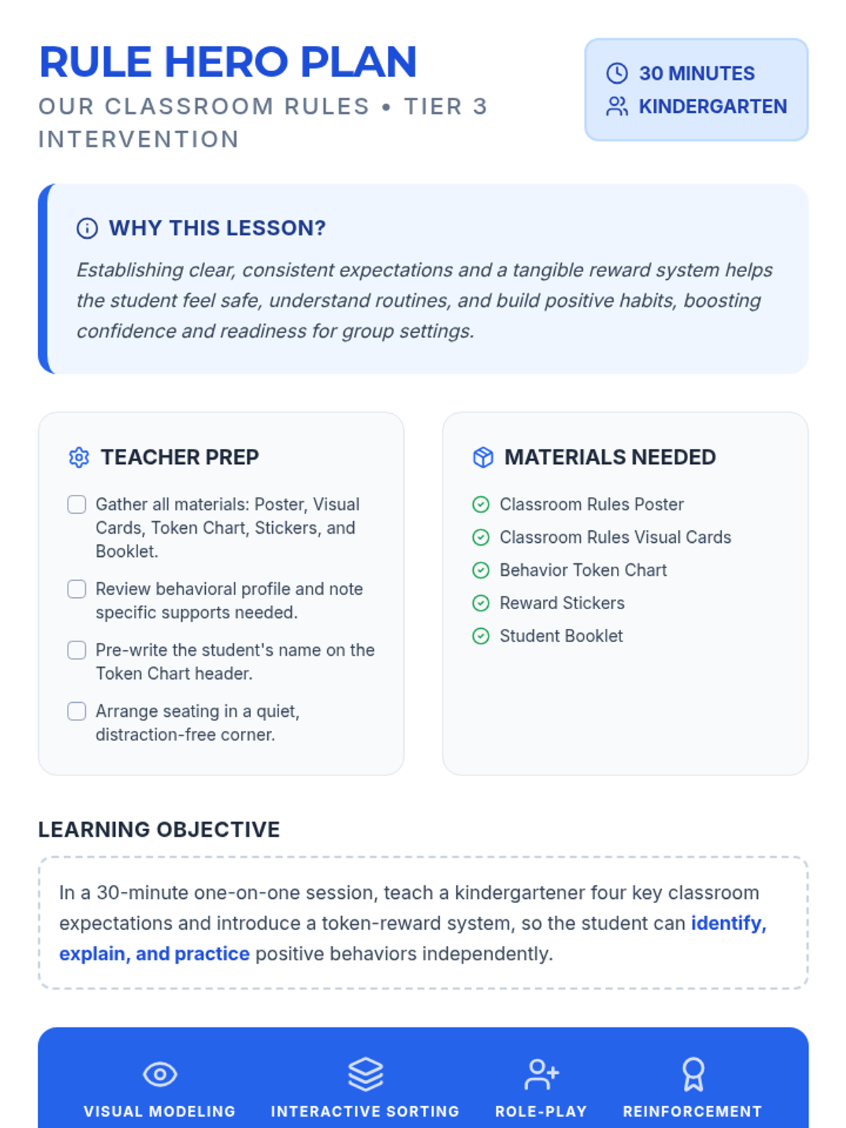 A focused 30-minute Tier 3 intervention lesson for kindergarten students to learn and practice four essential classroom rules: Walking Feet, Quiet Voices, Hands to Ourselves, and Raise Your Hand. includes visual aids, role-play scenarios, and a token reinforcement system.