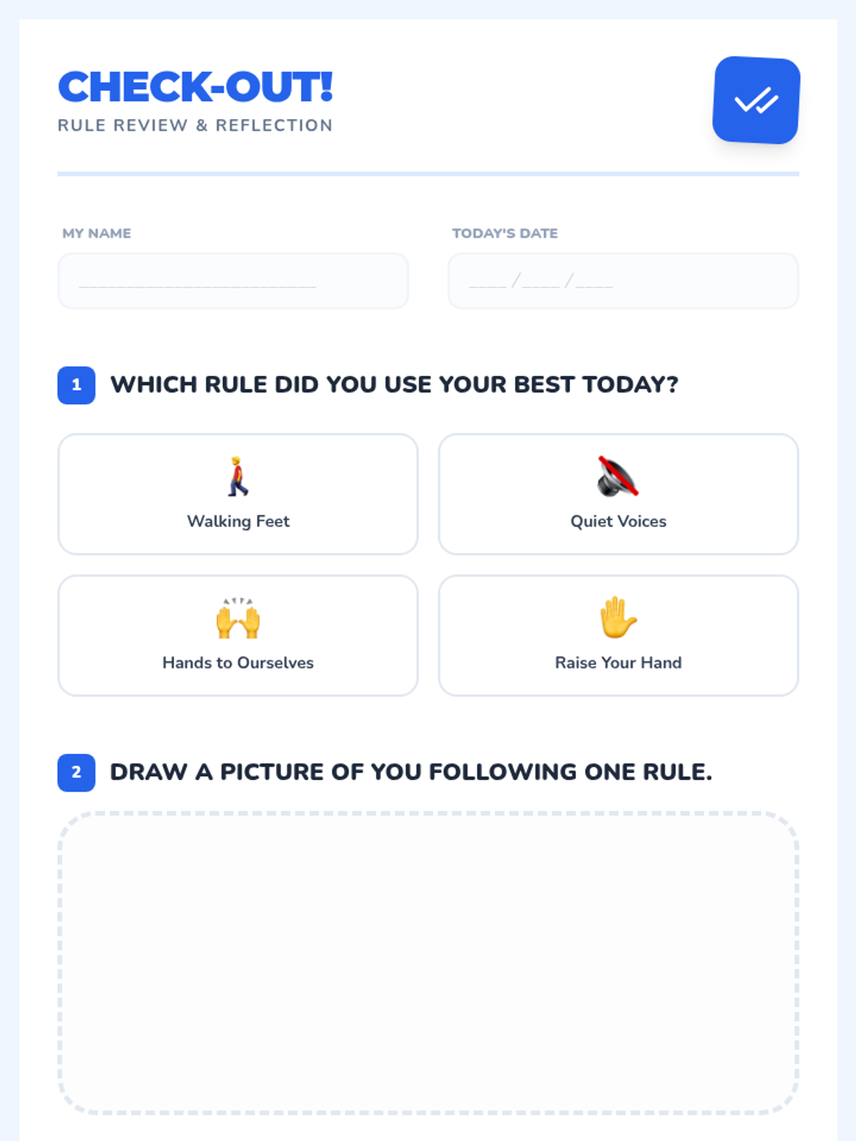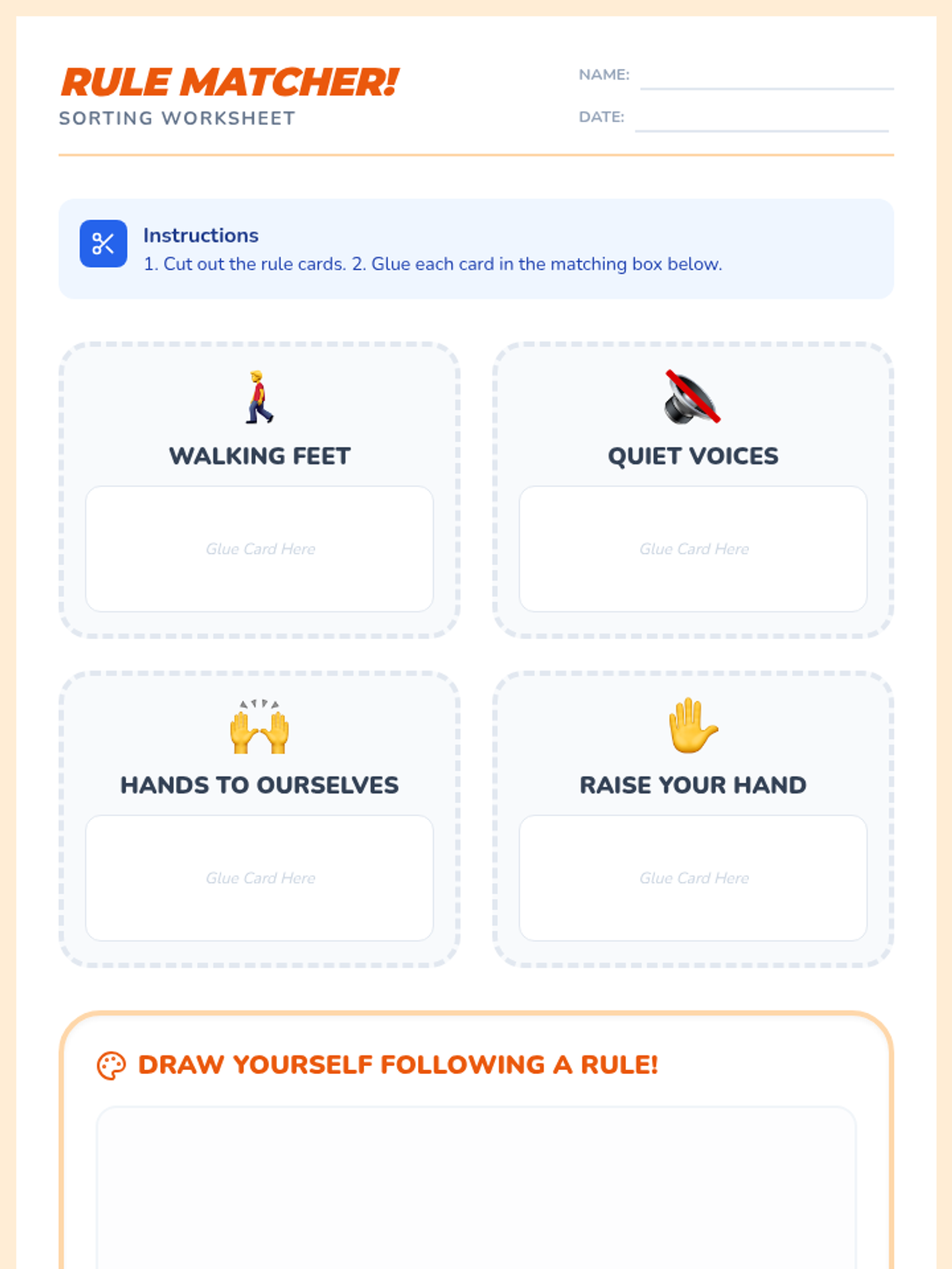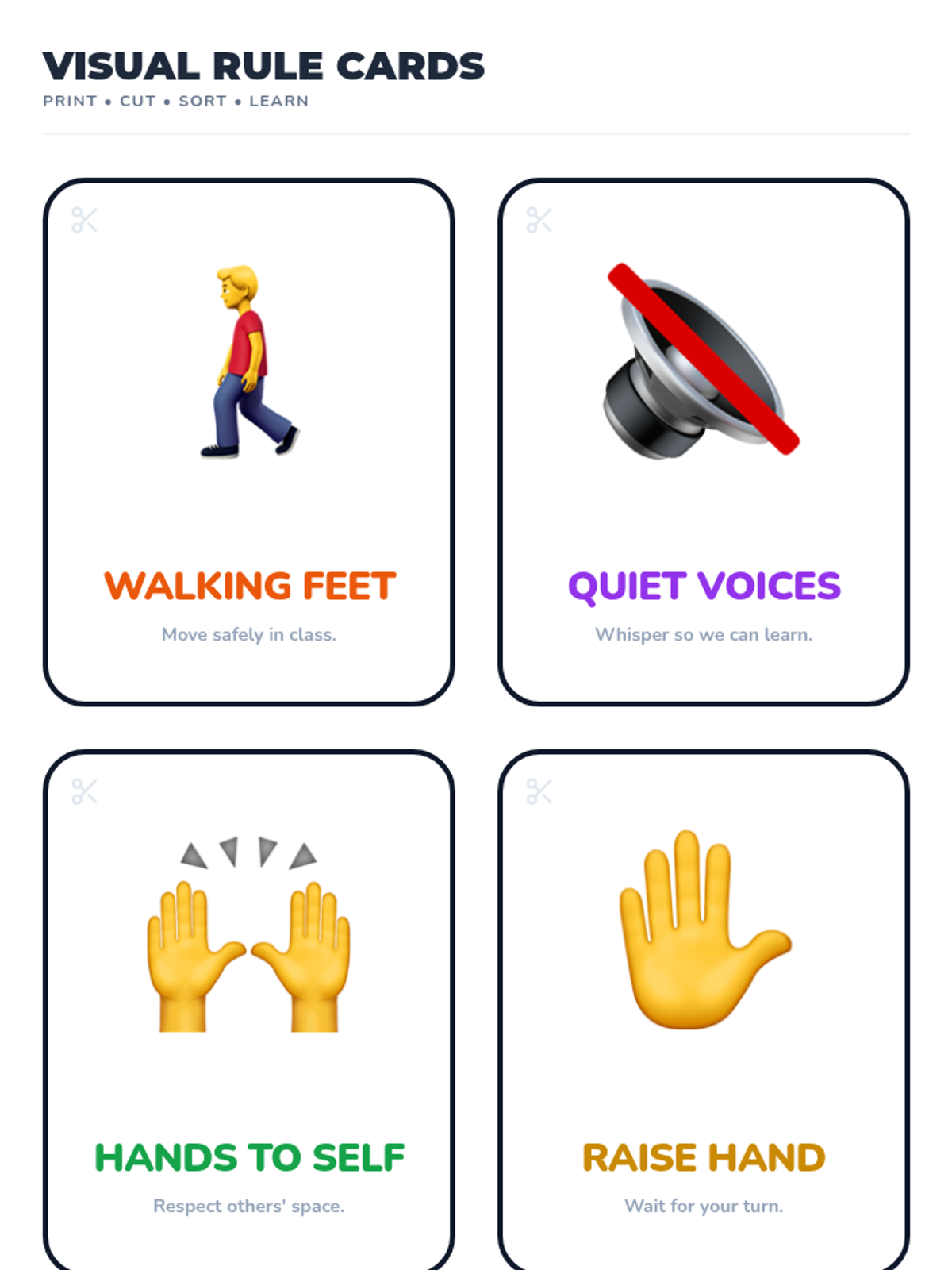 A focused 30-minute Tier 3 intervention lesson for kindergarten students to learn and practice four essential classroom rules: Walking Feet, Quiet Voices, Hands to Ourselves, and Raise Your Hand. includes visual aids, role-play scenarios, and a token reinforcement system.