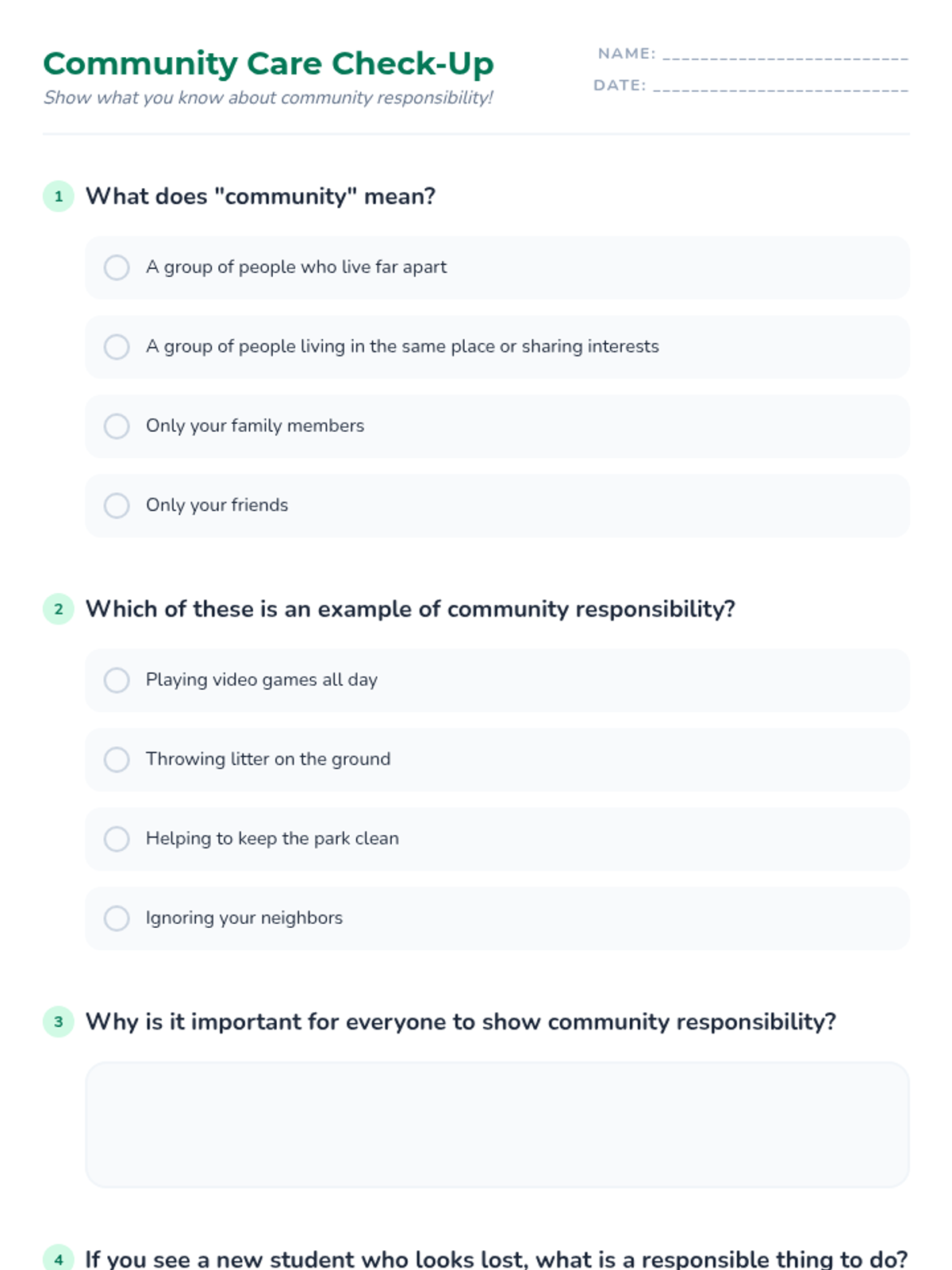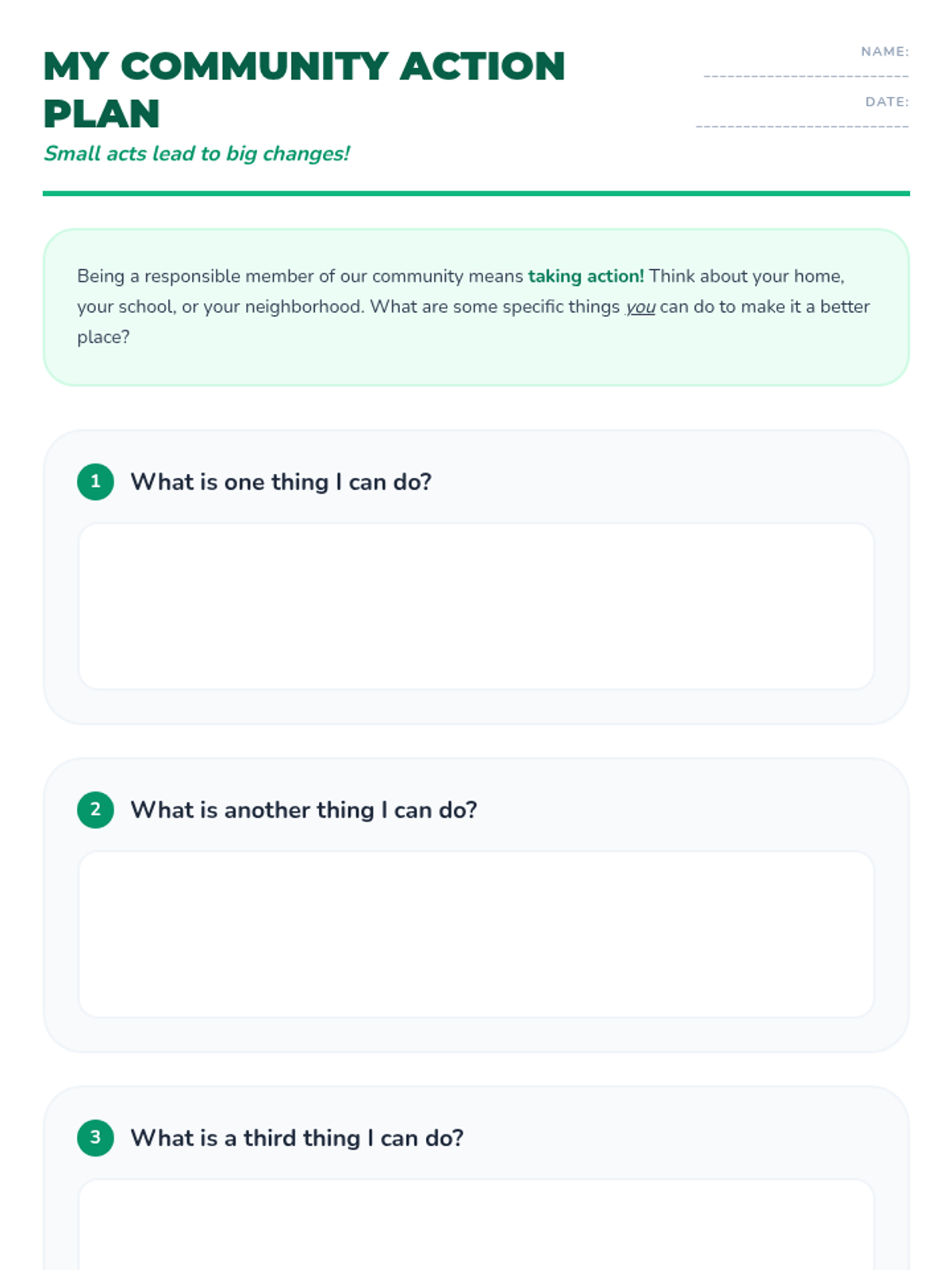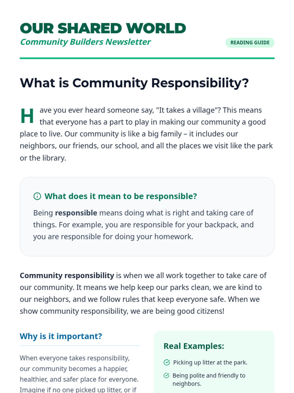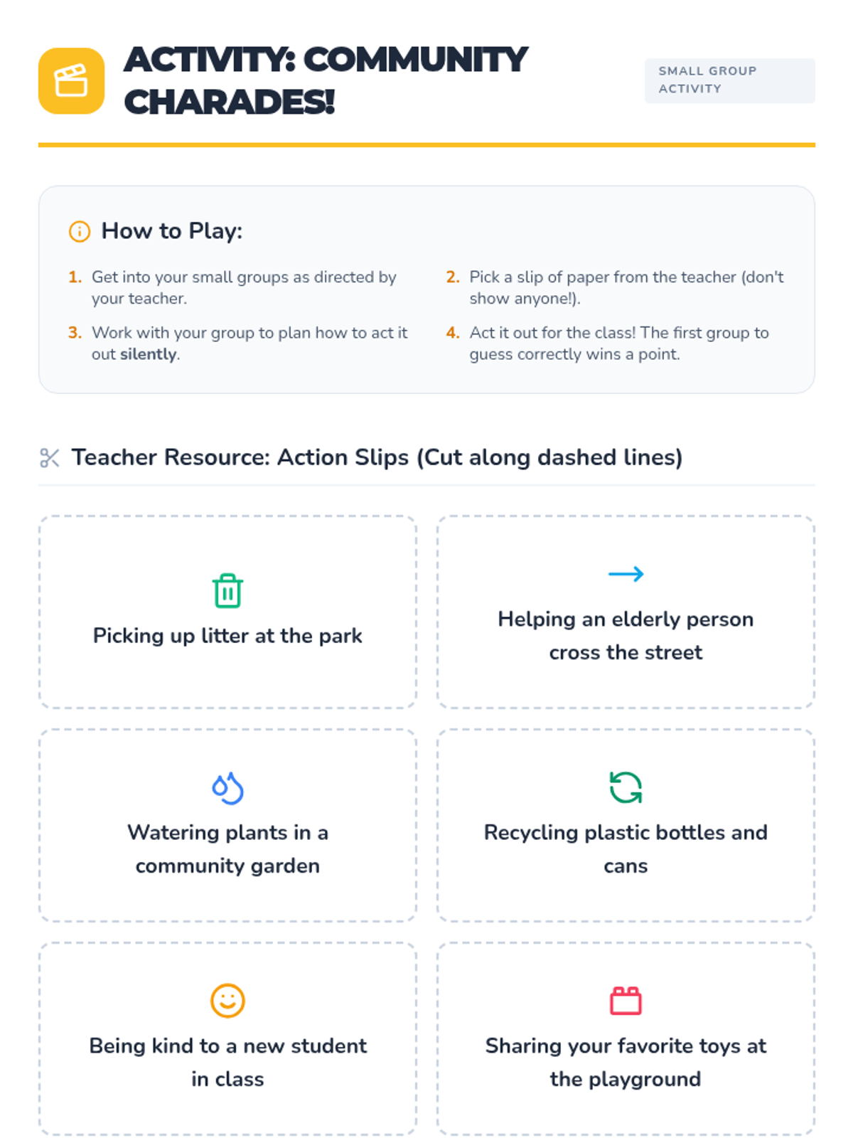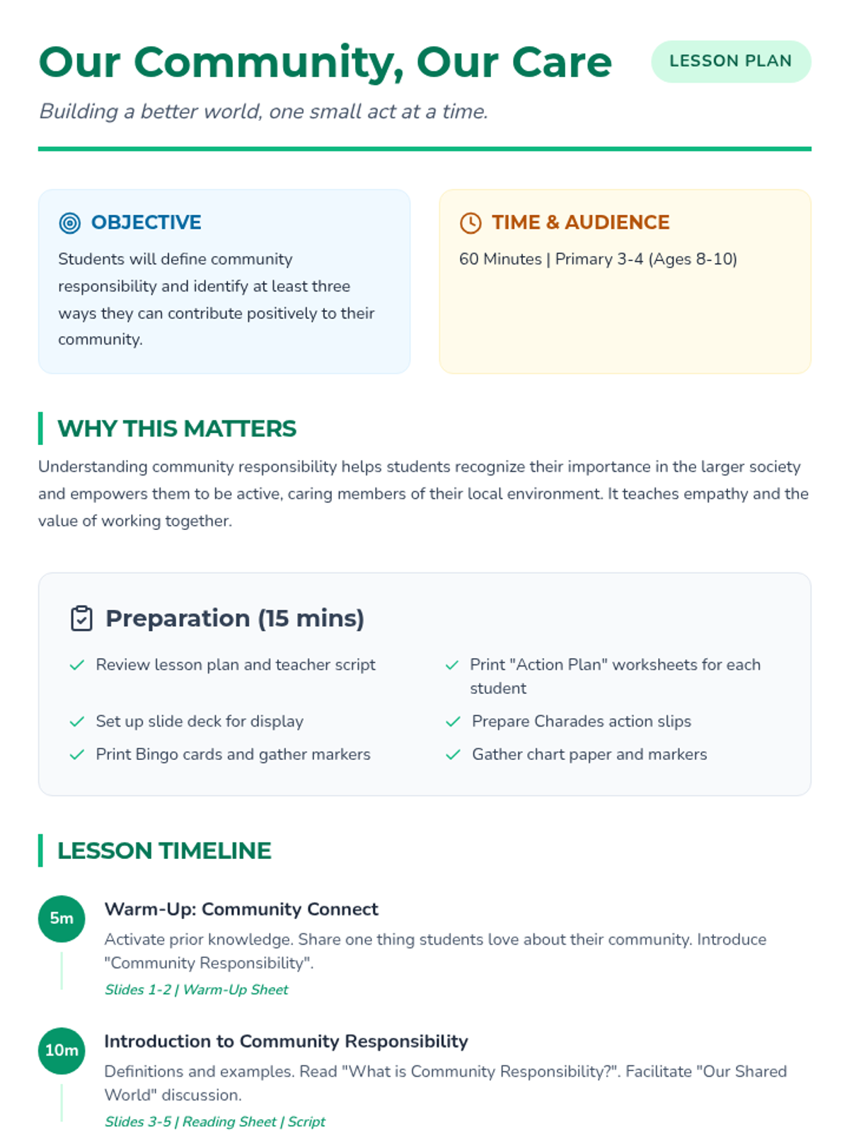 A 60-minute lesson for Primary 3 and 4 students exploring community responsibility, empathy, and positive contributions to their local environment. Students will engage in interactive activities, group work, and personal reflection to understand their role in a wider society.