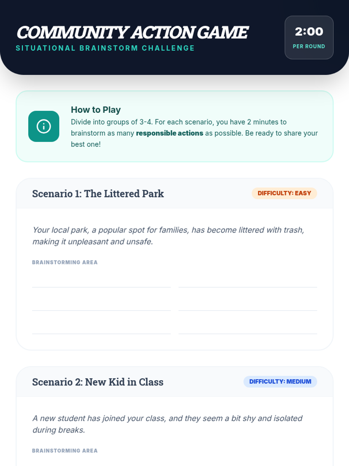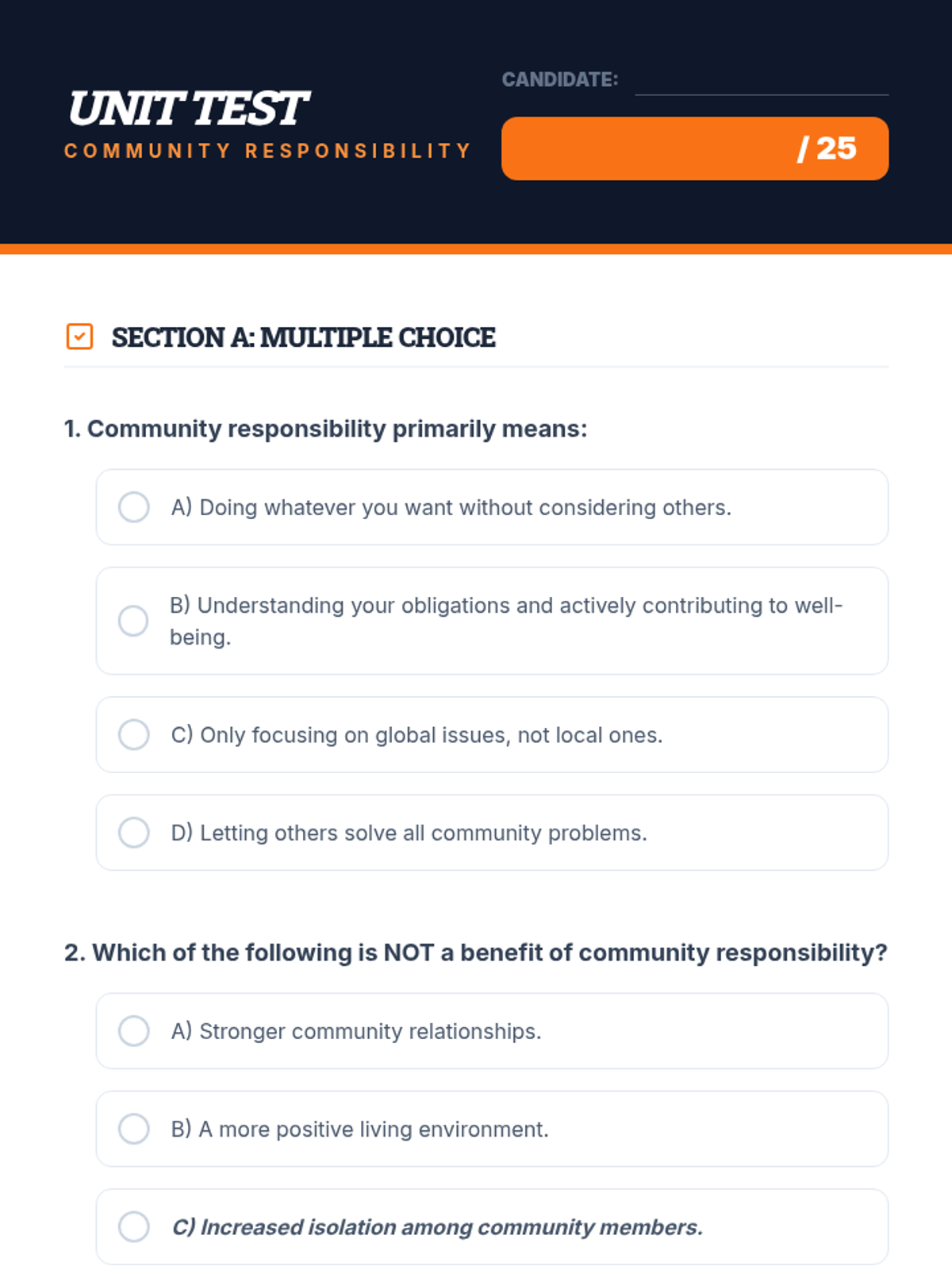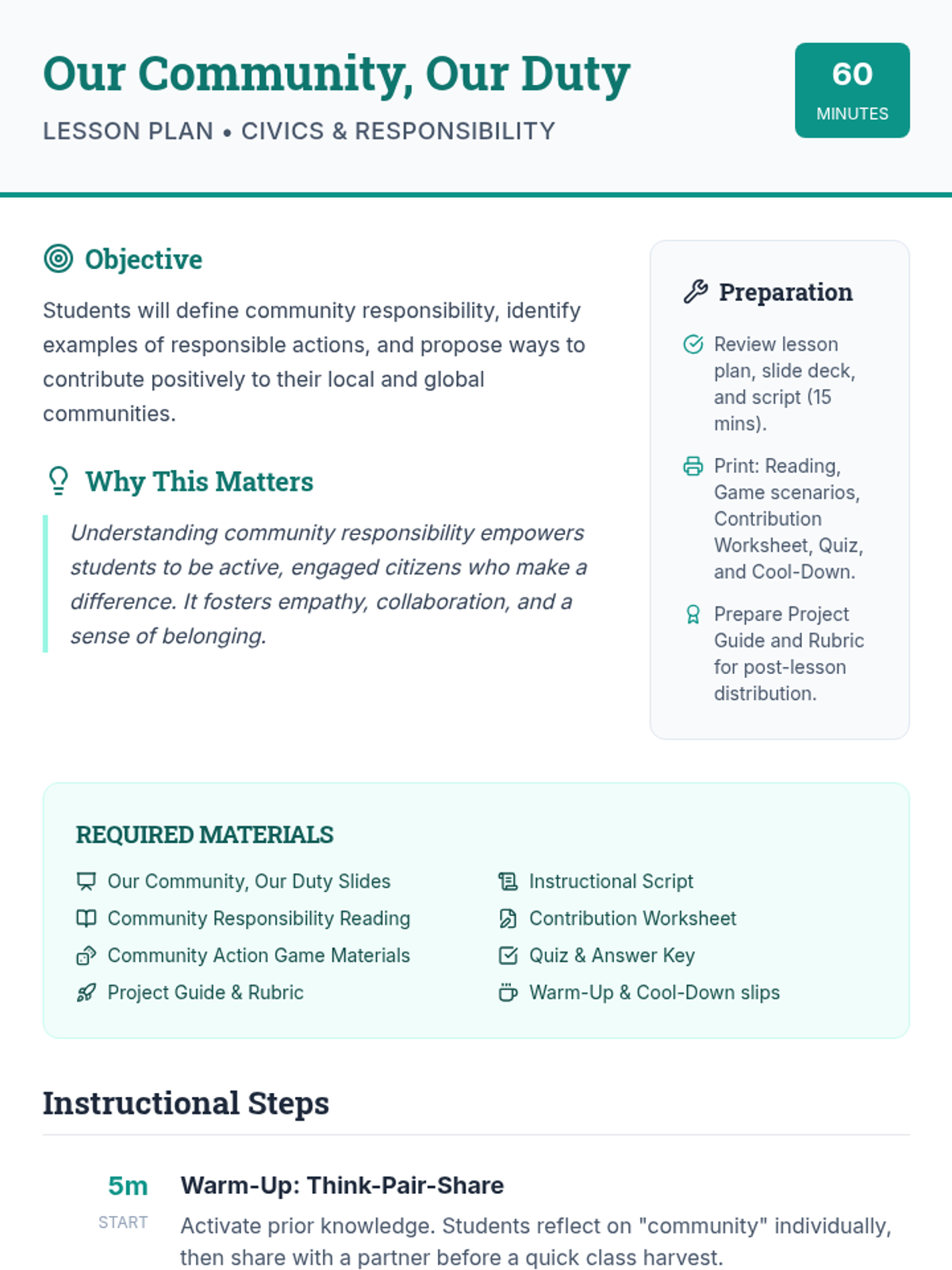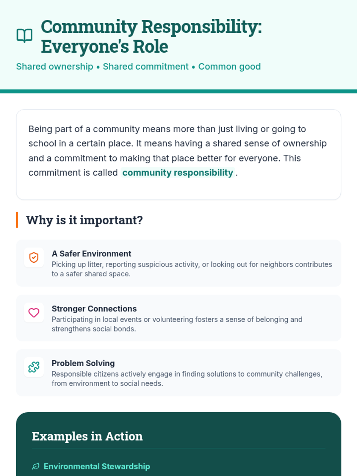 This lesson explores the concept of community responsibility, helping secondary 1 and 2 students understand their role in contributing positively to their local and global communities. Students will define community responsibility, identify responsible actions, and propose ways to contribute.