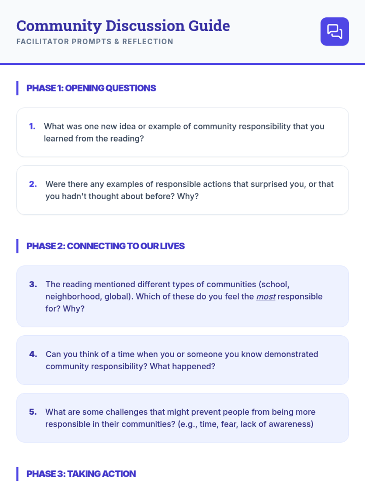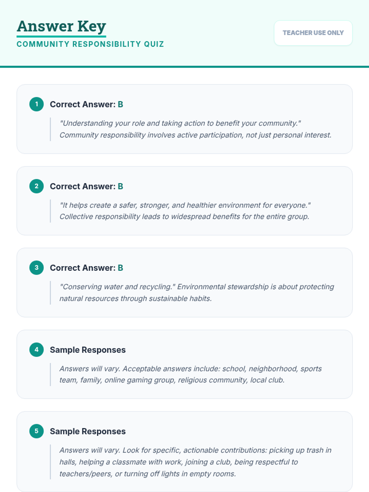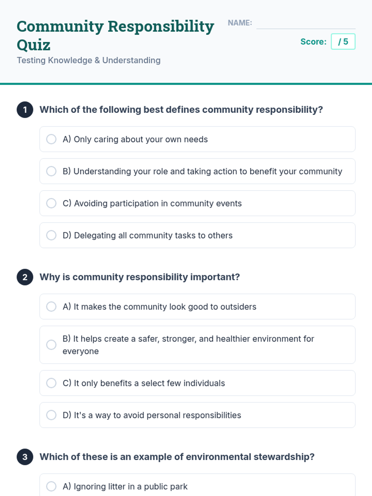 This lesson explores the concept of community responsibility, helping secondary 1 and 2 students understand their role in contributing positively to their local and global communities. Students will define community responsibility, identify responsible actions, and propose ways to contribute.