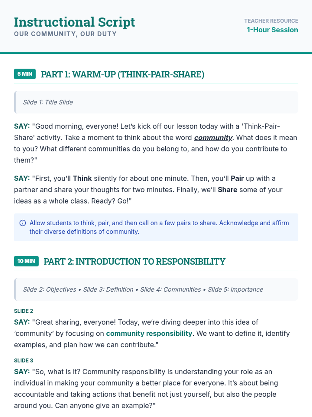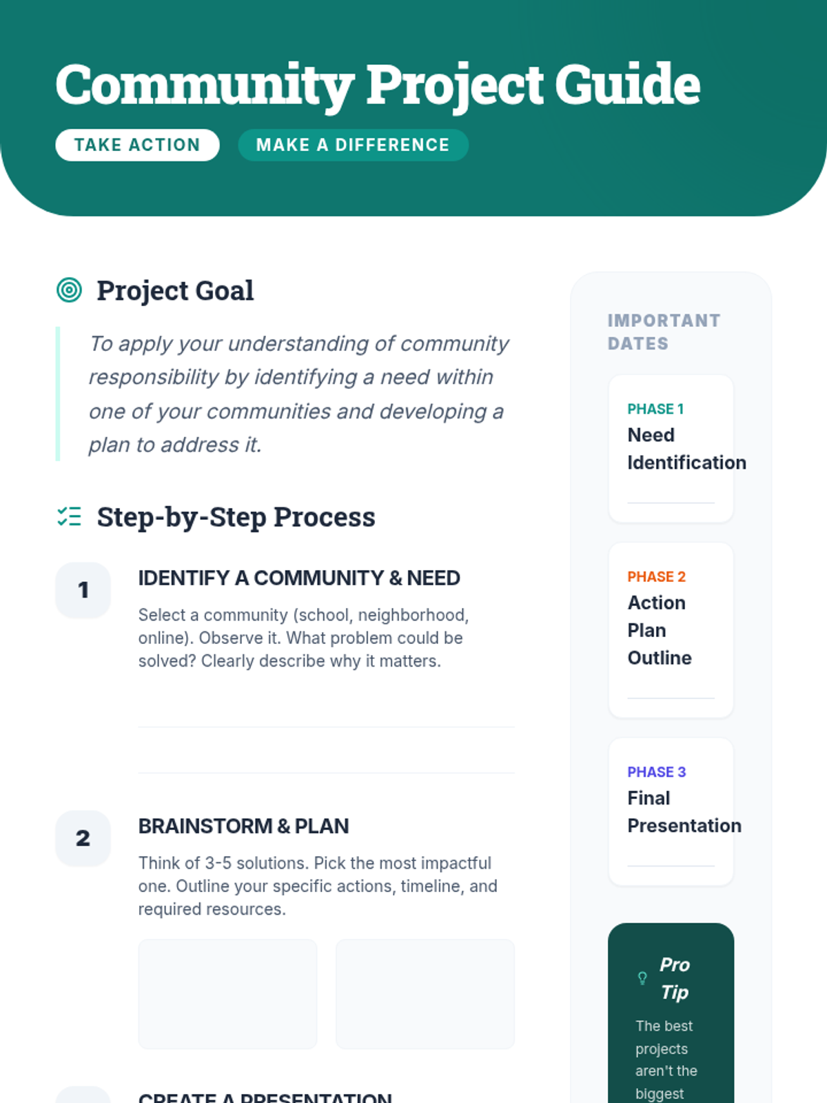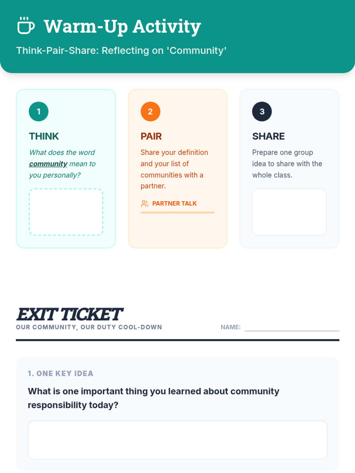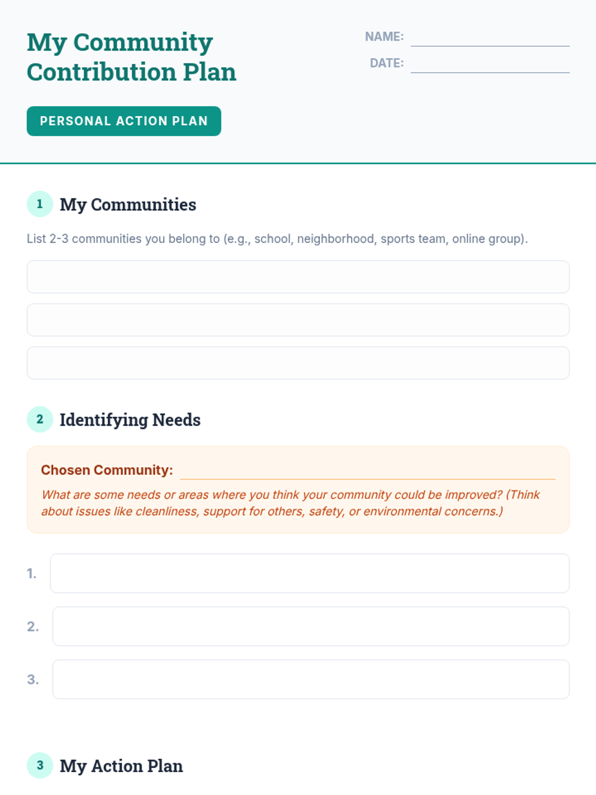 This lesson explores the concept of community responsibility, helping secondary 1 and 2 students understand their role in contributing positively to their local and global communities. Students will define community responsibility, identify responsible actions, and propose ways to contribute.
