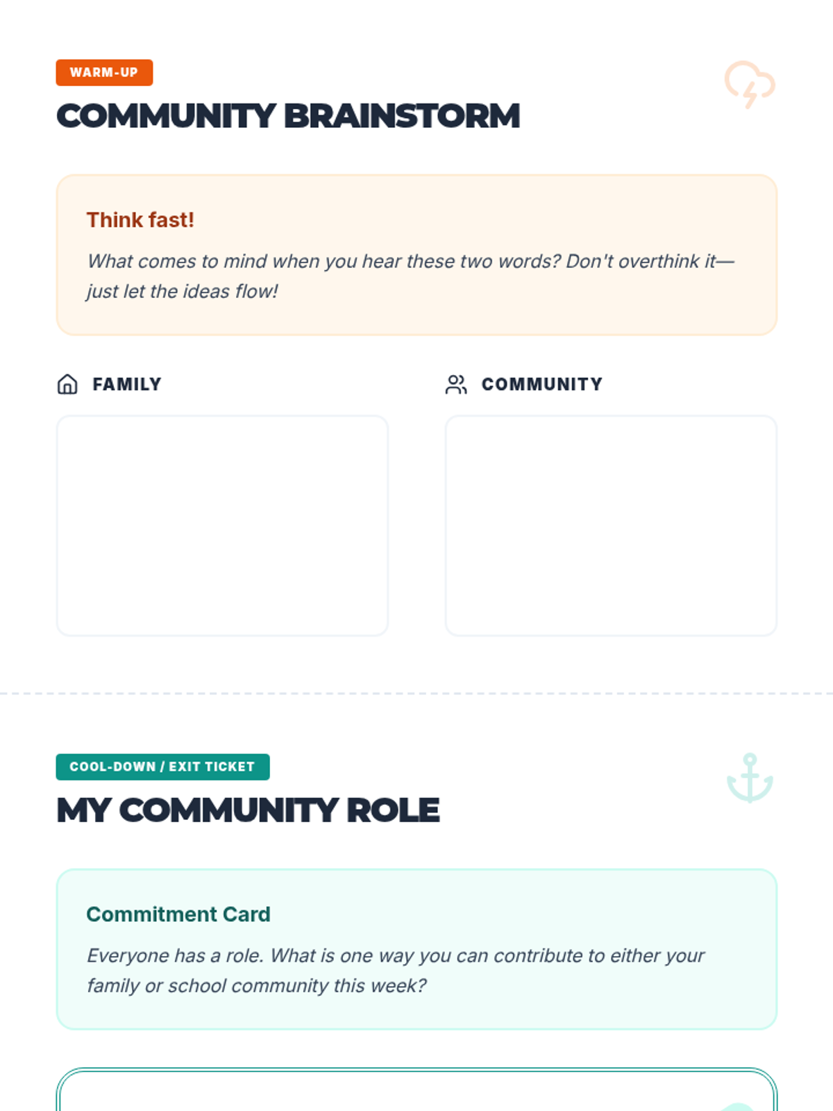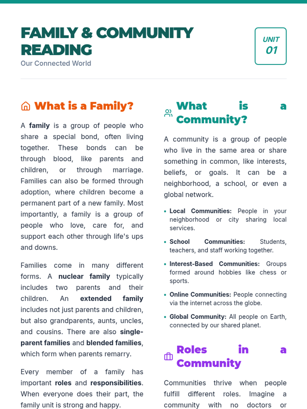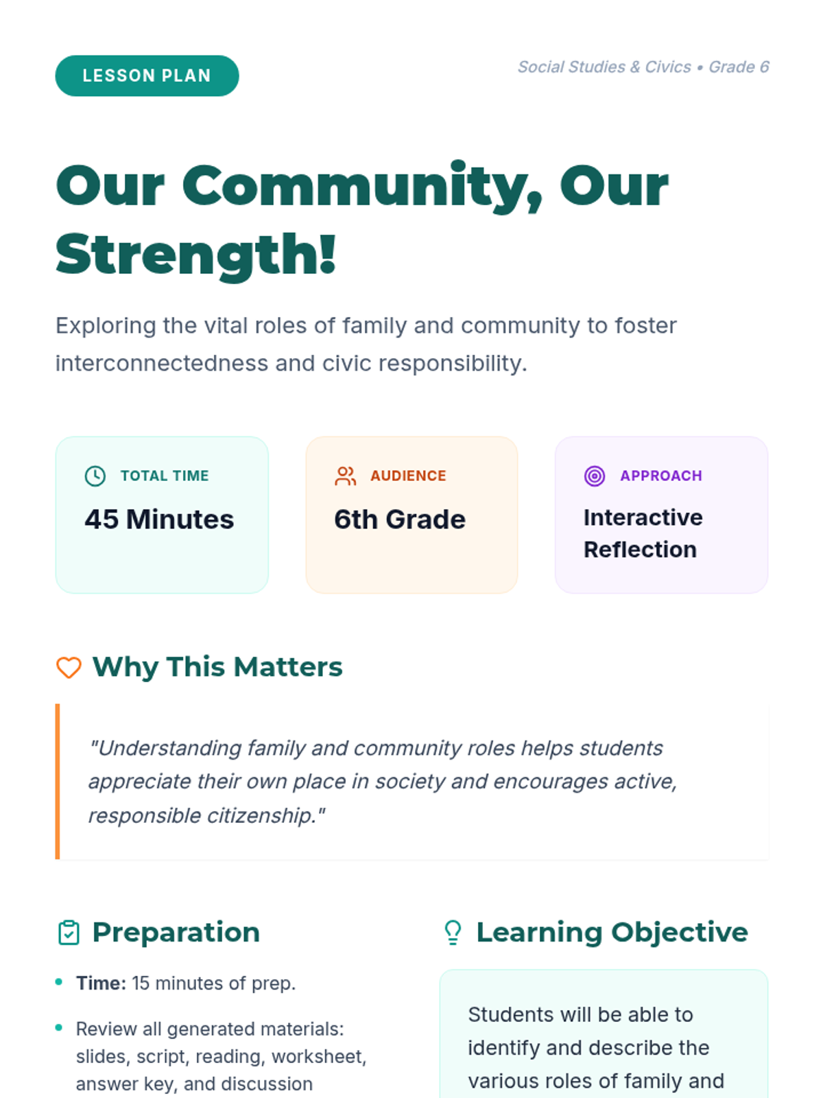 A 45-minute lesson for 6th-grade students exploring the vital roles of family and community, fostering understanding of interconnectedness and civic responsibility.