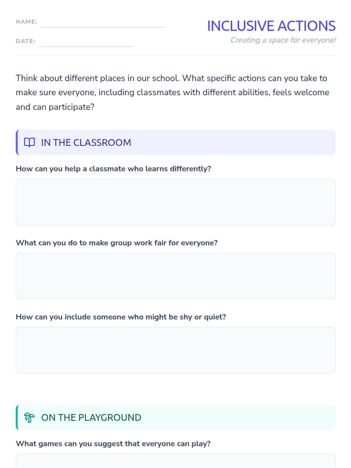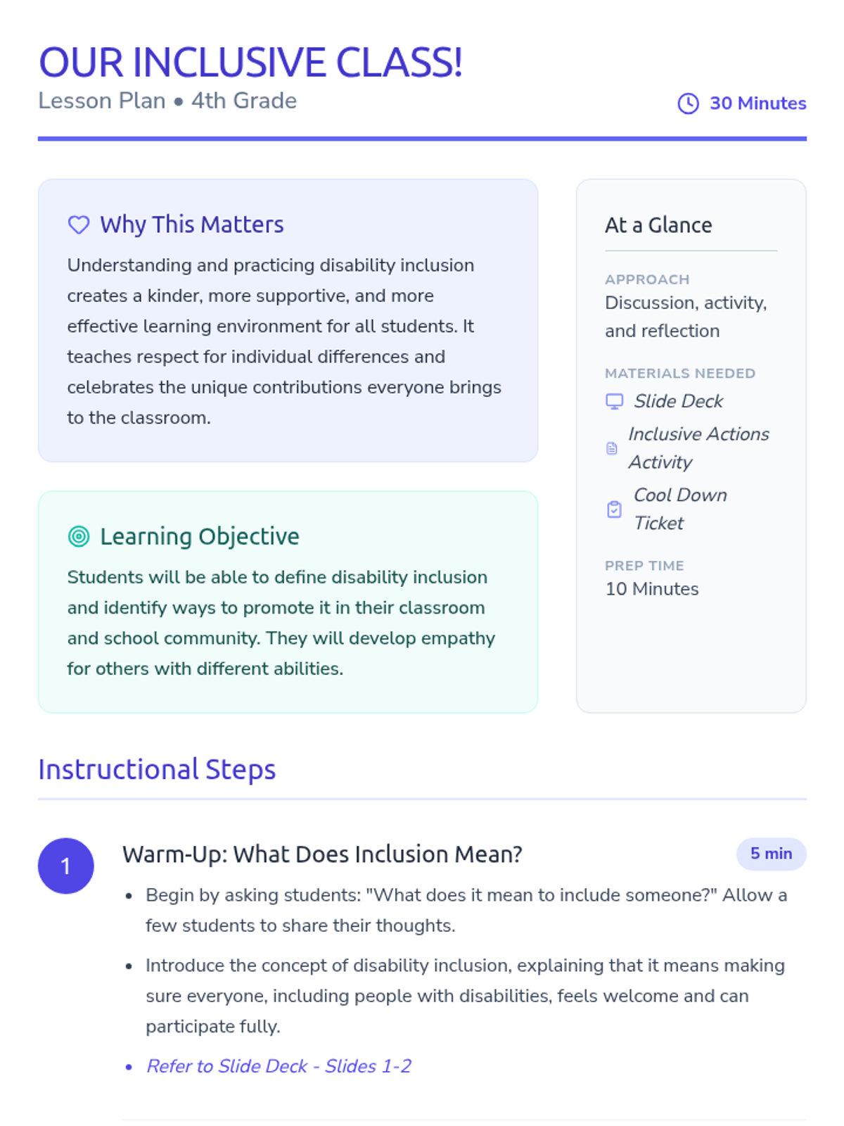 A 30-minute lesson for 4th graders to foster empathy and understanding of disability inclusion through discussion, brainstorming, and reflection.