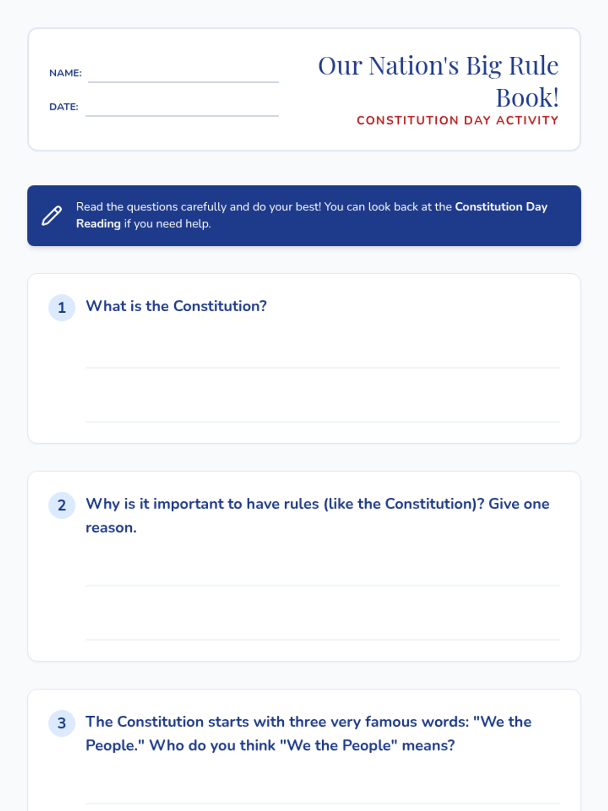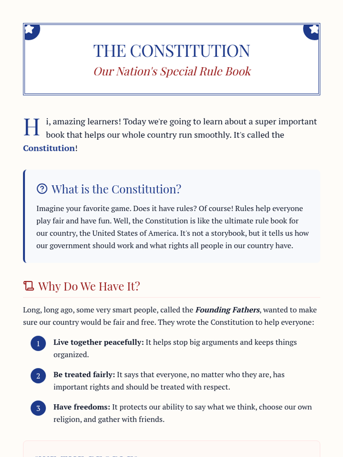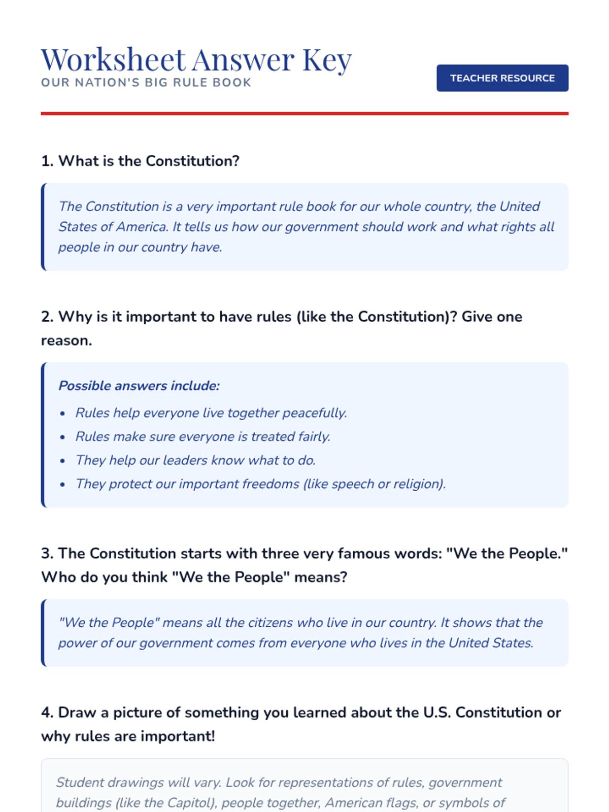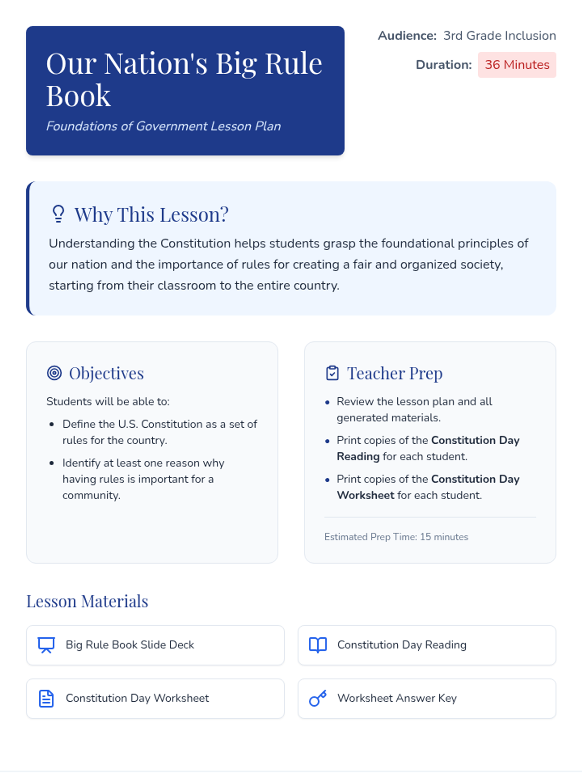 A 36-minute introductory lesson for 3rd-grade inclusion students that explores the U.S. Constitution as the nation's fundamental rule book through discussion, reading, and a guided worksheet.