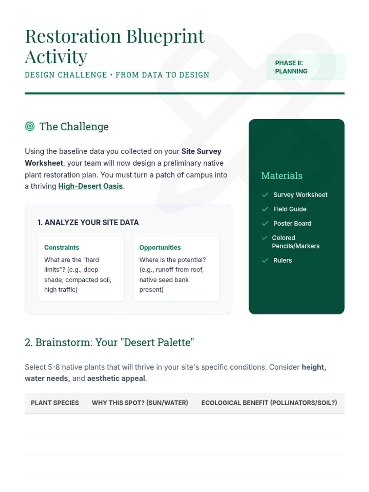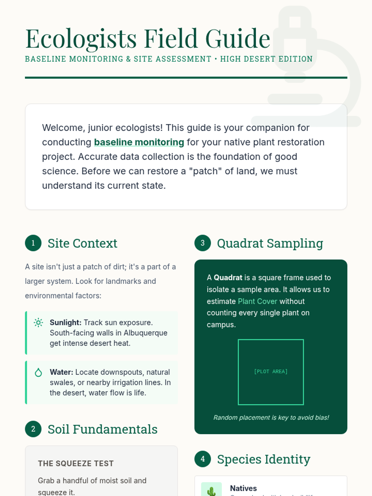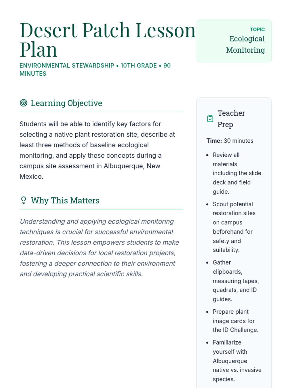 A 90-minute 10th-grade lesson where students explore their campus to identify restoration sites, learn ecological monitoring techniques, and collect baseline data in Albuquerque, New Mexico.
