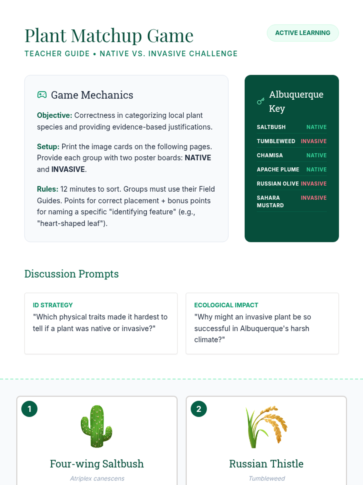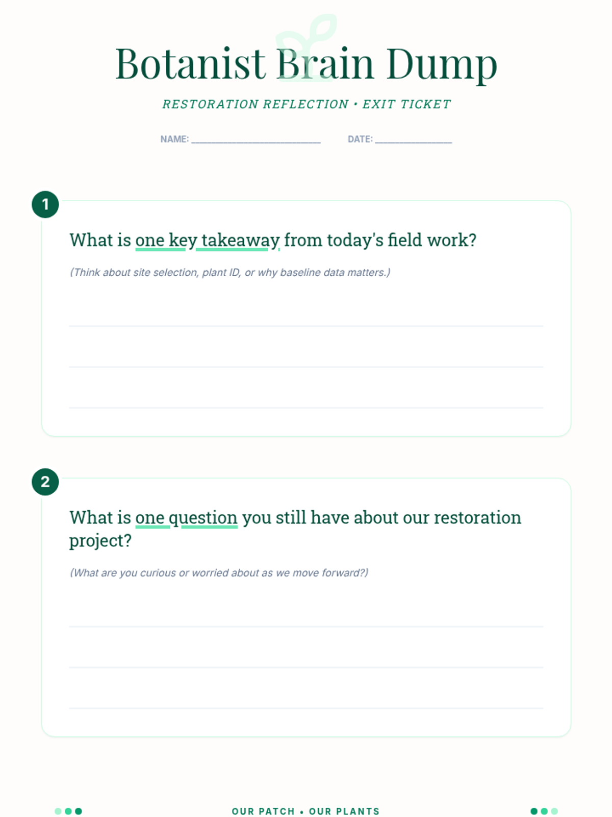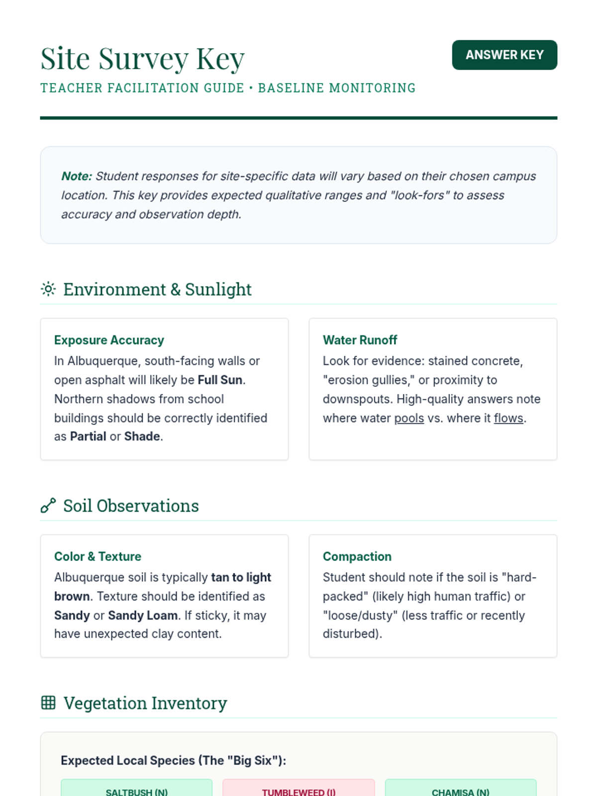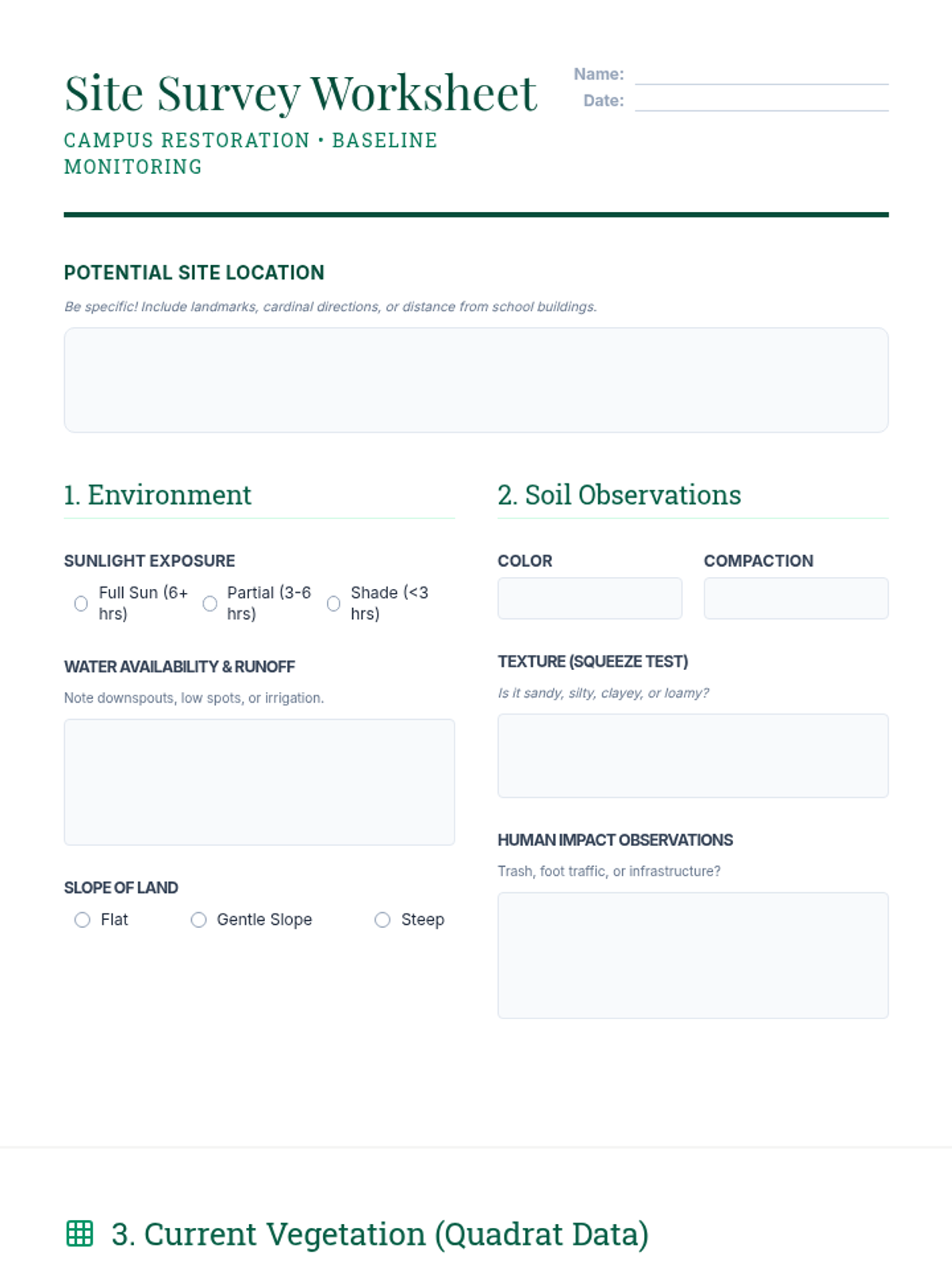 A 90-minute 10th-grade lesson where students explore their campus to identify restoration sites, learn ecological monitoring techniques, and collect baseline data in Albuquerque, New Mexico.