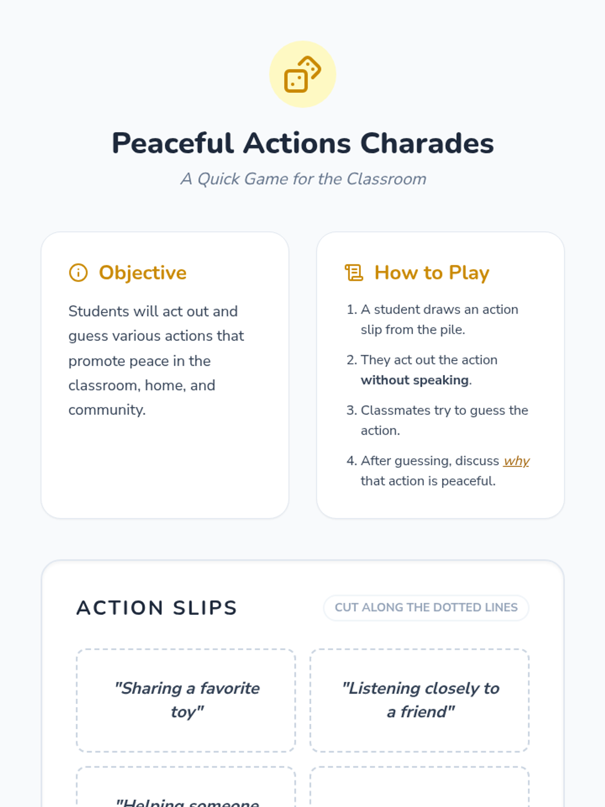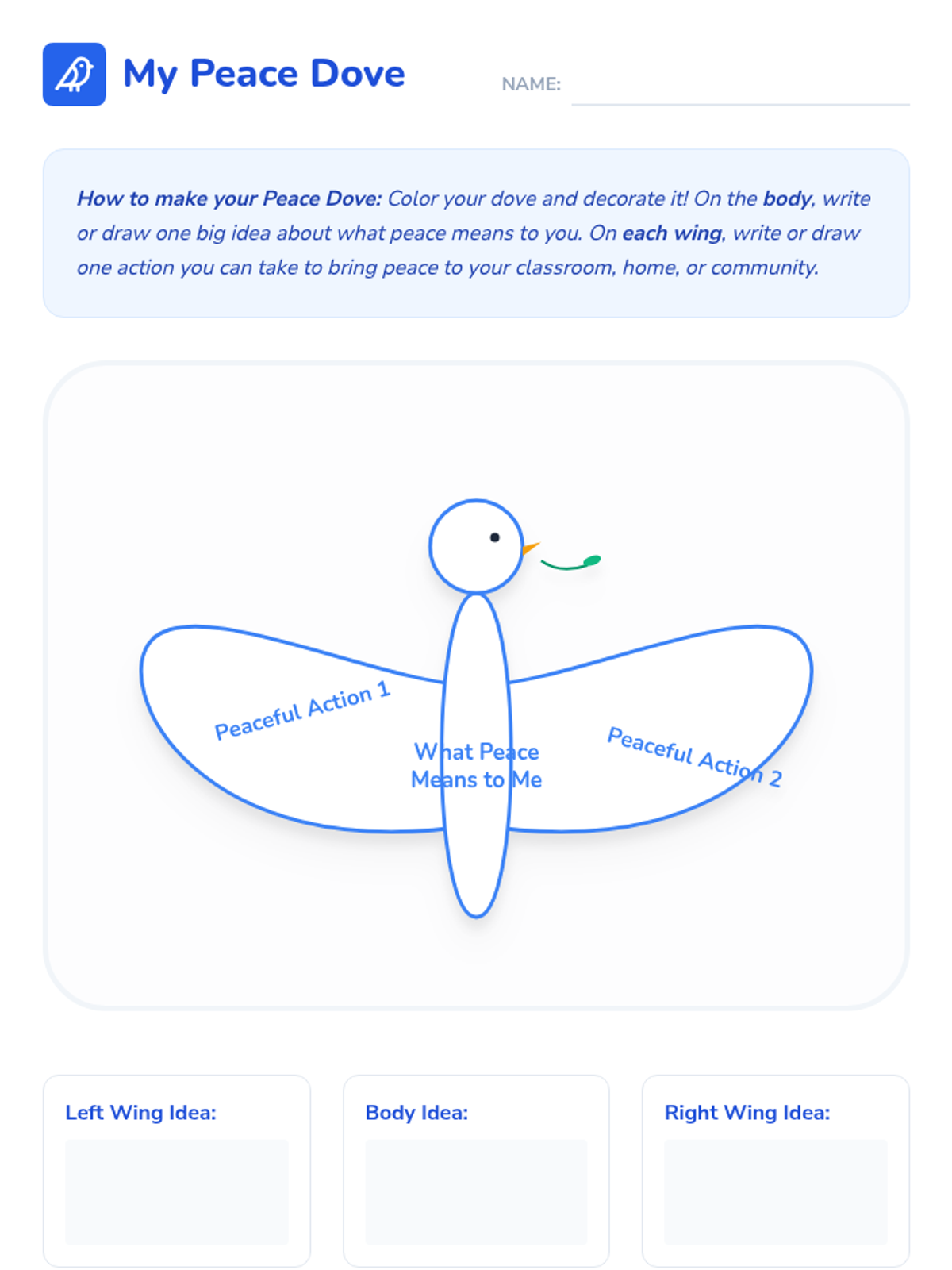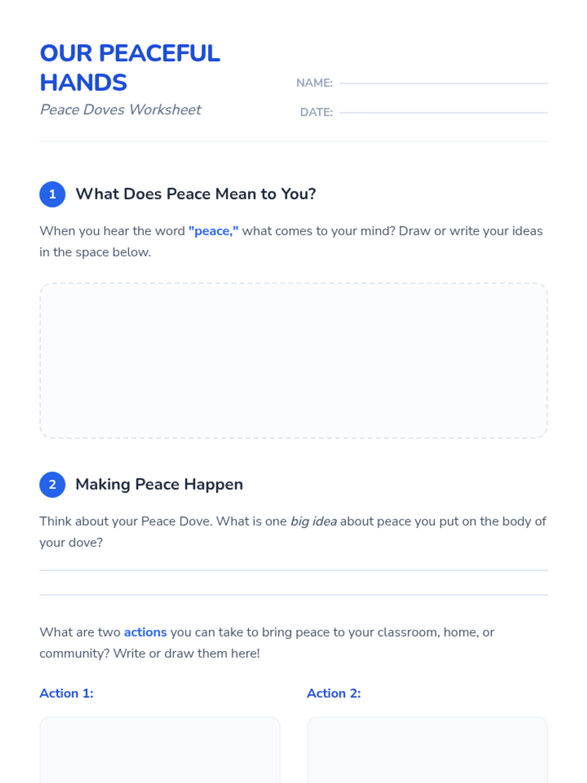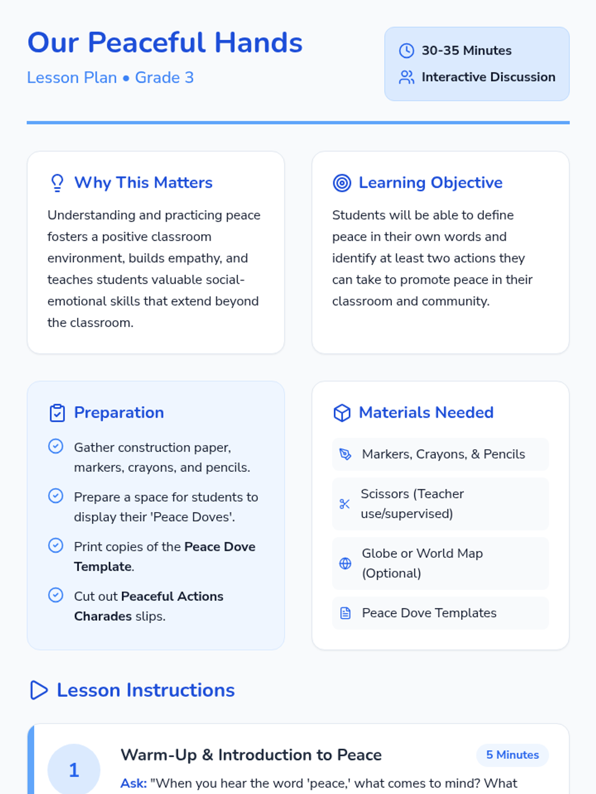 This lesson introduces third-grade students to the concept of Peace Day and encourages them to reflect on what peace means in their daily lives through discussion and a creative 'Peace Dove' activity.