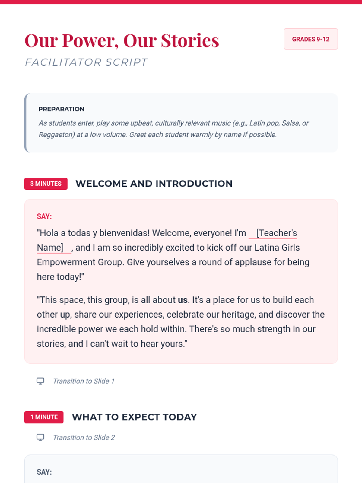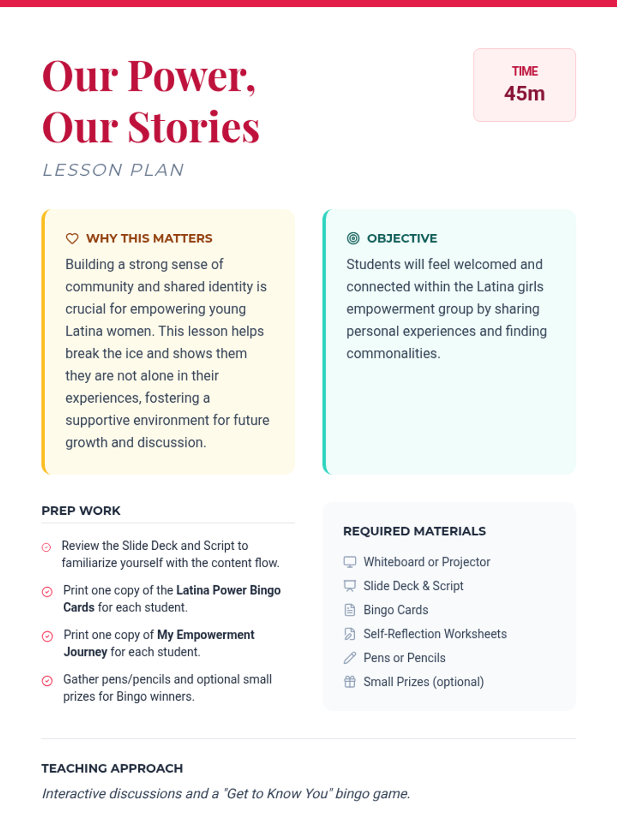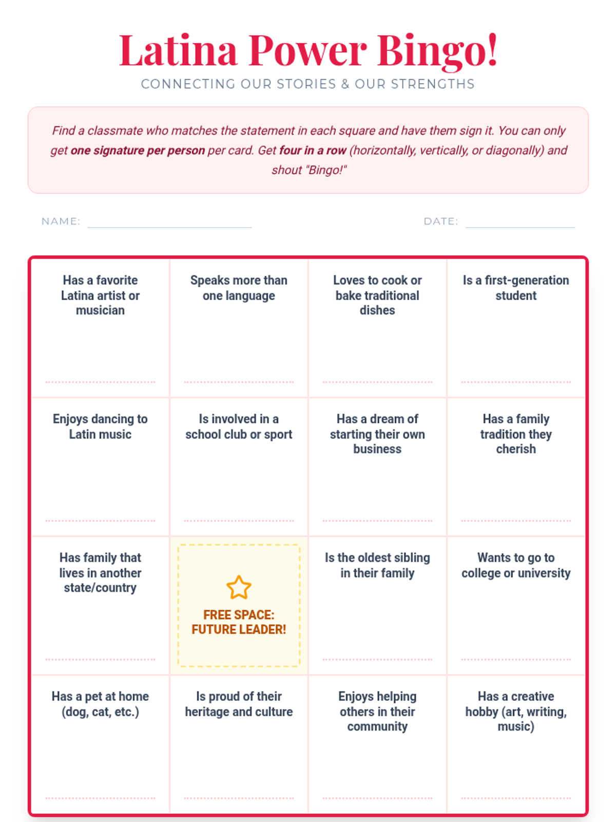 This lesson introduces members of a Latina girls empowerment group, fostering a sense of community and belonging through personal storytelling and an interactive bingo game. Students will explore shared identities and individual strengths to build a supportive group foundation.