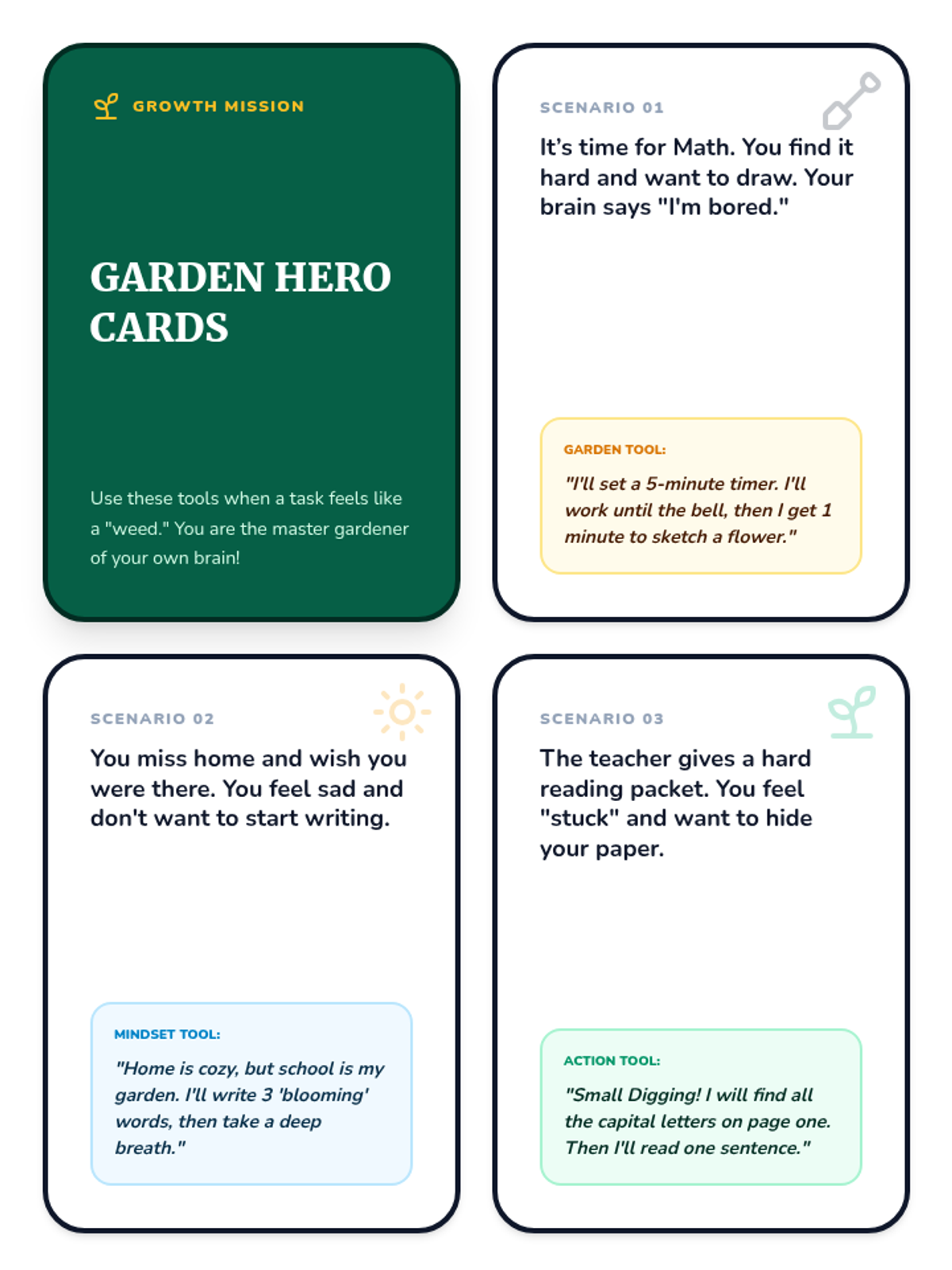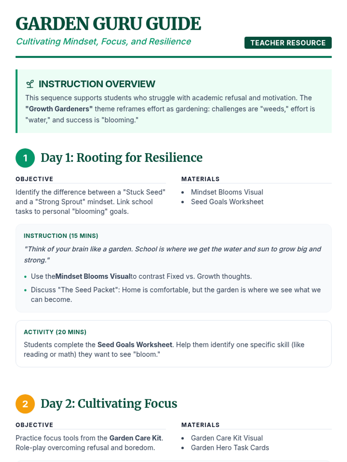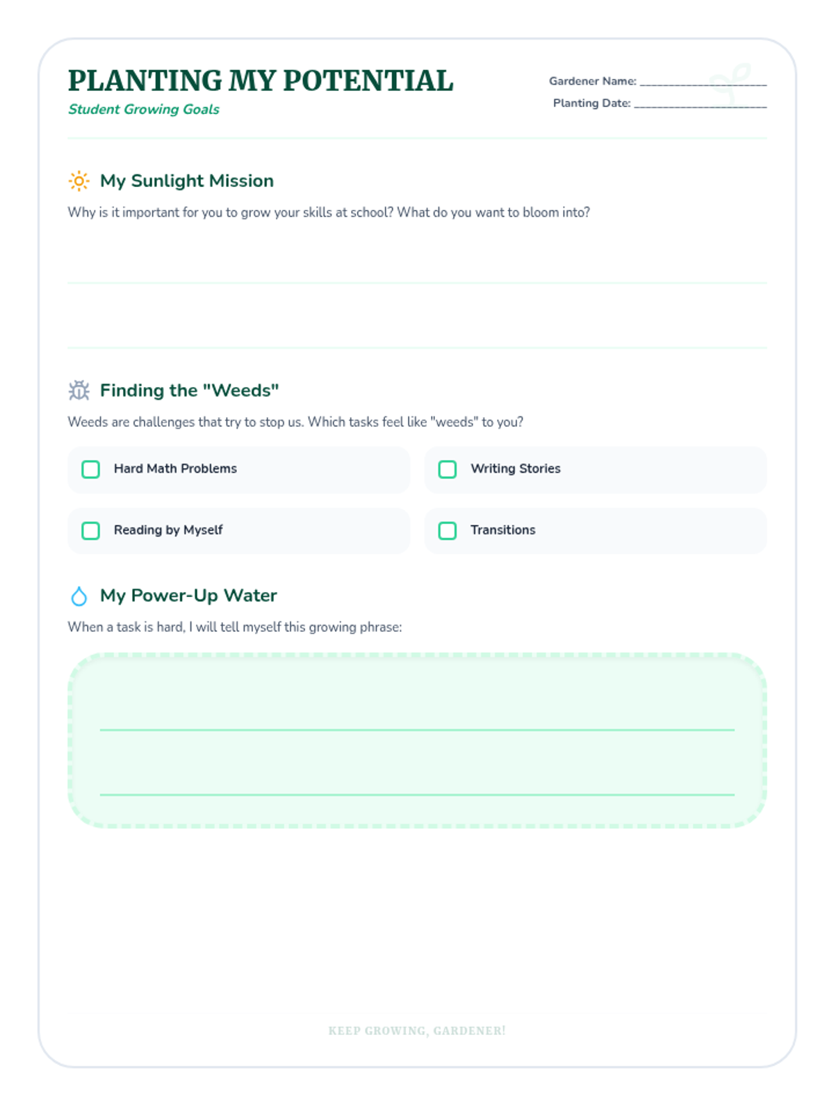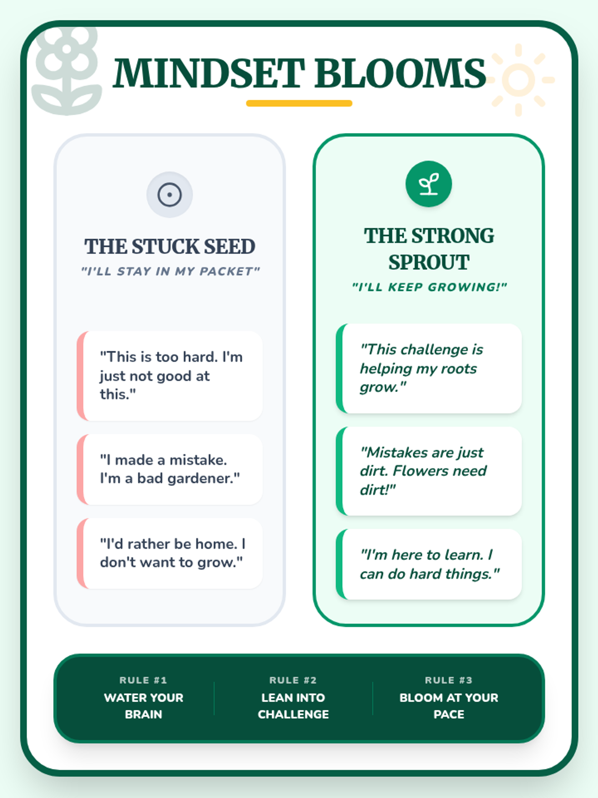 Introduction to growth mindset through the metaphor of gardening, helping students see that effort is the 'water' that helps their skills grow.