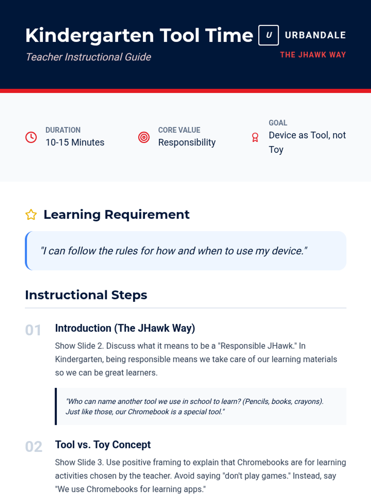 Reinforces the 'Tool not Toy' concept for 1st graders, emphasizing the JHawk Way of being Responsible with school technology.