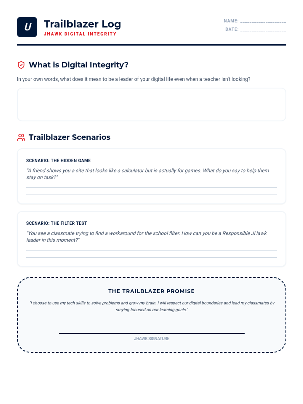 Empowers 5th graders to lead by example, discussing the importance of academic integrity and resisting the urge to bypass school filters.