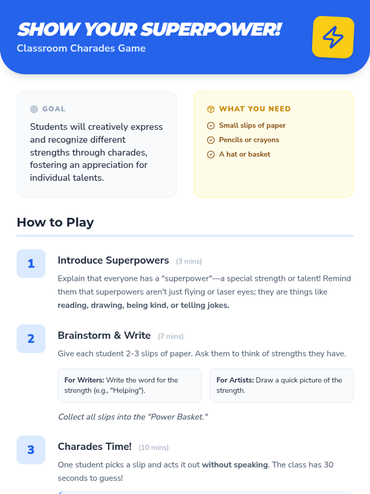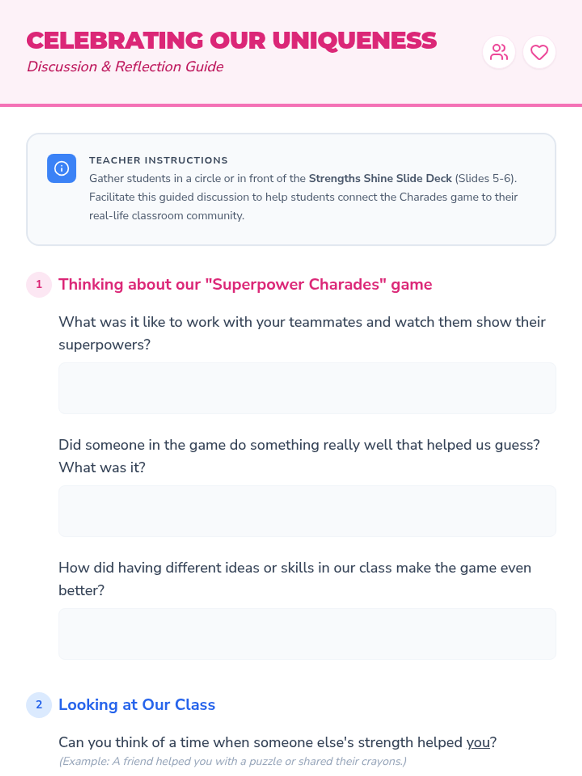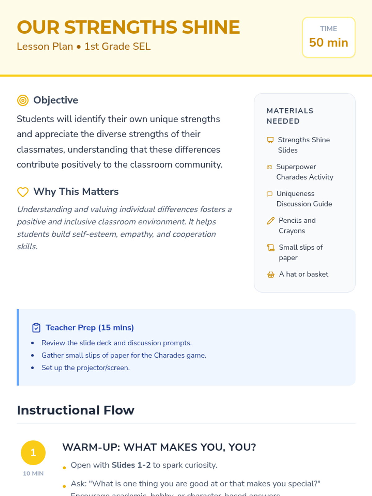 A 50-minute SEL lesson for 1st graders focused on identifying personal strengths and appreciating the unique qualities of others to build a stronger classroom community.