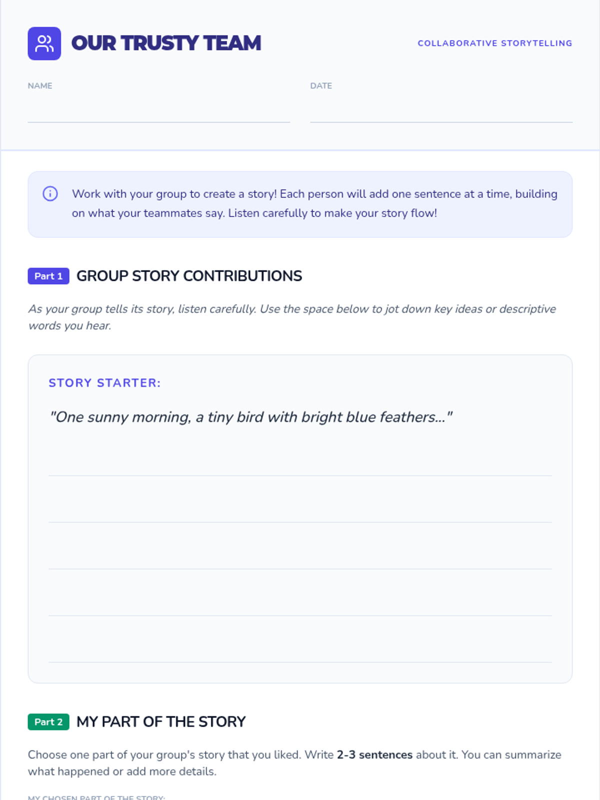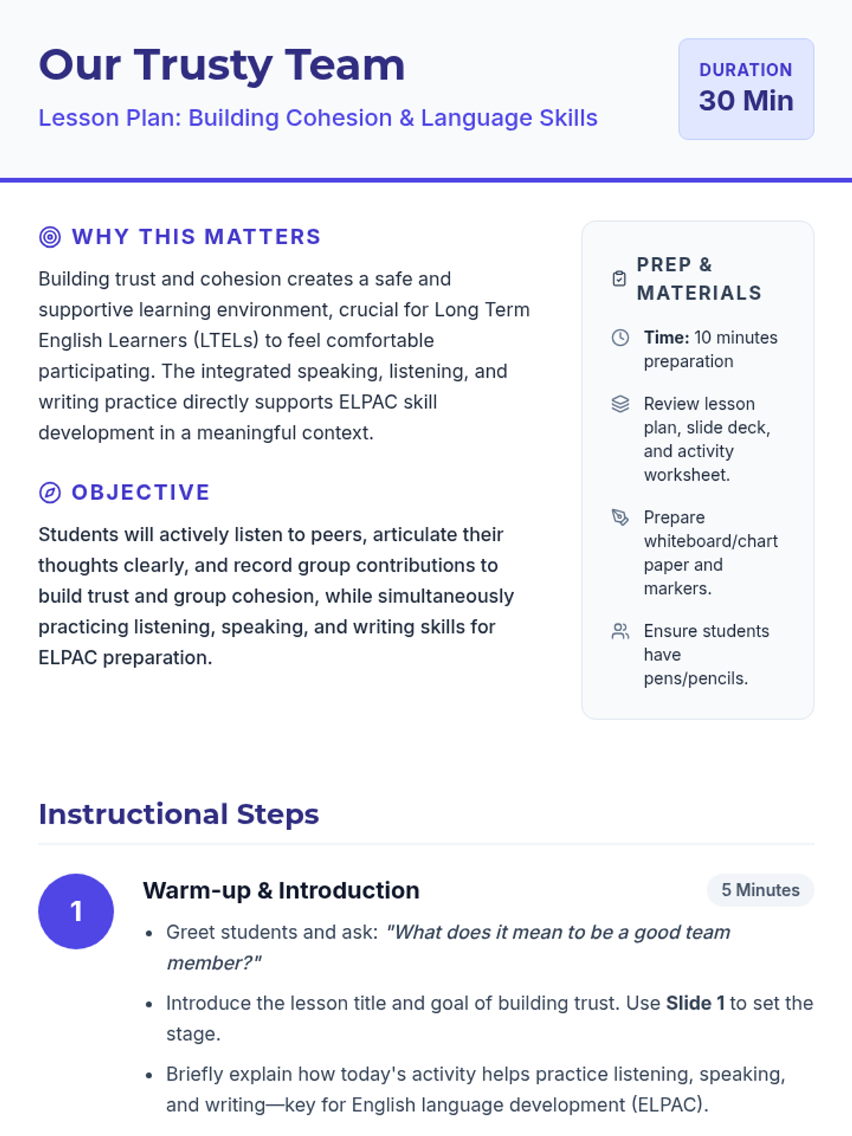 This lesson helps Long Term English Learners build trust and cohesion through collaborative storytelling and reflective writing, focusing on active listening and expressive speaking skills.