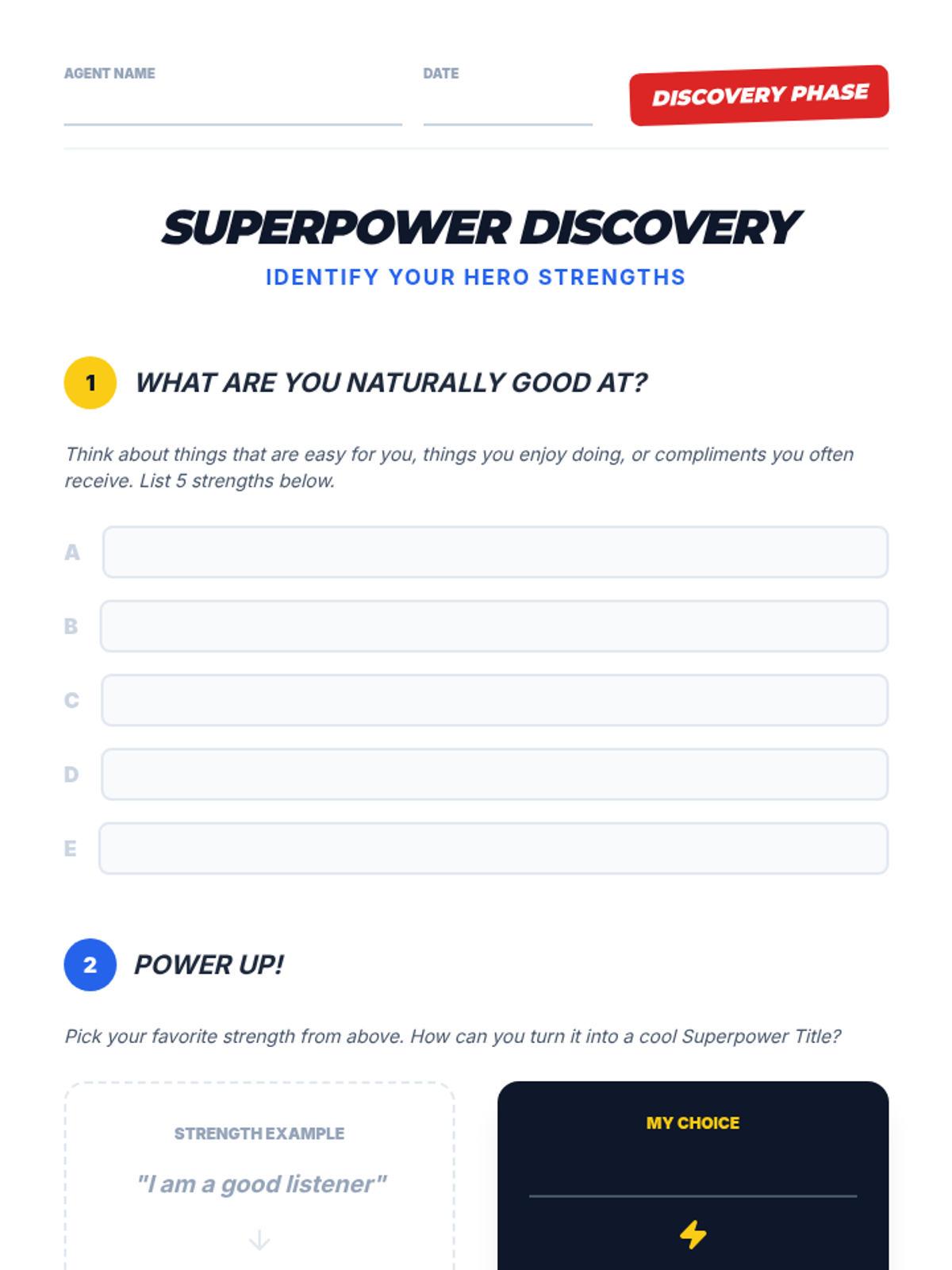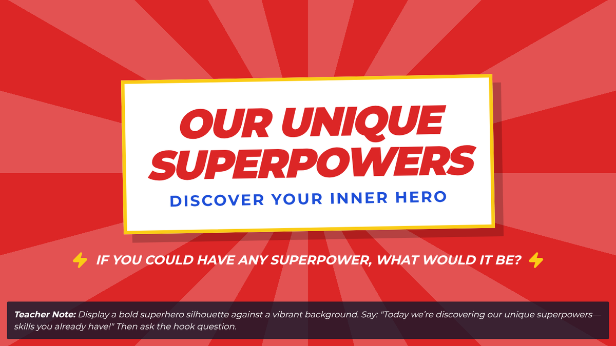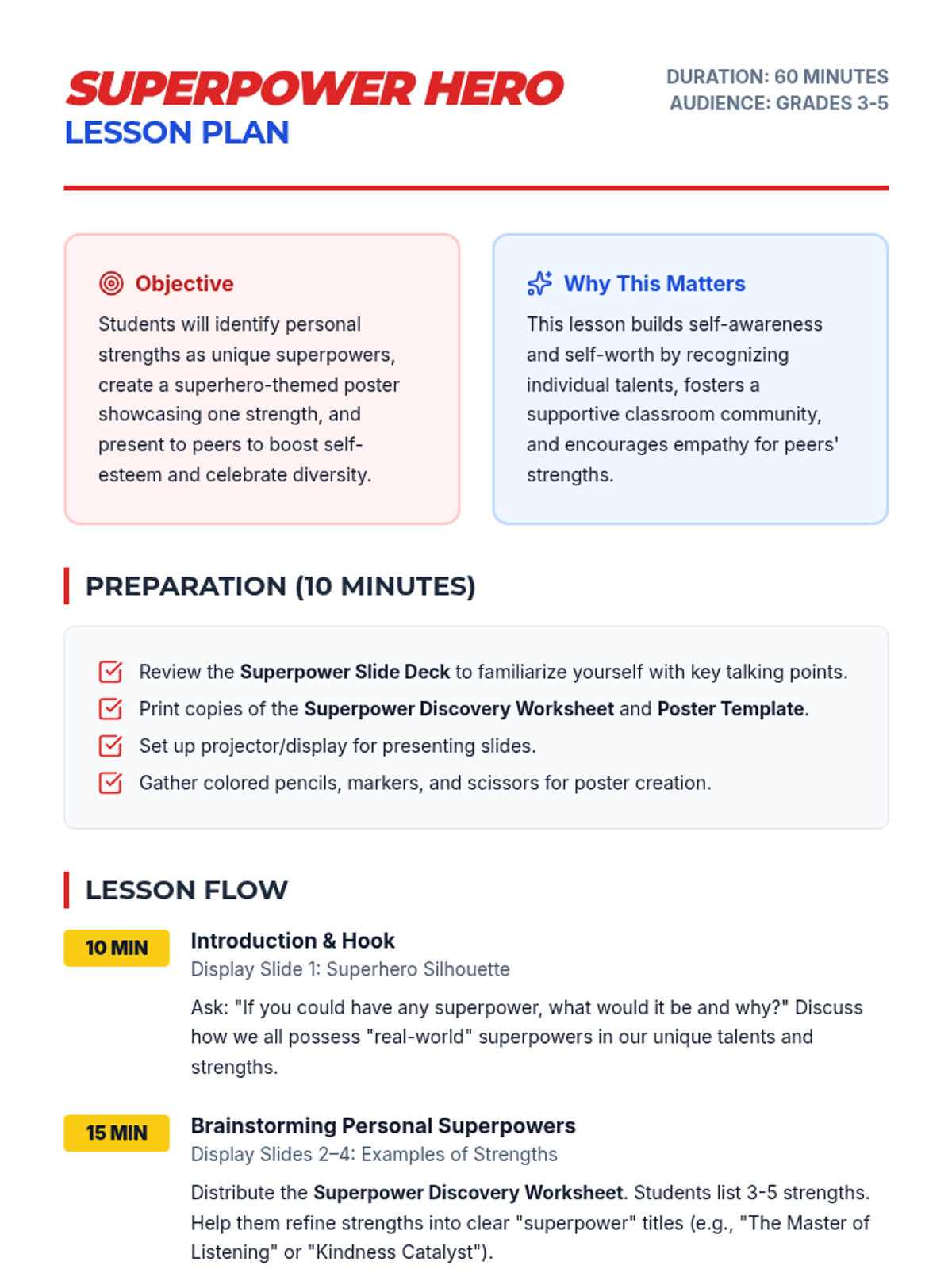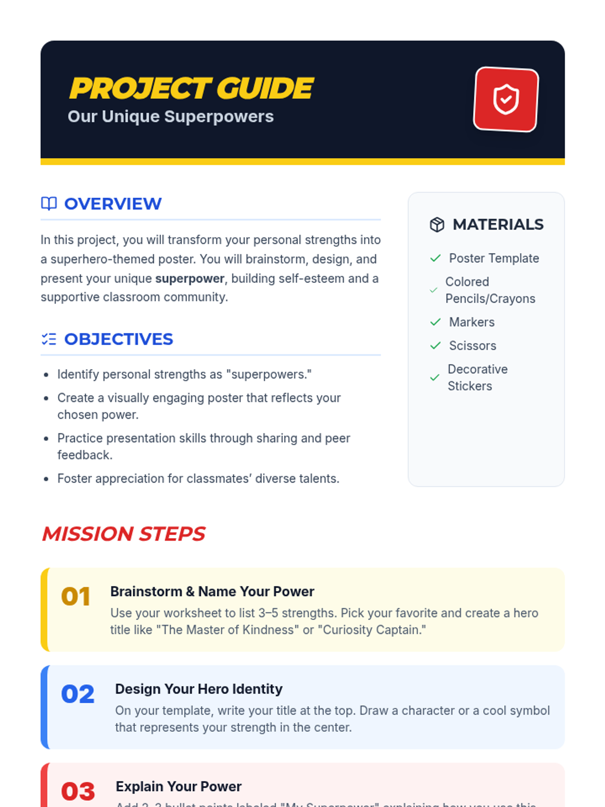 A 60-minute lesson for grades 3-5 that empowers students to identify and celebrate their personal strengths as unique 'superpowers' through creative project-based learning.