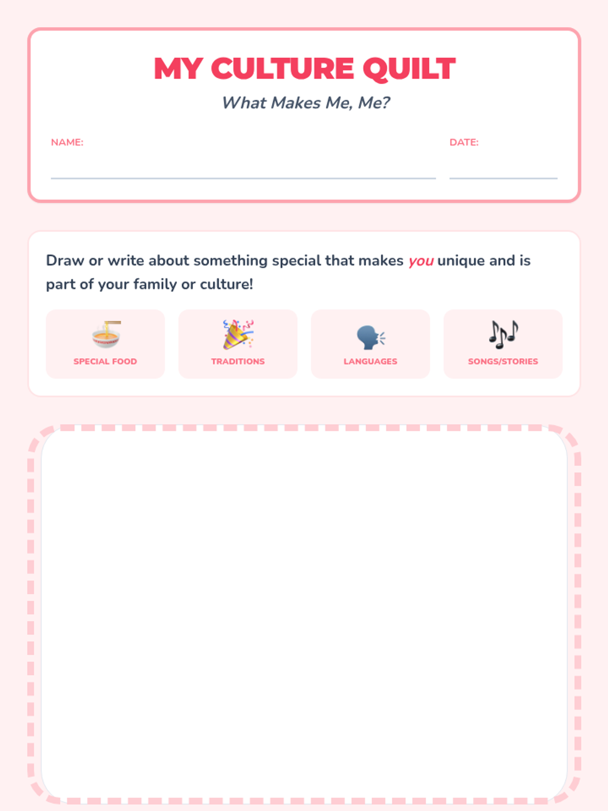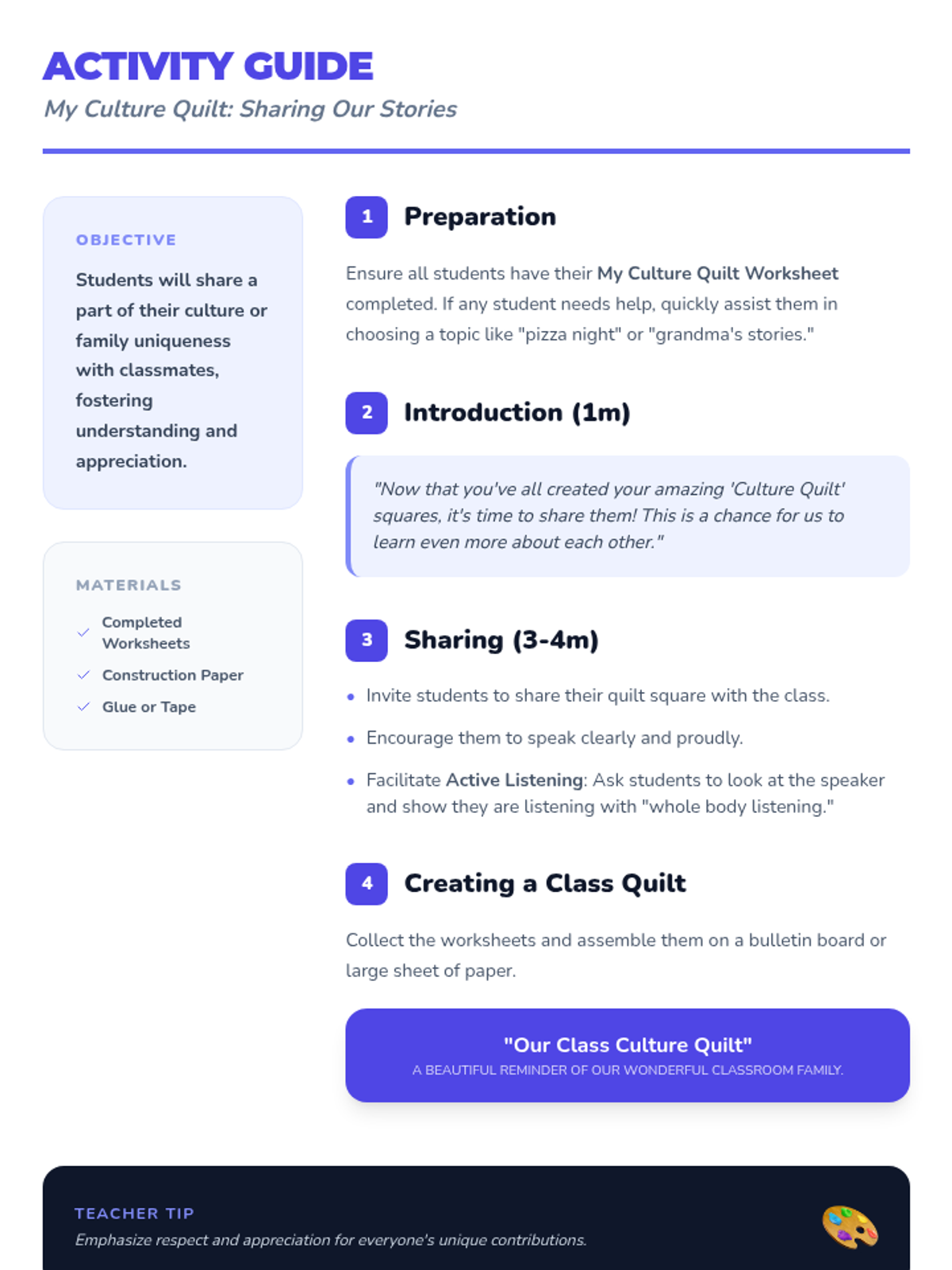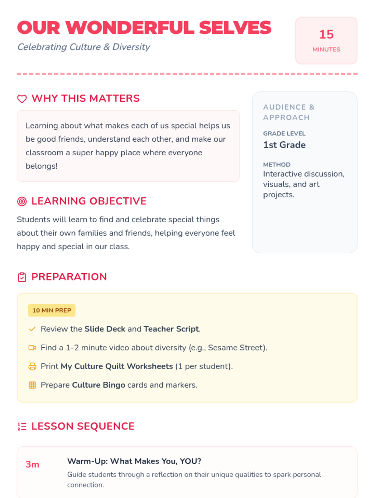 A heartfelt 15-minute lesson for 1st-grade students exploring culture and diversity through discussion, a short video, and a creative 'Culture Quilt' art project. Students celebrate their unique backgrounds and learn to appreciate the differences that make their classroom community strong.