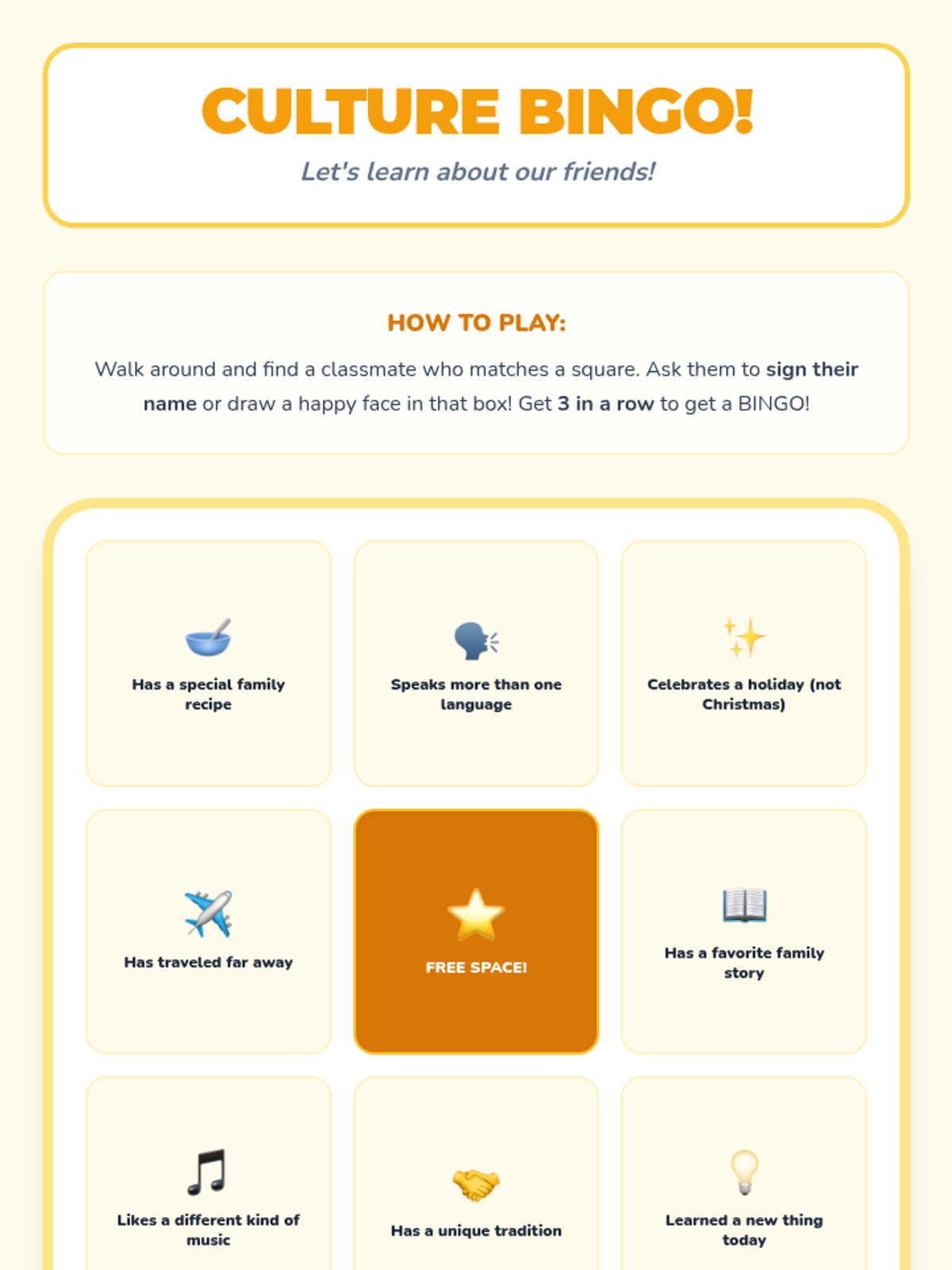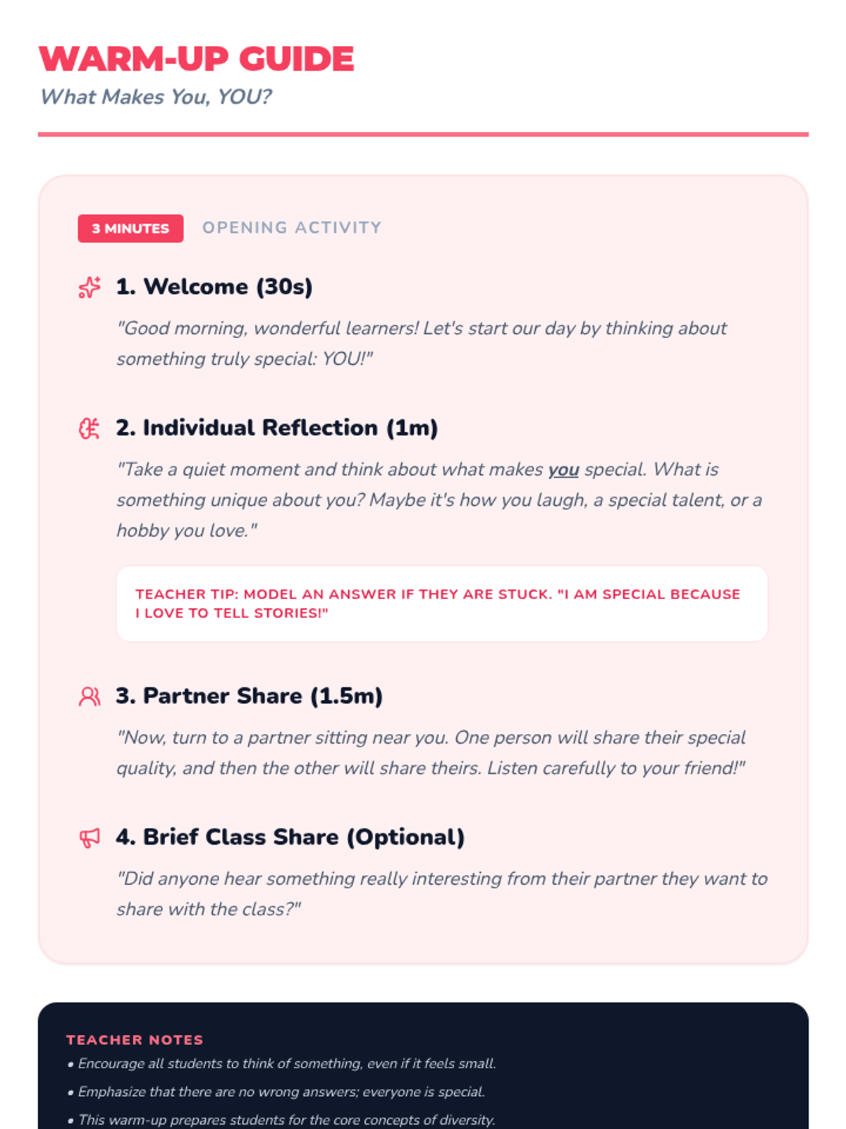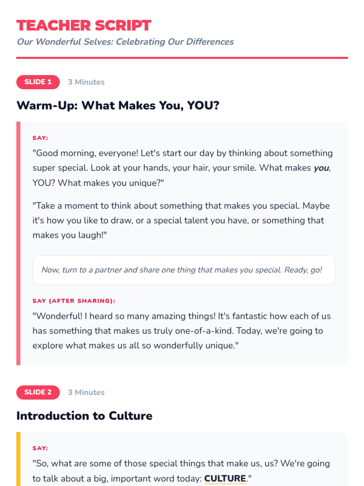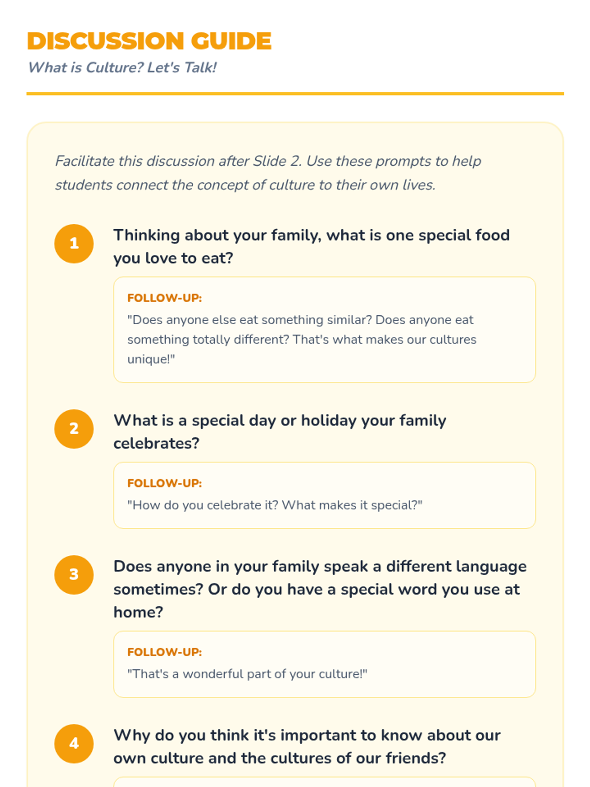 A heartfelt 15-minute lesson for 1st-grade students exploring culture and diversity through discussion, a short video, and a creative 'Culture Quilt' art project. Students celebrate their unique backgrounds and learn to appreciate the differences that make their classroom community strong.