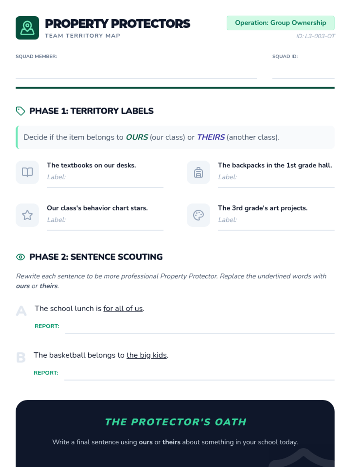 The class looks at shared property. Students categorize items that belong to the whole class ('ours') versus items that belong to another class or group ('theirs'), reinforcing plural possession.