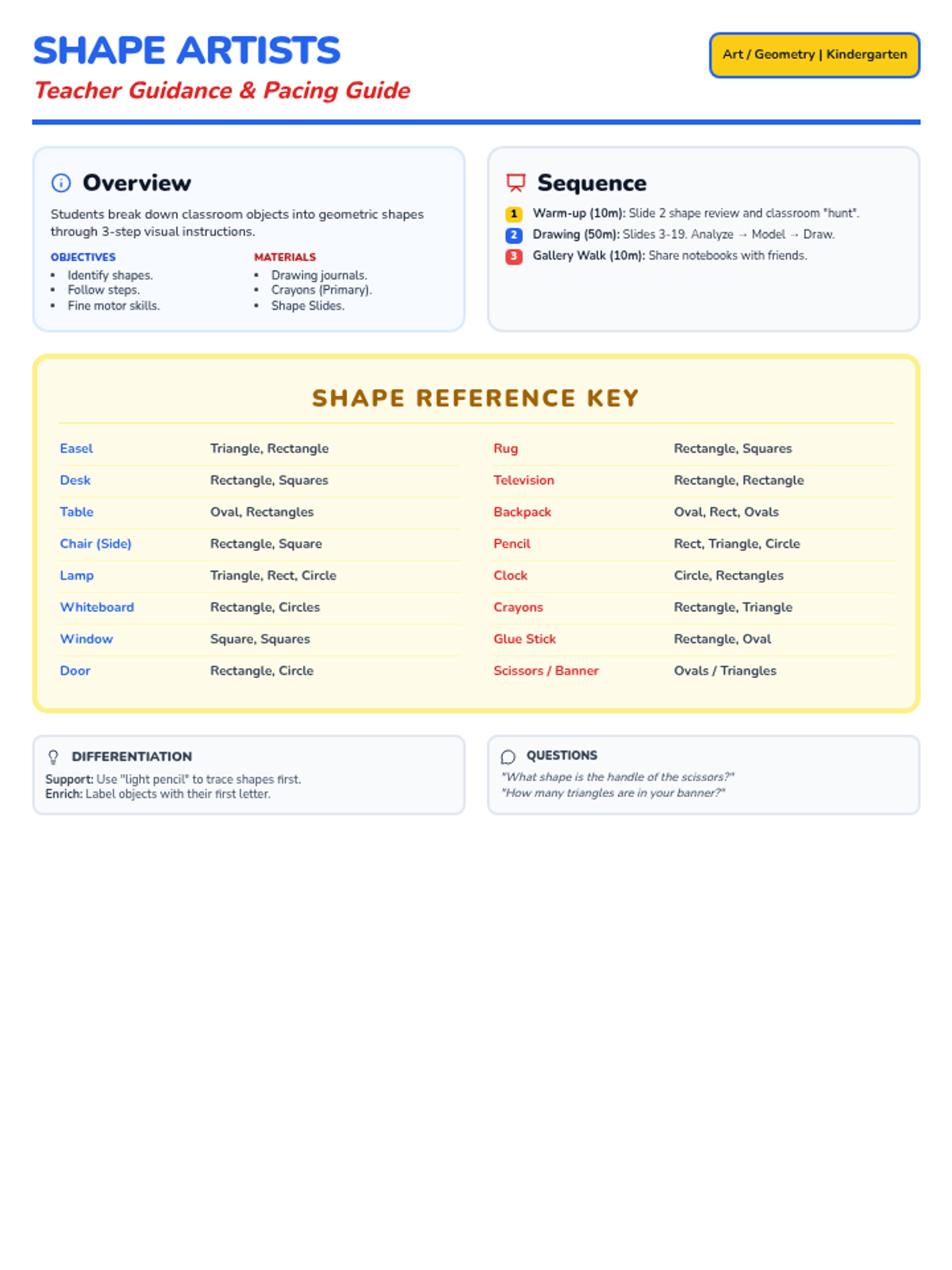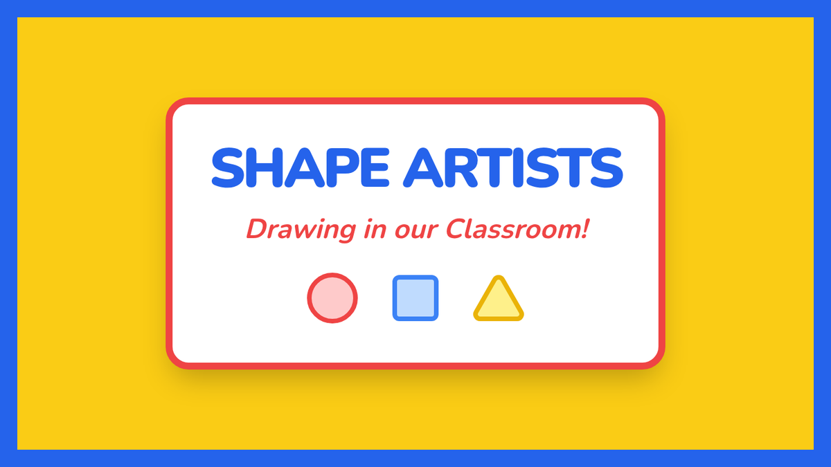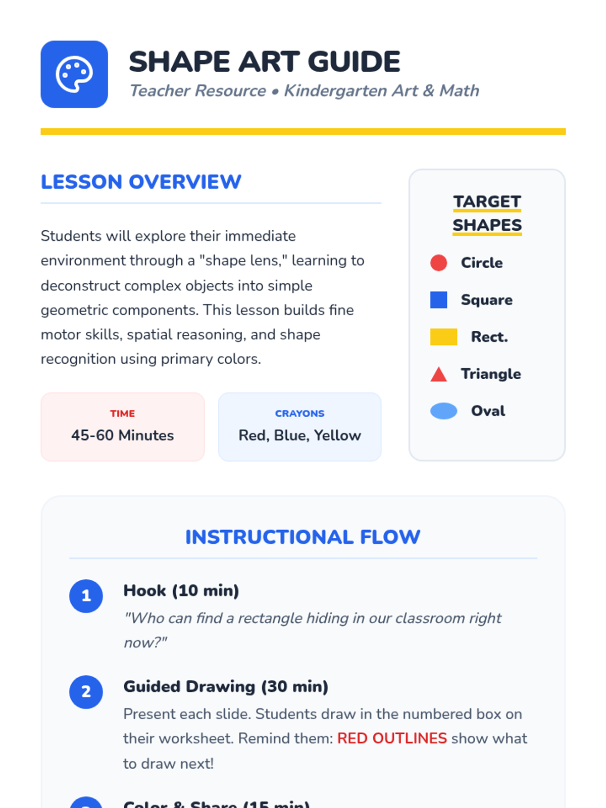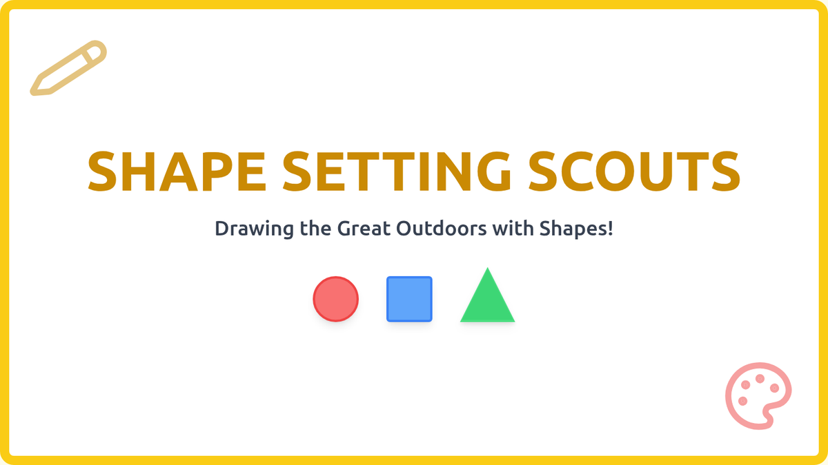A kindergarten lesson focused on identifying and using basic geometric shapes (circle, square, triangle, rectangle, oval) to draw familiar outdoor objects. Students follow three-step visual guides to build their artistic confidence through shape recognition.
