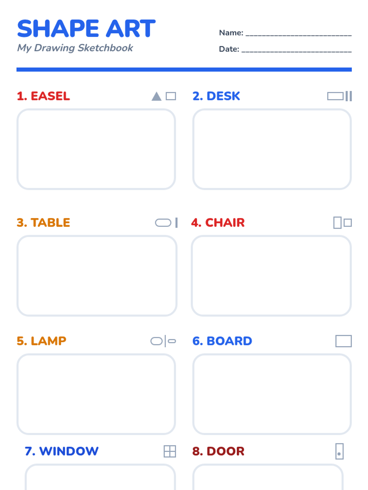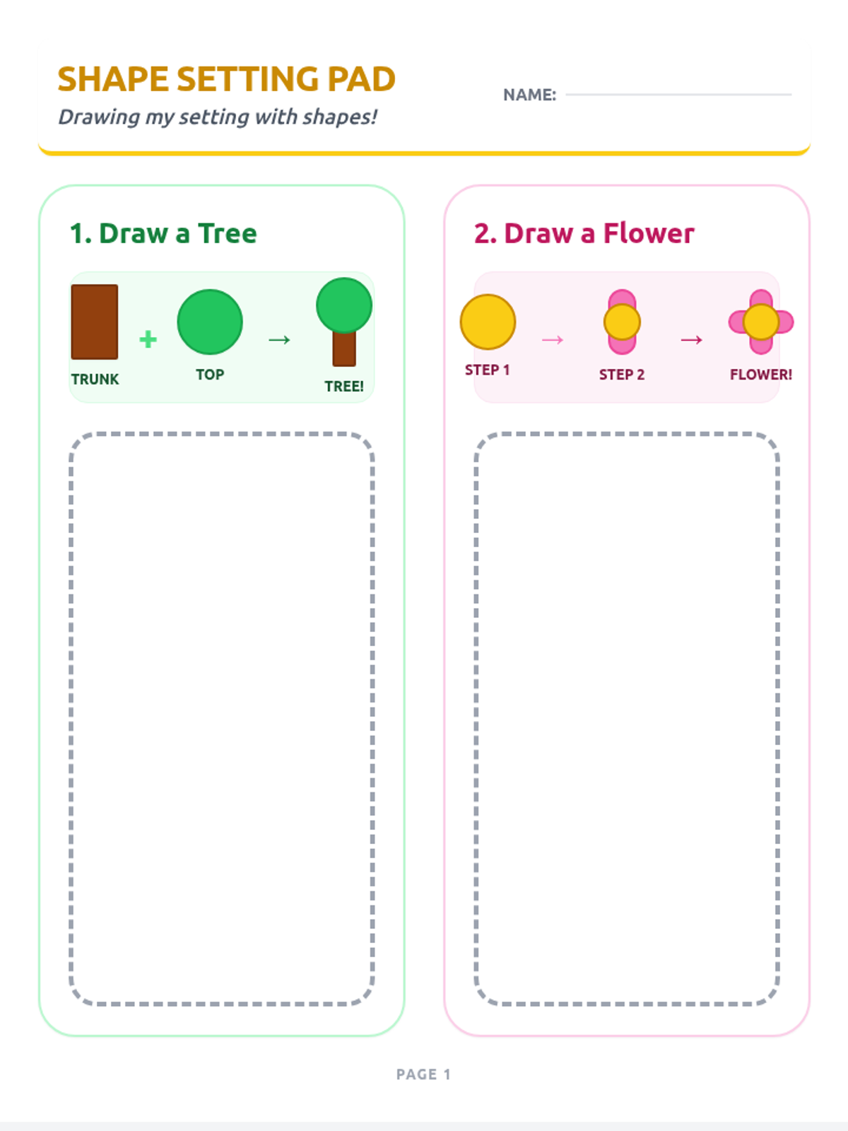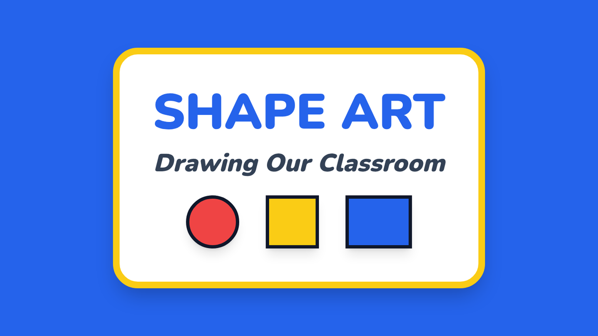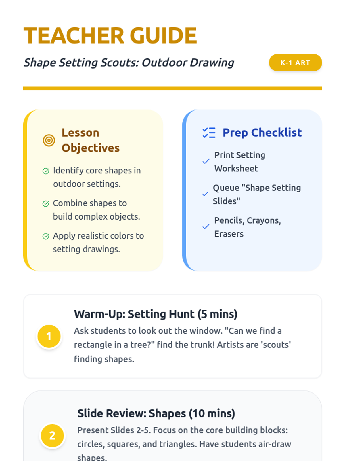 A kindergarten lesson focused on identifying and using basic geometric shapes (circle, square, triangle, rectangle, oval) to draw familiar outdoor objects. Students follow three-step visual guides to build their artistic confidence through shape recognition.