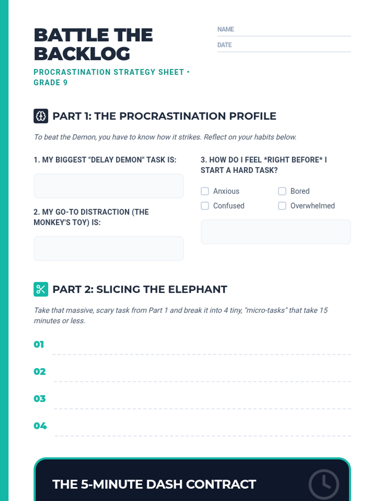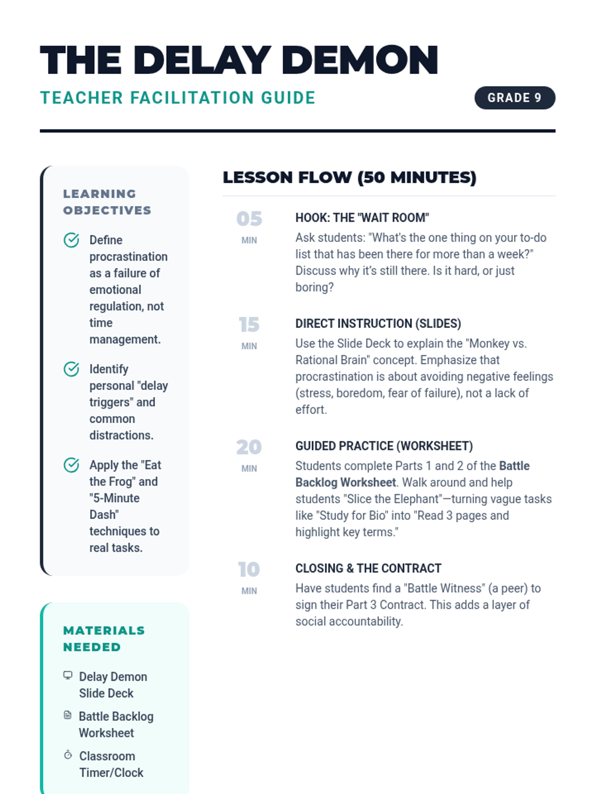 A comprehensive lesson for 9th graders that explores the psychology of procrastination and provides actionable strategies to overcome it.