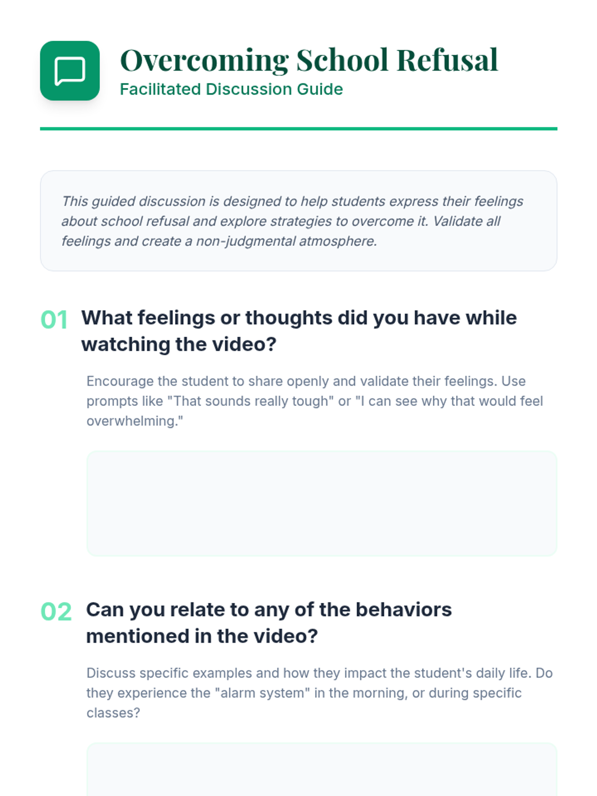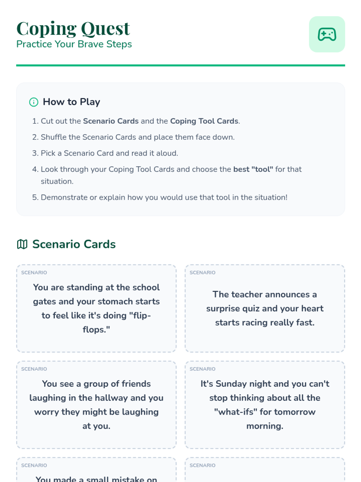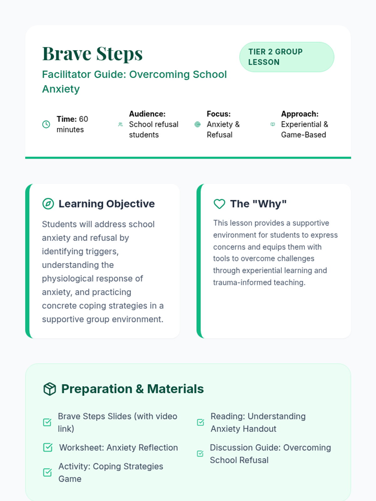 A Tier 2 group lesson designed for students experiencing school anxiety and refusal. It uses experiential and game-based learning to explore feelings, identify triggers, and practice coping strategies in a supportive environment.