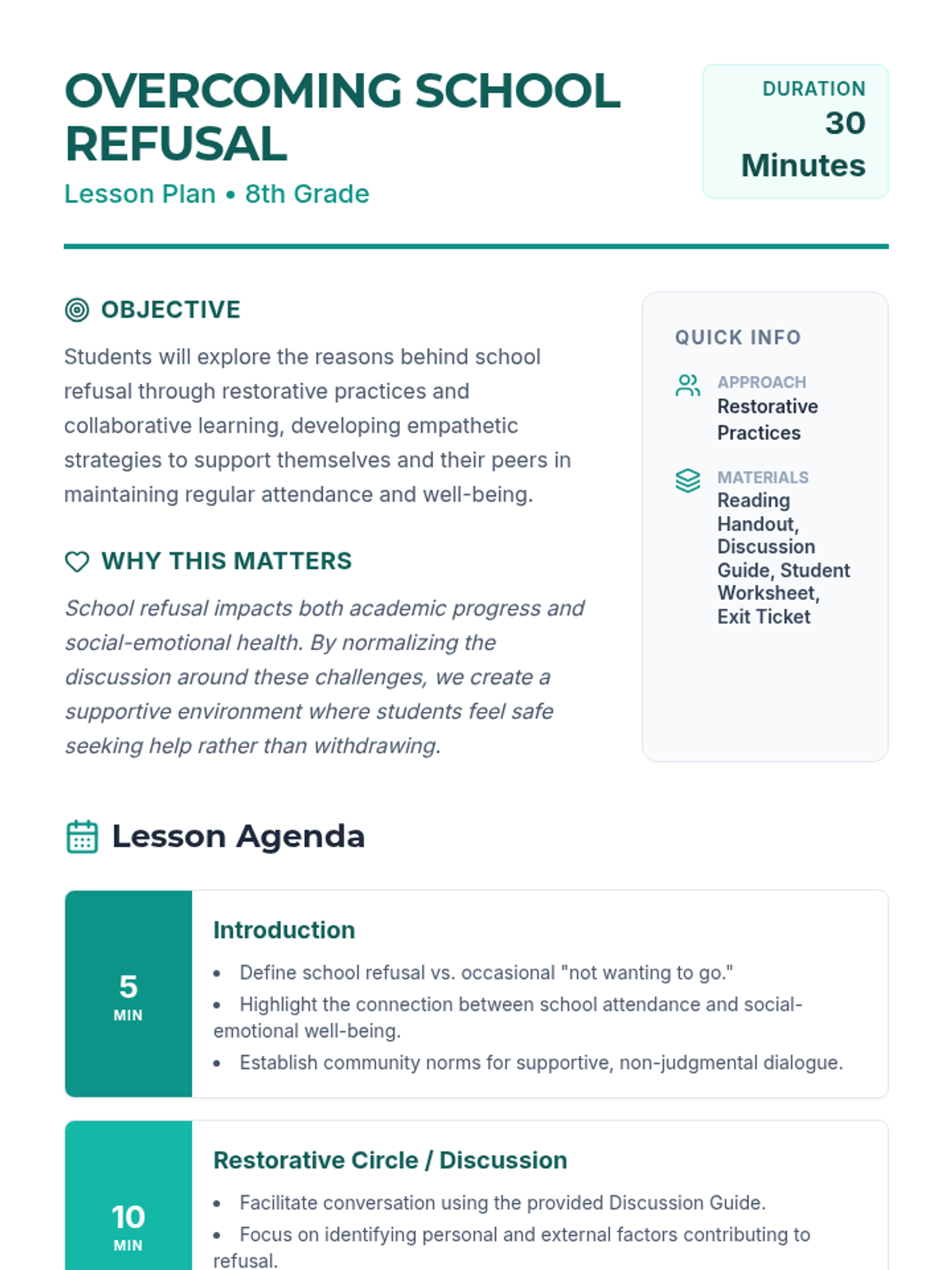 This restorative-focused lesson for 8th graders explores the causes of school refusal and equips students with collaborative strategies and support systems to overcome it.