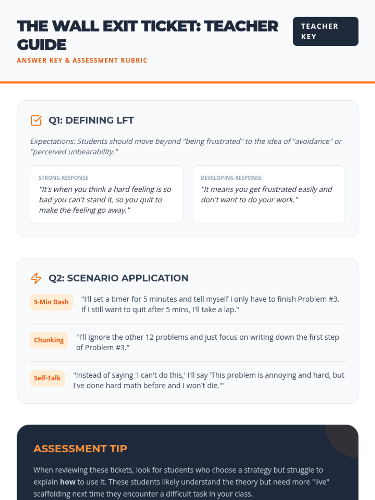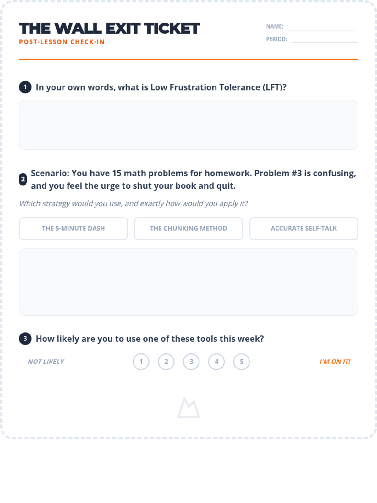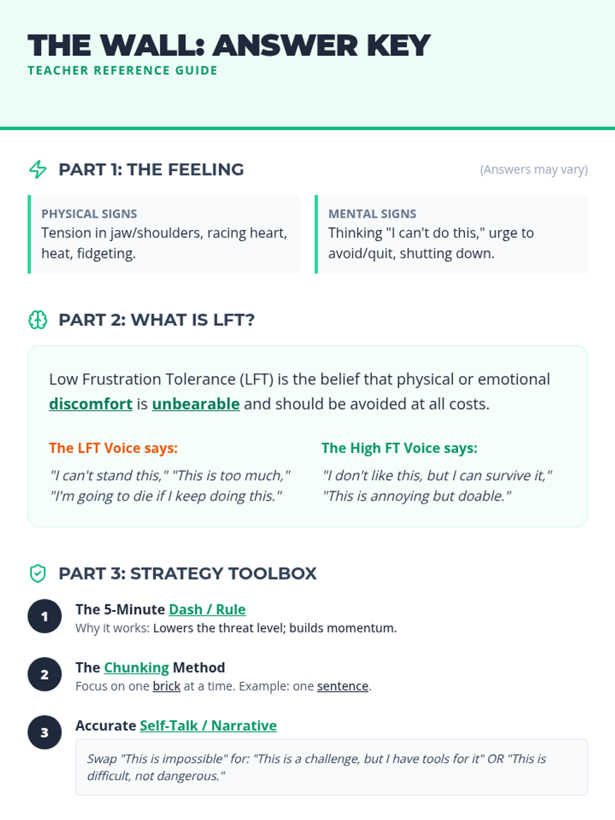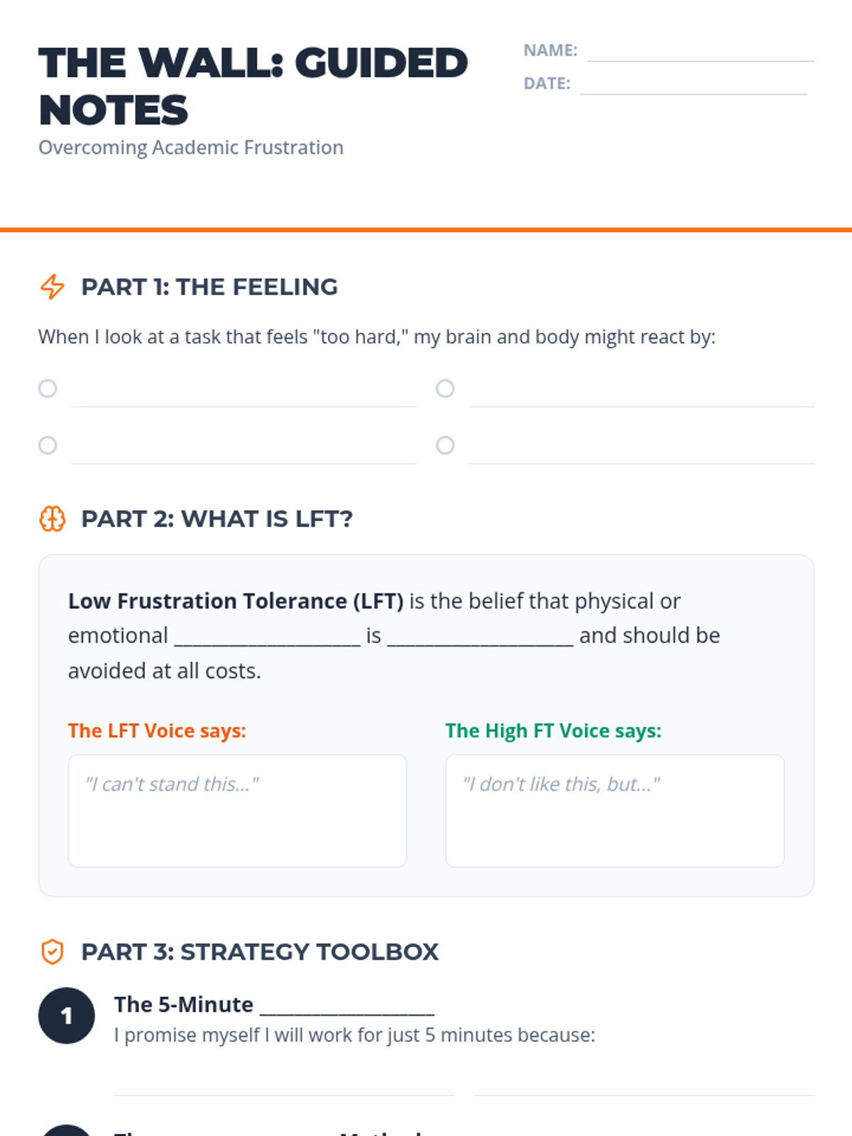 A lesson for junior high students on identifying and overcoming Low Frustration Tolerance (LFT) in academic settings, focusing on strategies to push through difficult tasks.