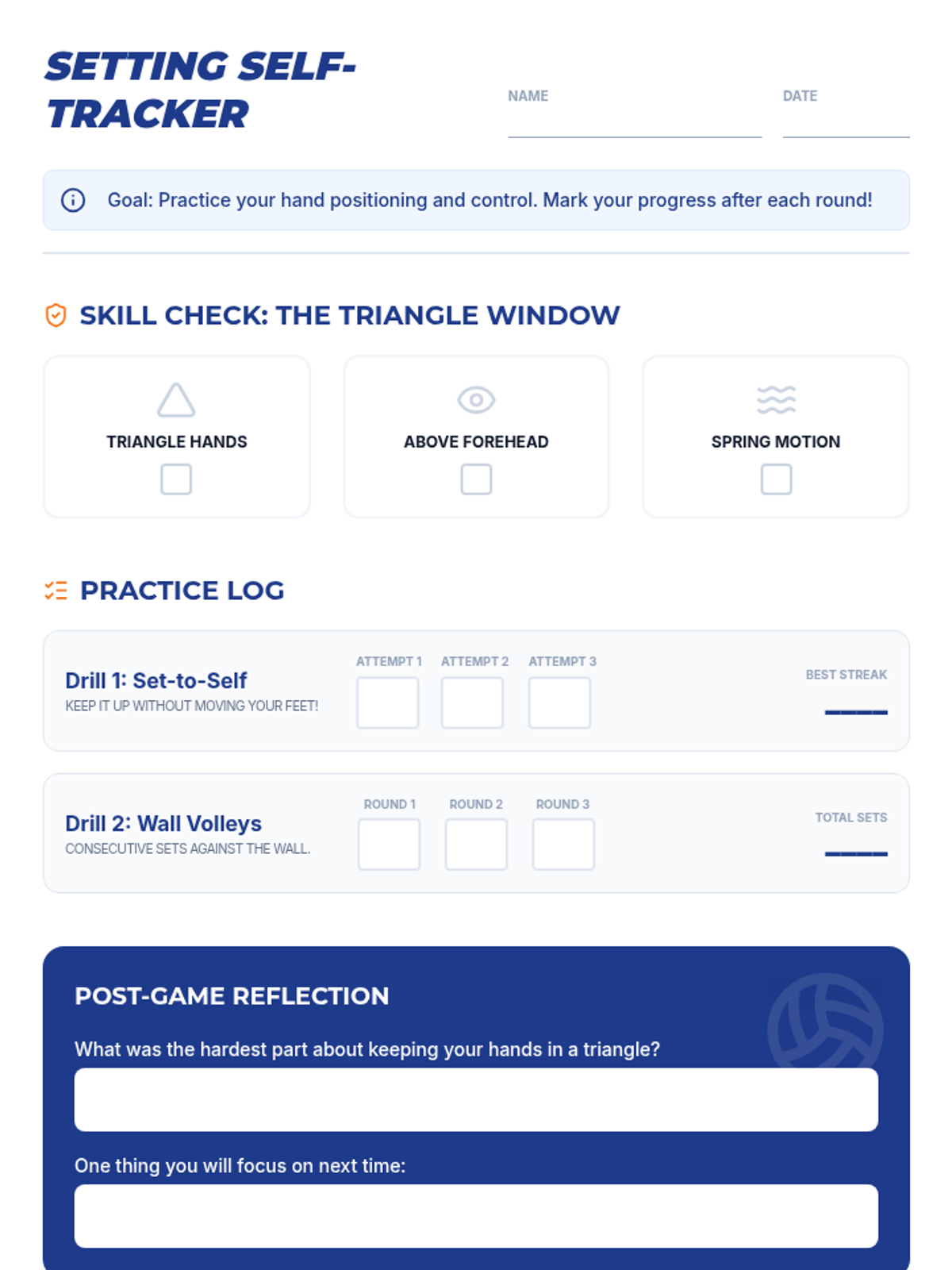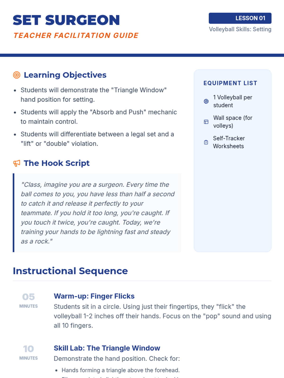 Students learn the triangle hand position and the absorption-and-push motion required for a legal set. Activities include setting to self and setting to a wall to build finger strength and consistency.