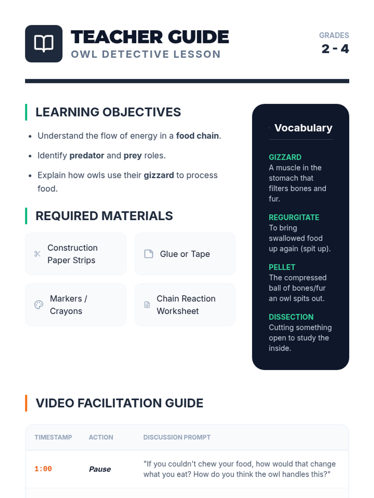 Students will explore food chains and predator/prey relationships through the lens of owl biology, using a video about owl pellets as a primary source for understanding what owls eat and how they digest it.