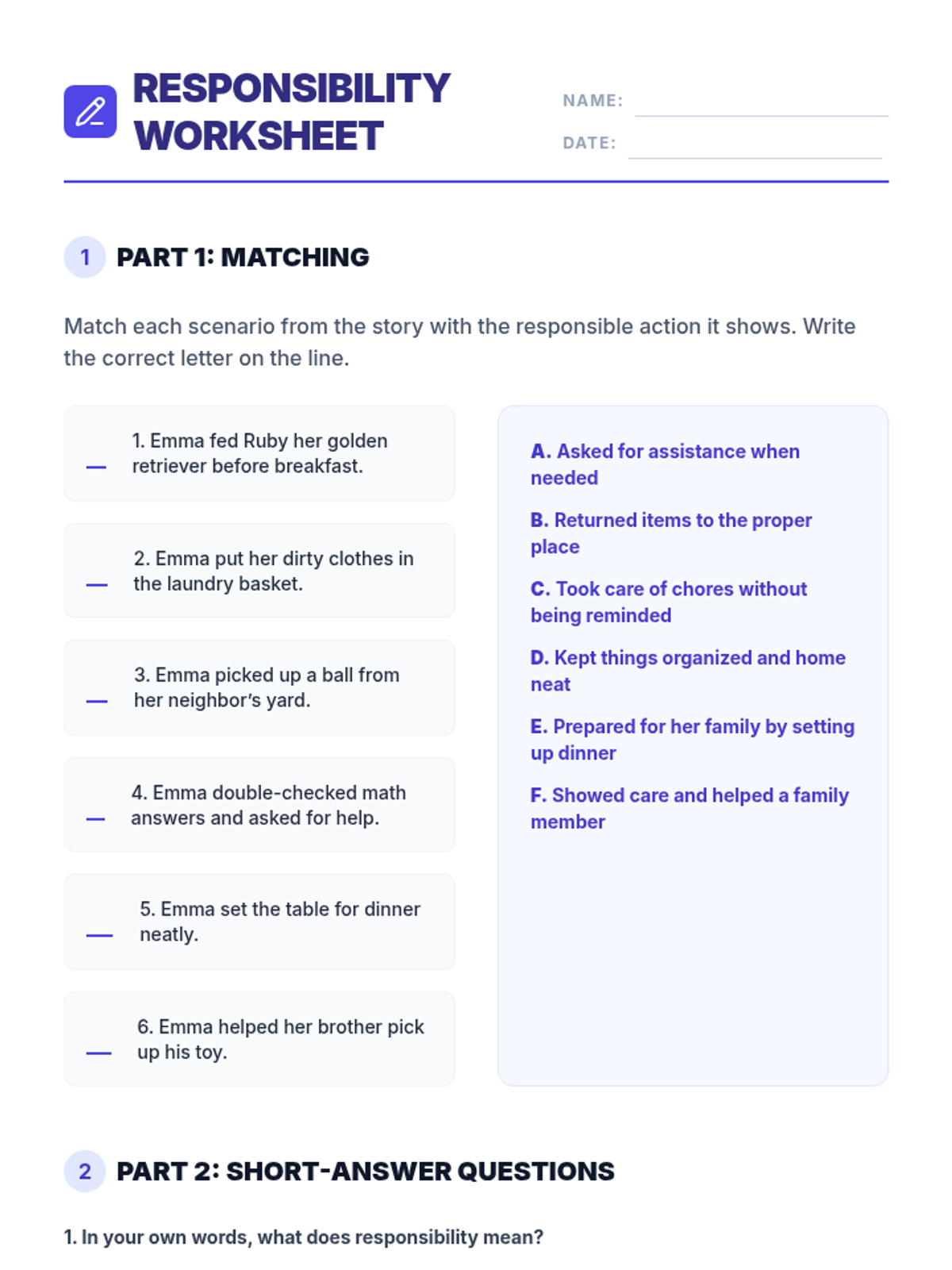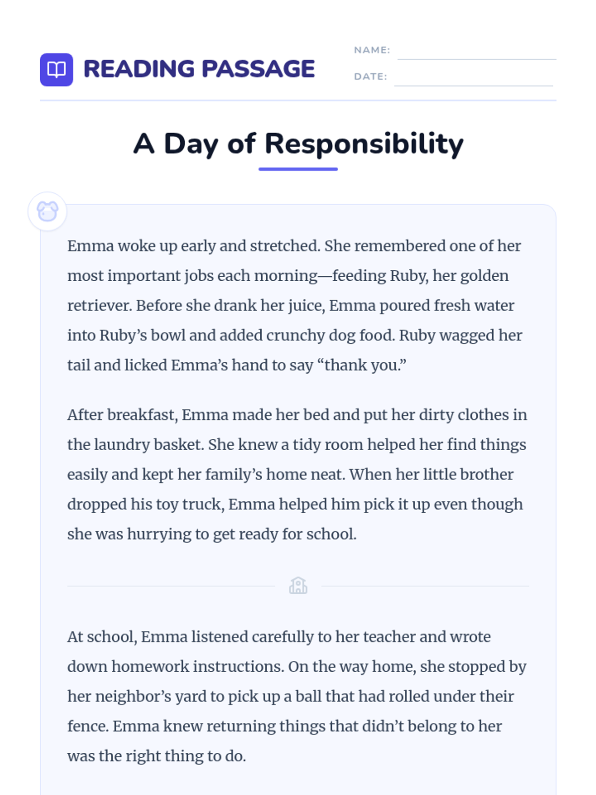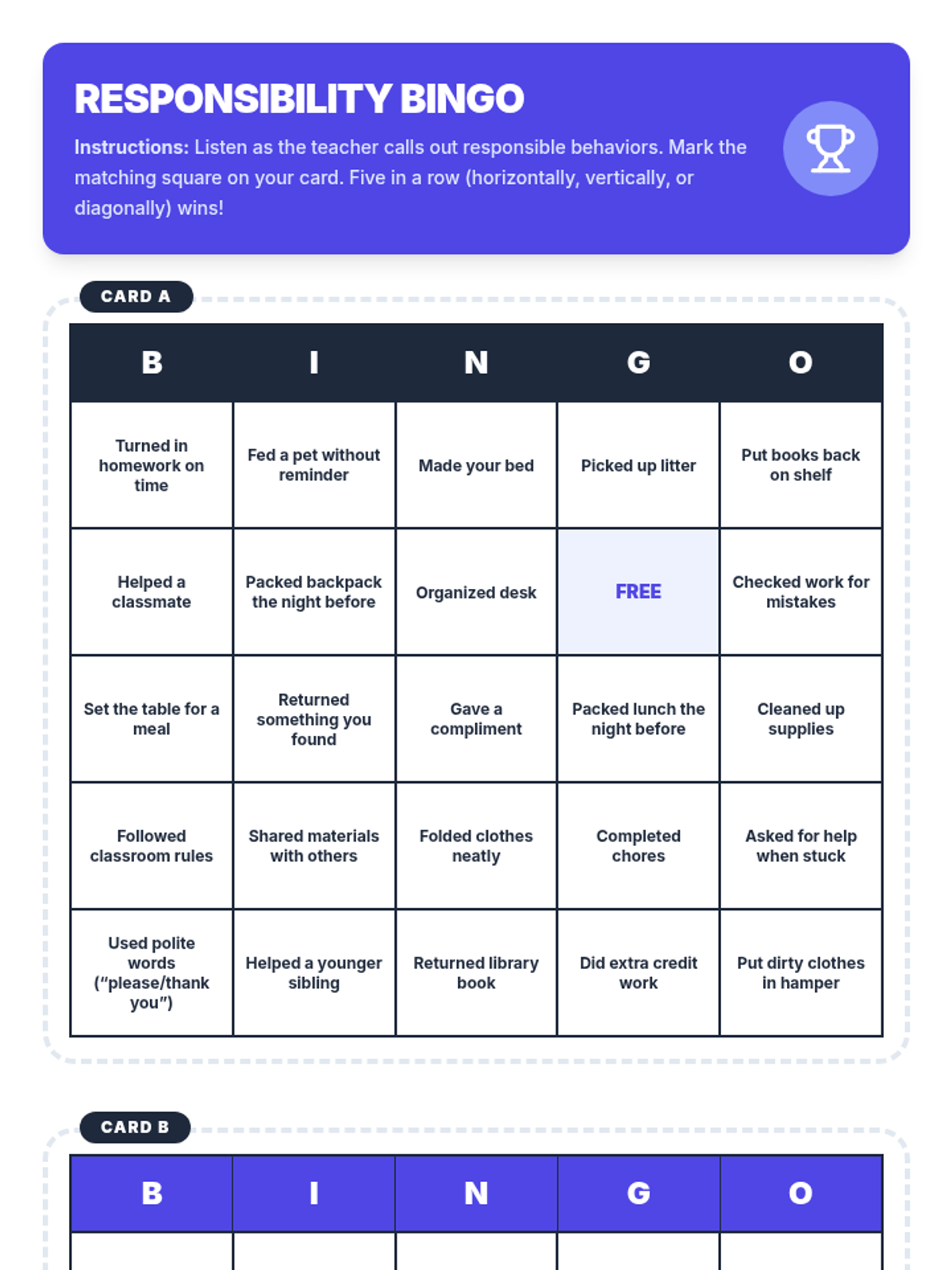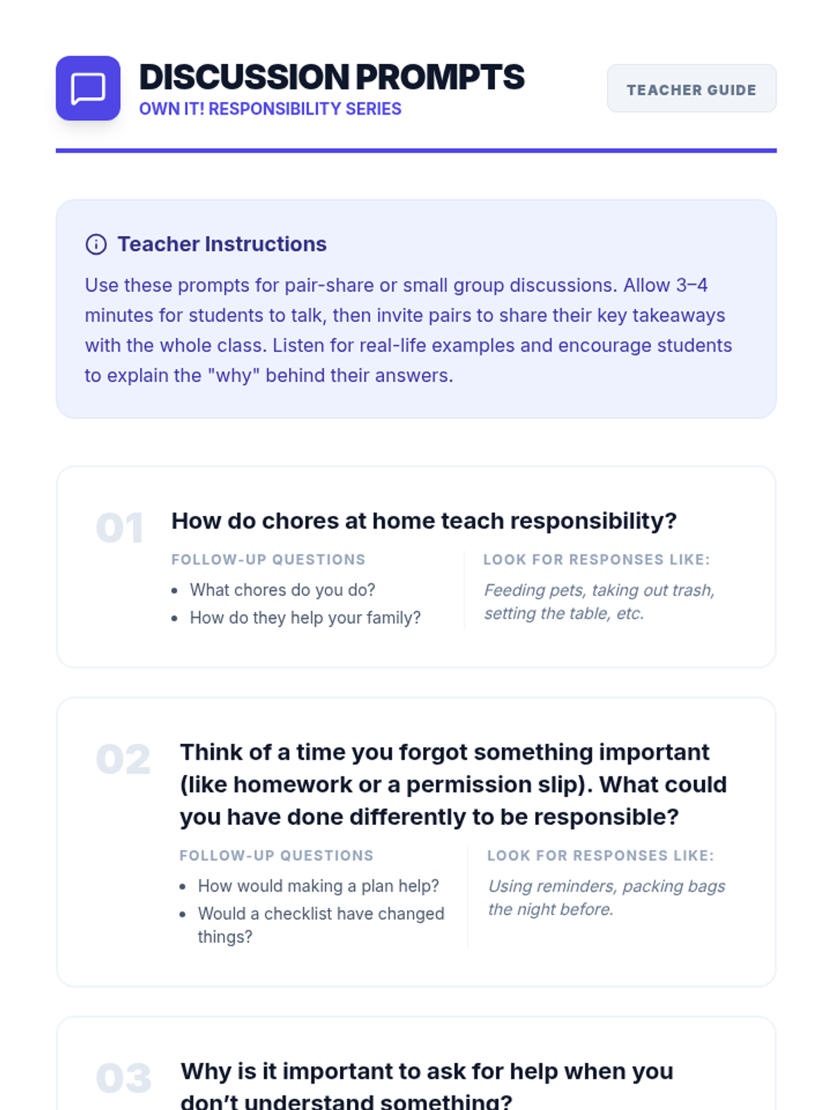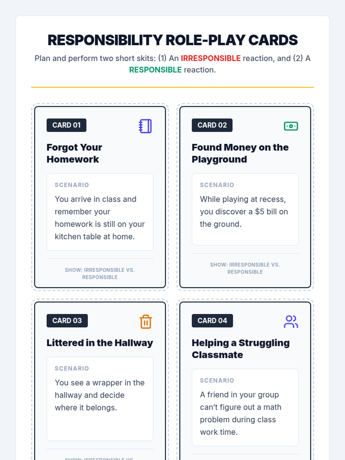 In this 55-minute lesson, 3rd and 4th graders explore responsibility through a reading passage, group discussions, role-play skits, and a Bingo game. Students learn to define responsibility as taking ownership of duties and making good choices without reminders.