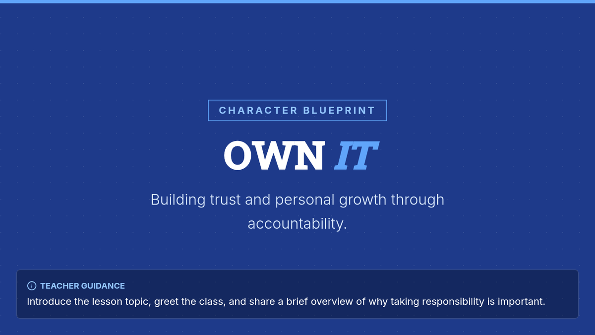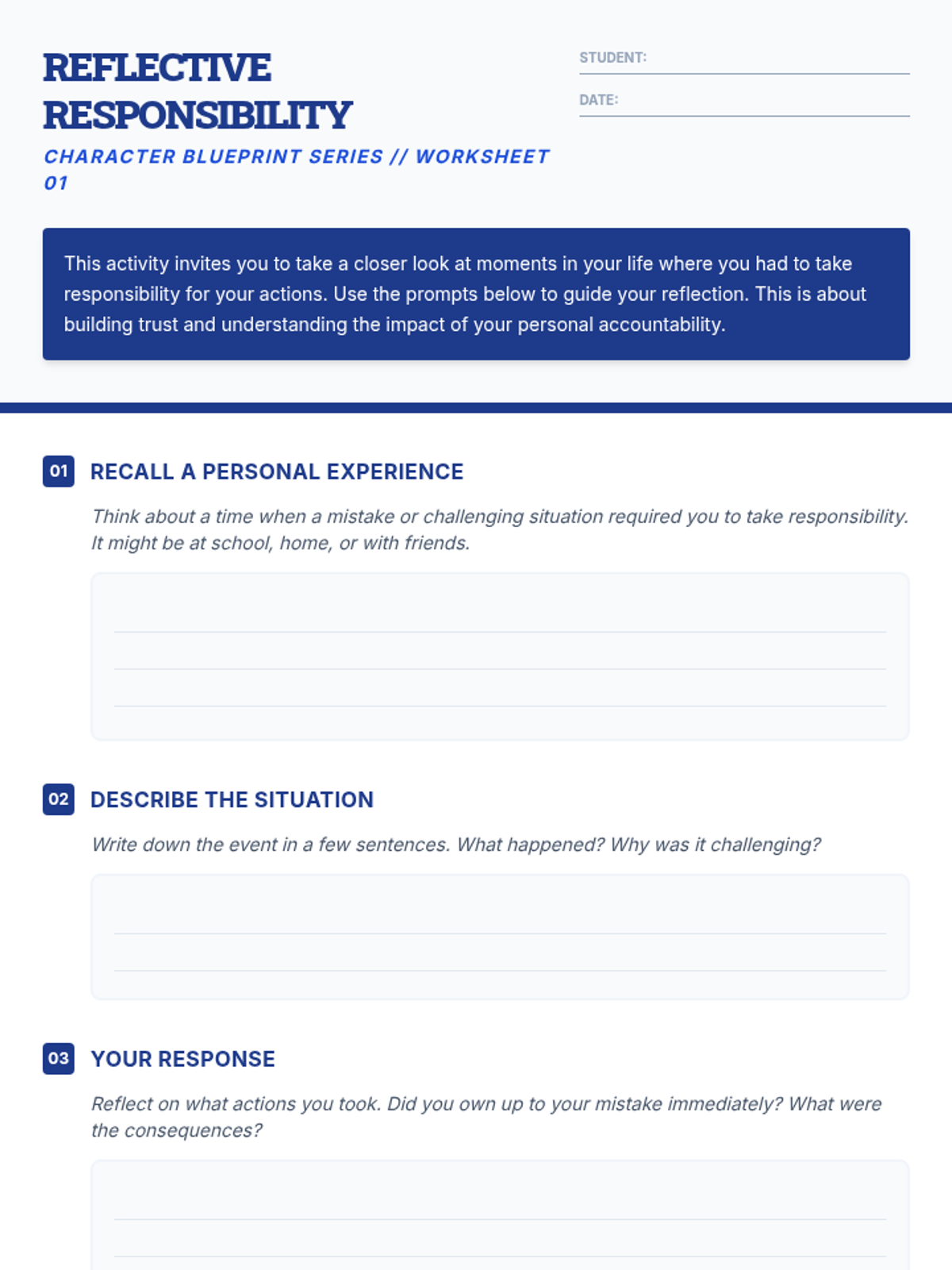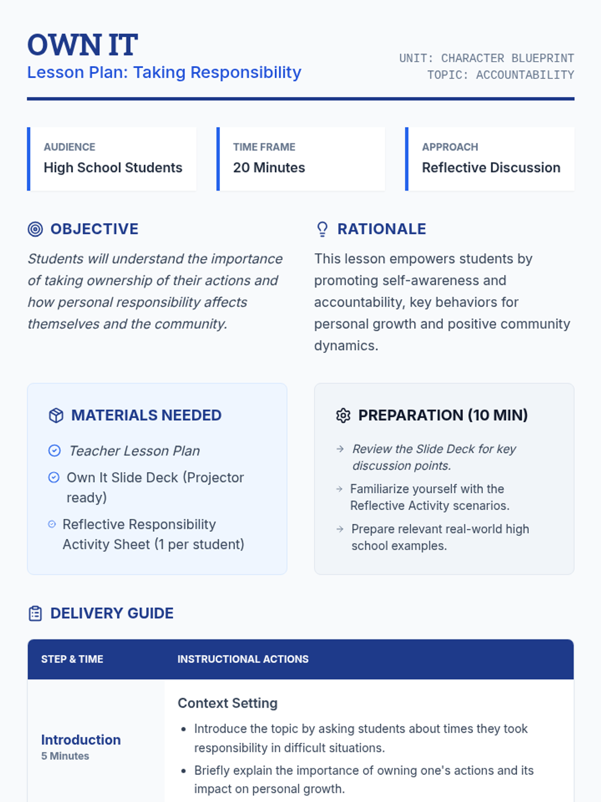 A comprehensive lesson for high school students on the power of personal accountability, using scenarios and reflective practice to build character and community trust.