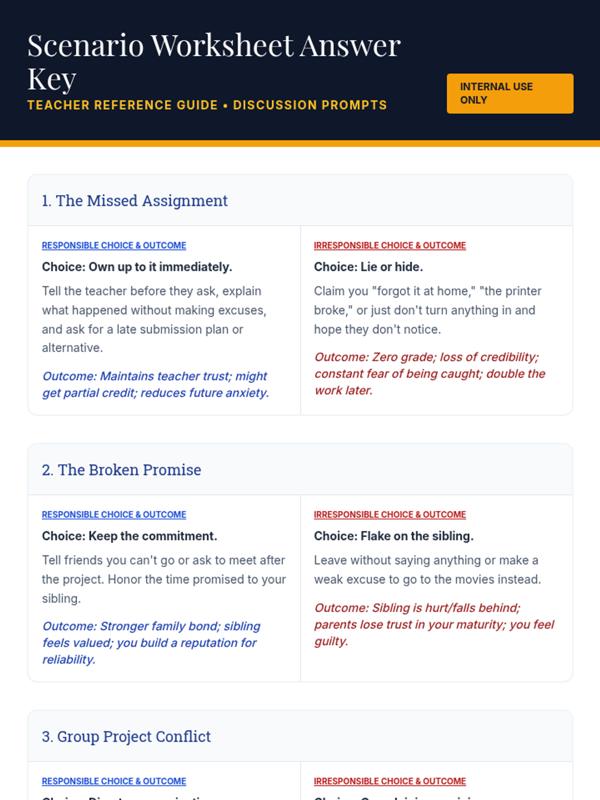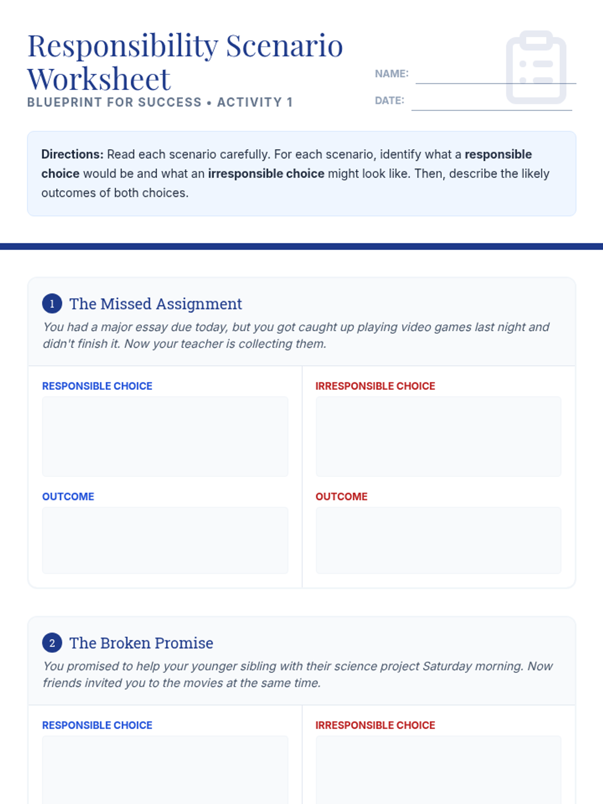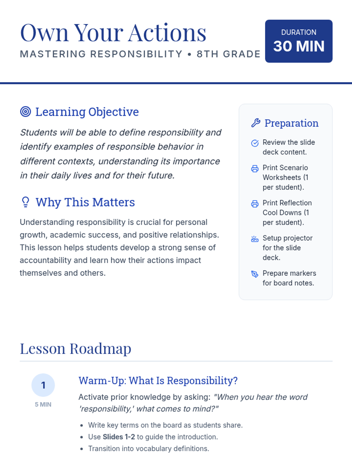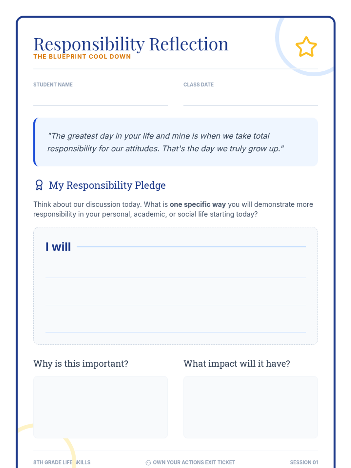 An 8th-grade lesson exploring personal, academic, and social responsibility through discussion, scenario analysis, and a personal commitment pledge.