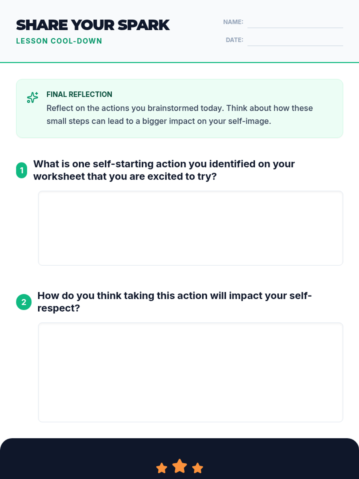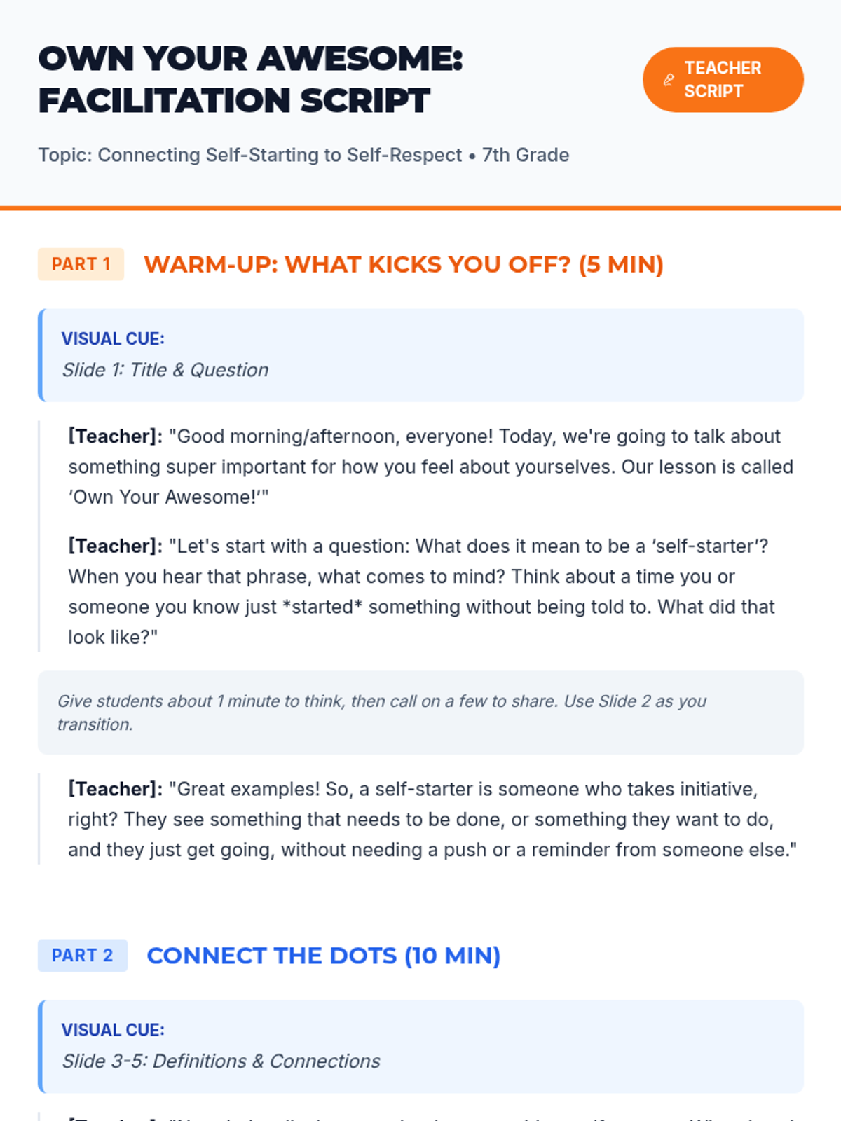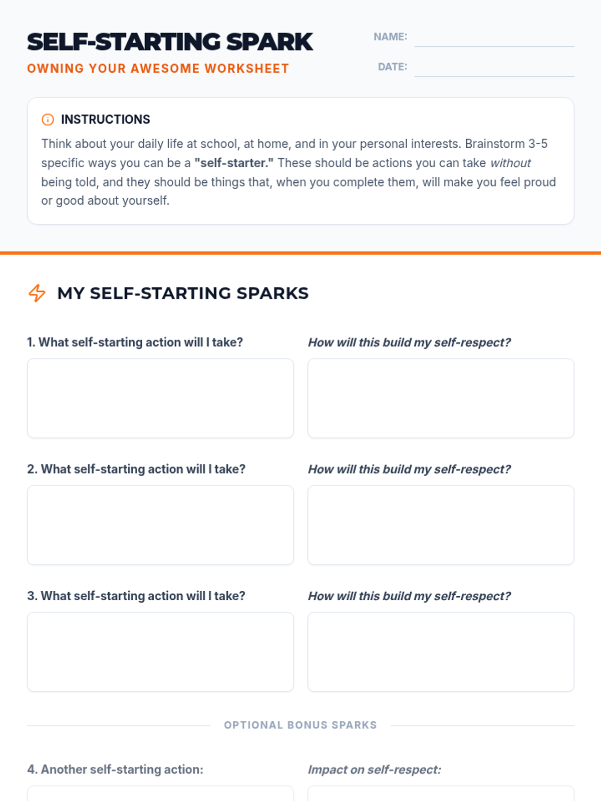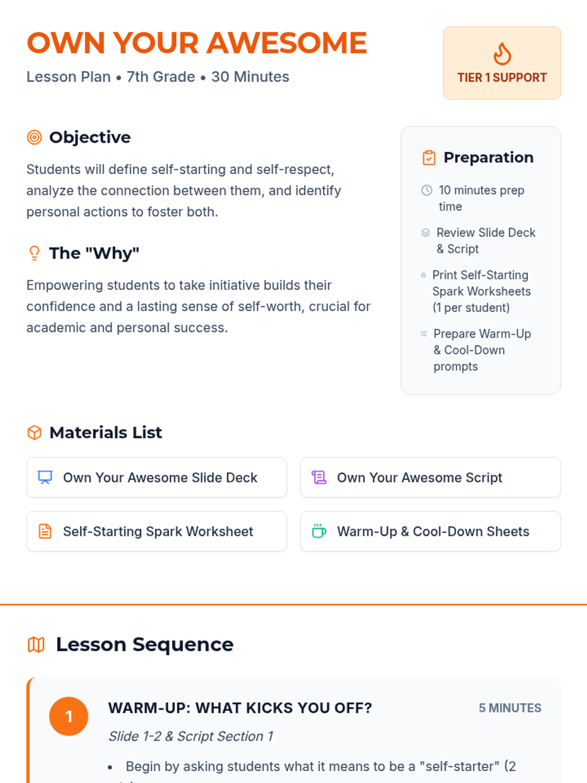A 30-minute 7th-grade lesson exploring the link between taking initiative and building self-respect, empowering students to 'own their awesome' through self-starting actions.
