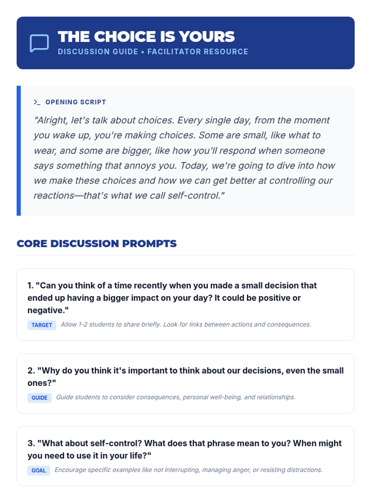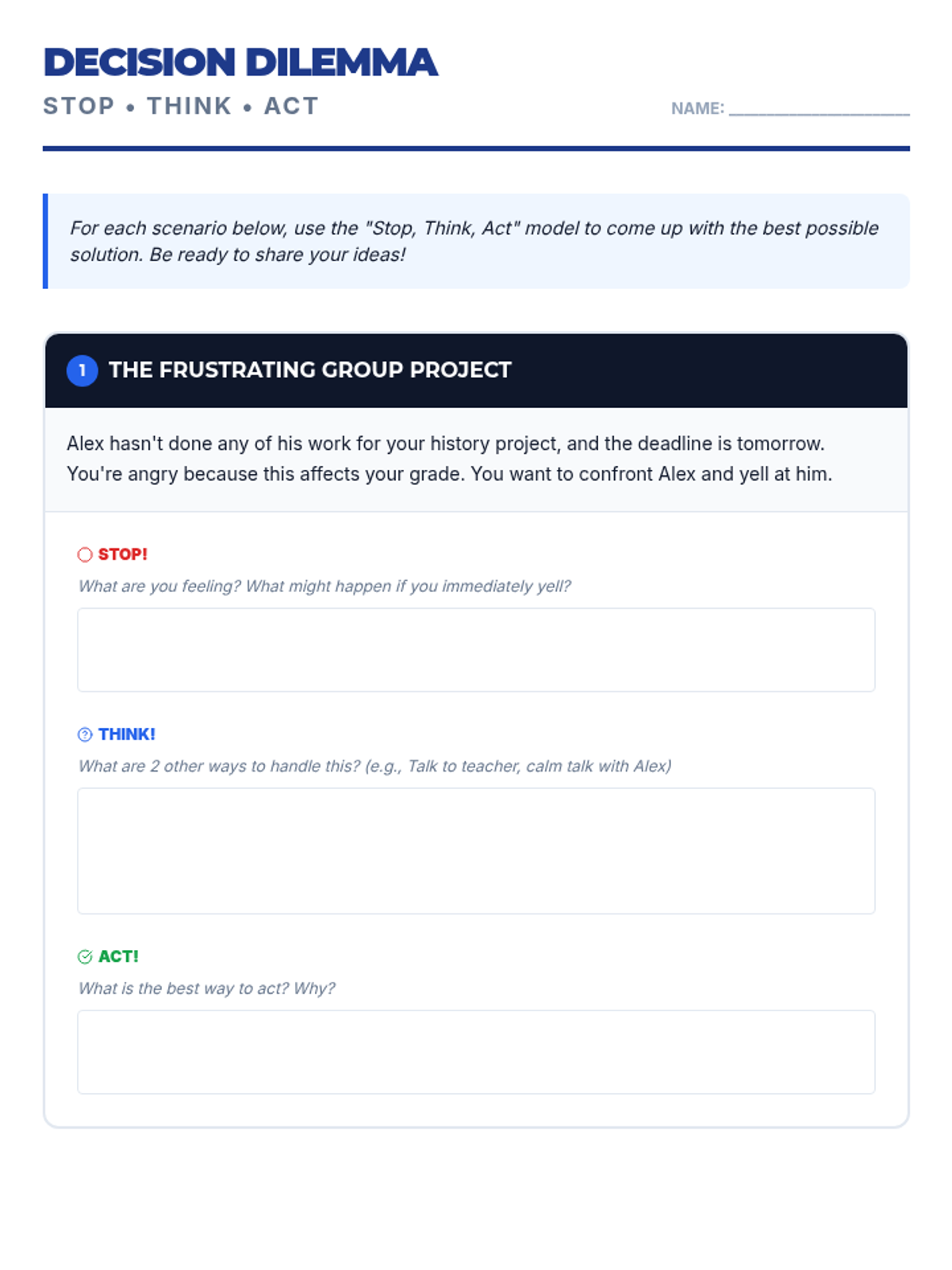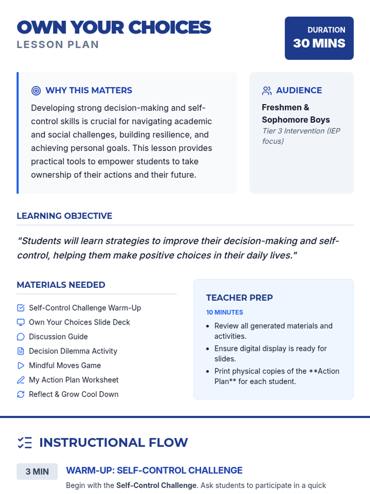 A 30-minute Tier 3 intervention for freshmen and sophomore boys focused on improving decision-making through the 'Stop, Think, Act' model and strengthening self-control muscles.