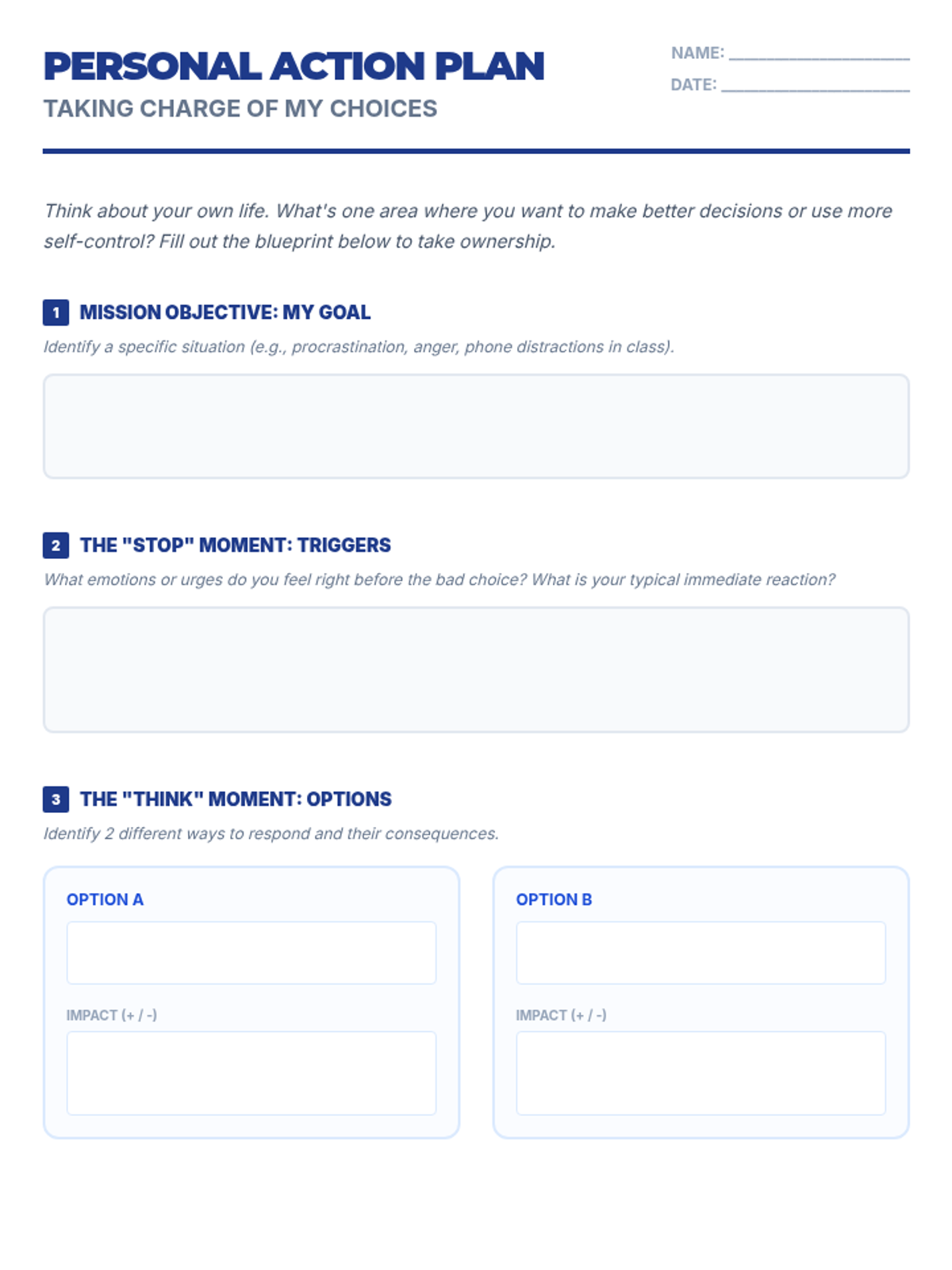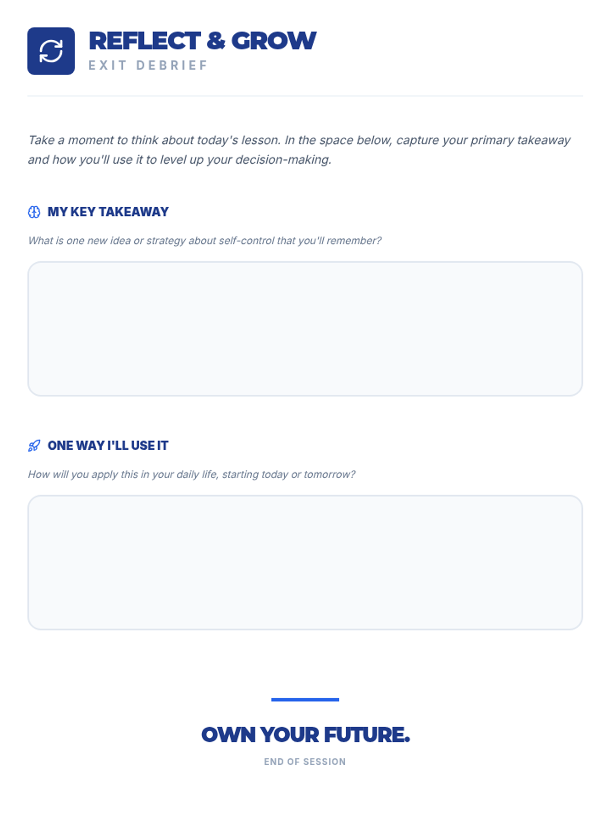 A final reflection on the 8-week journey. Students map out how they will carry their authentic 'blueprint' into their future goals and relationships.