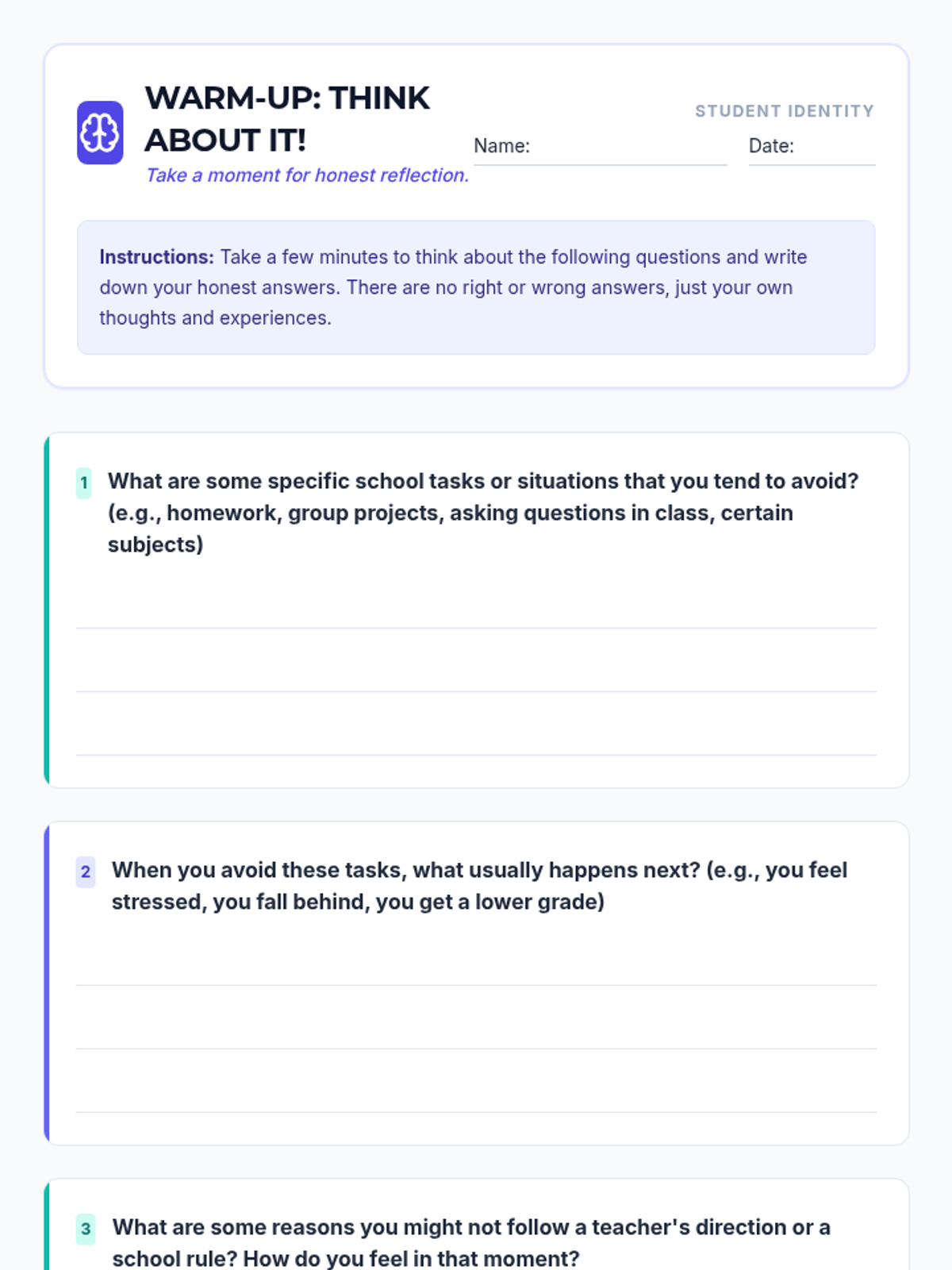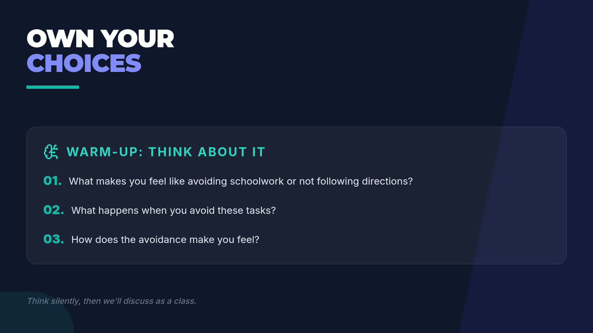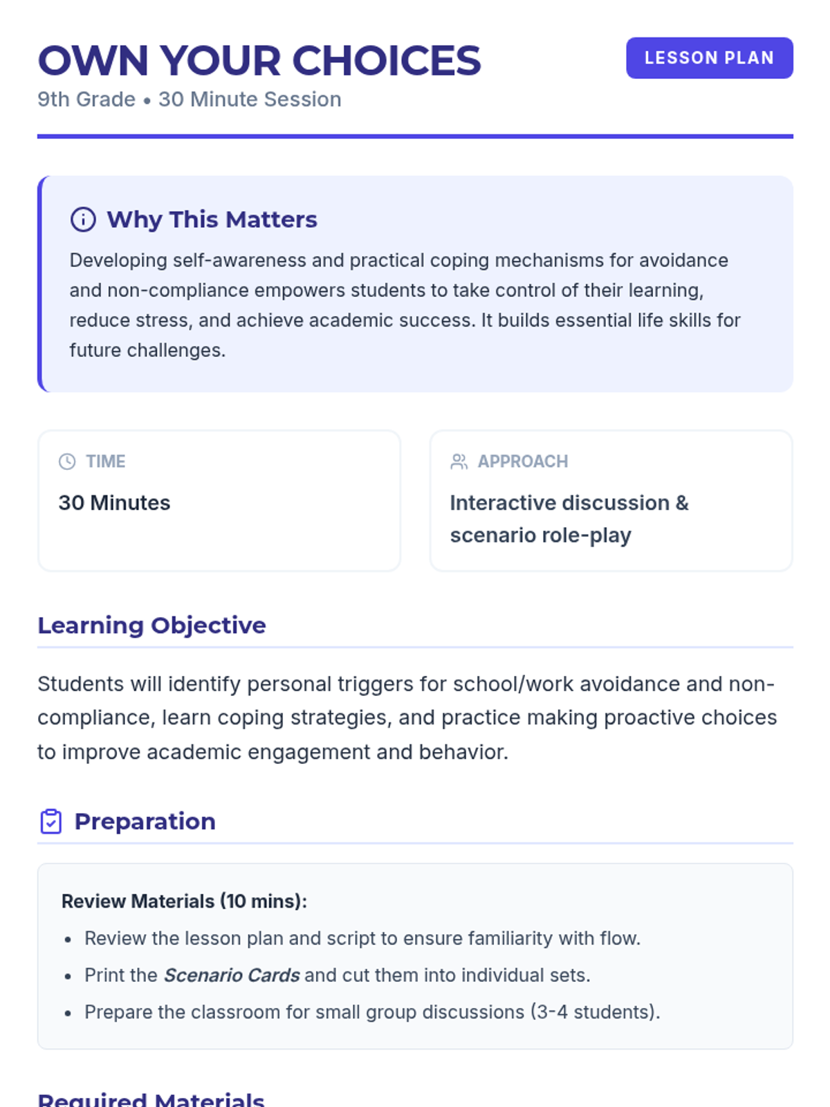 A 30-minute interactive lesson for 9th graders focused on identifying triggers for school avoidance and practicing proactive decision-making to take ownership of academic success.