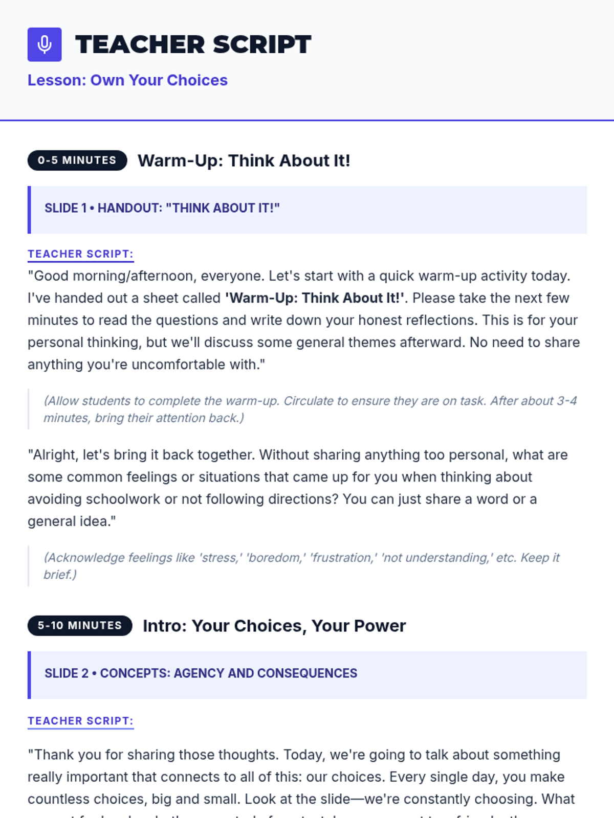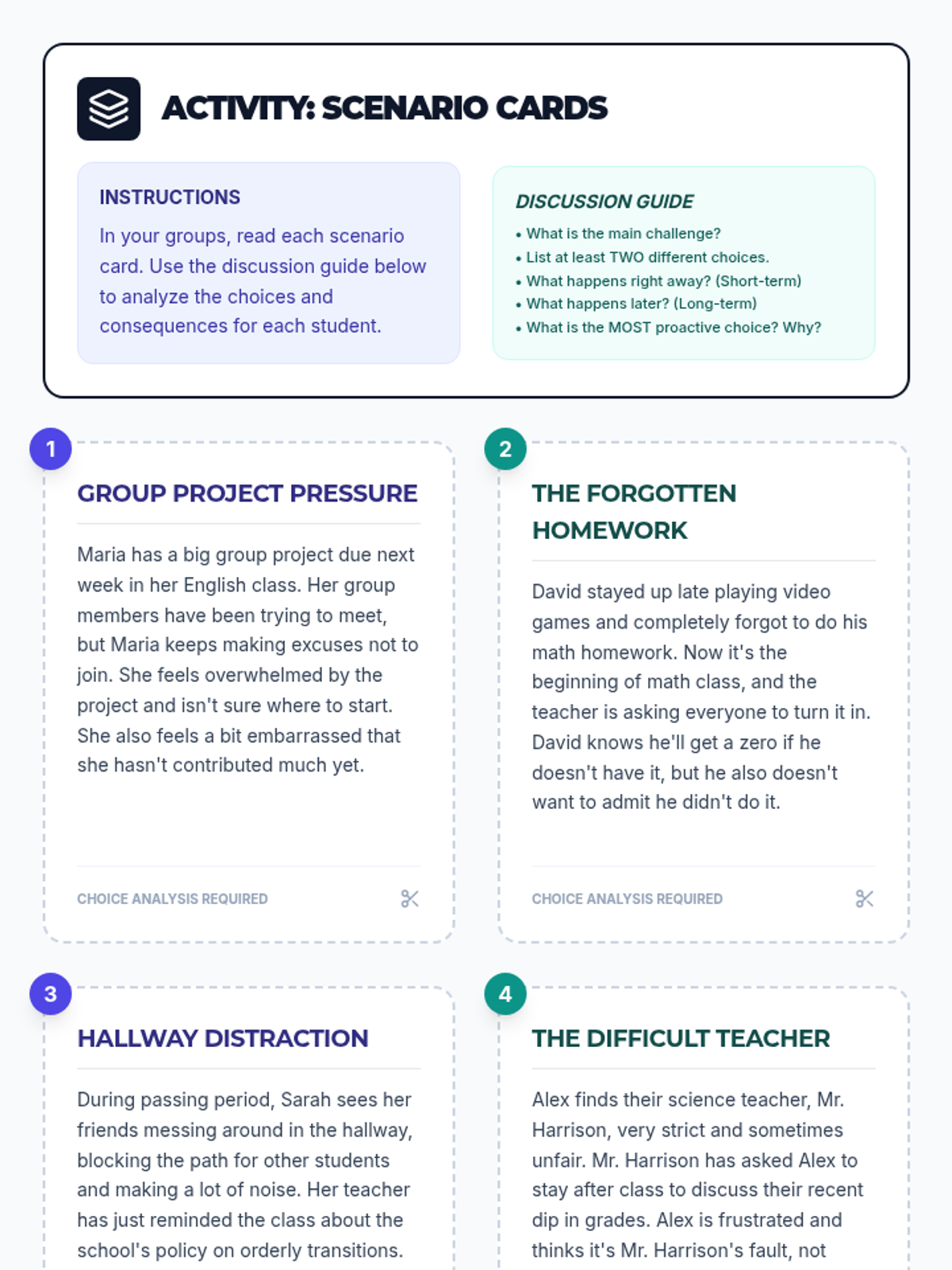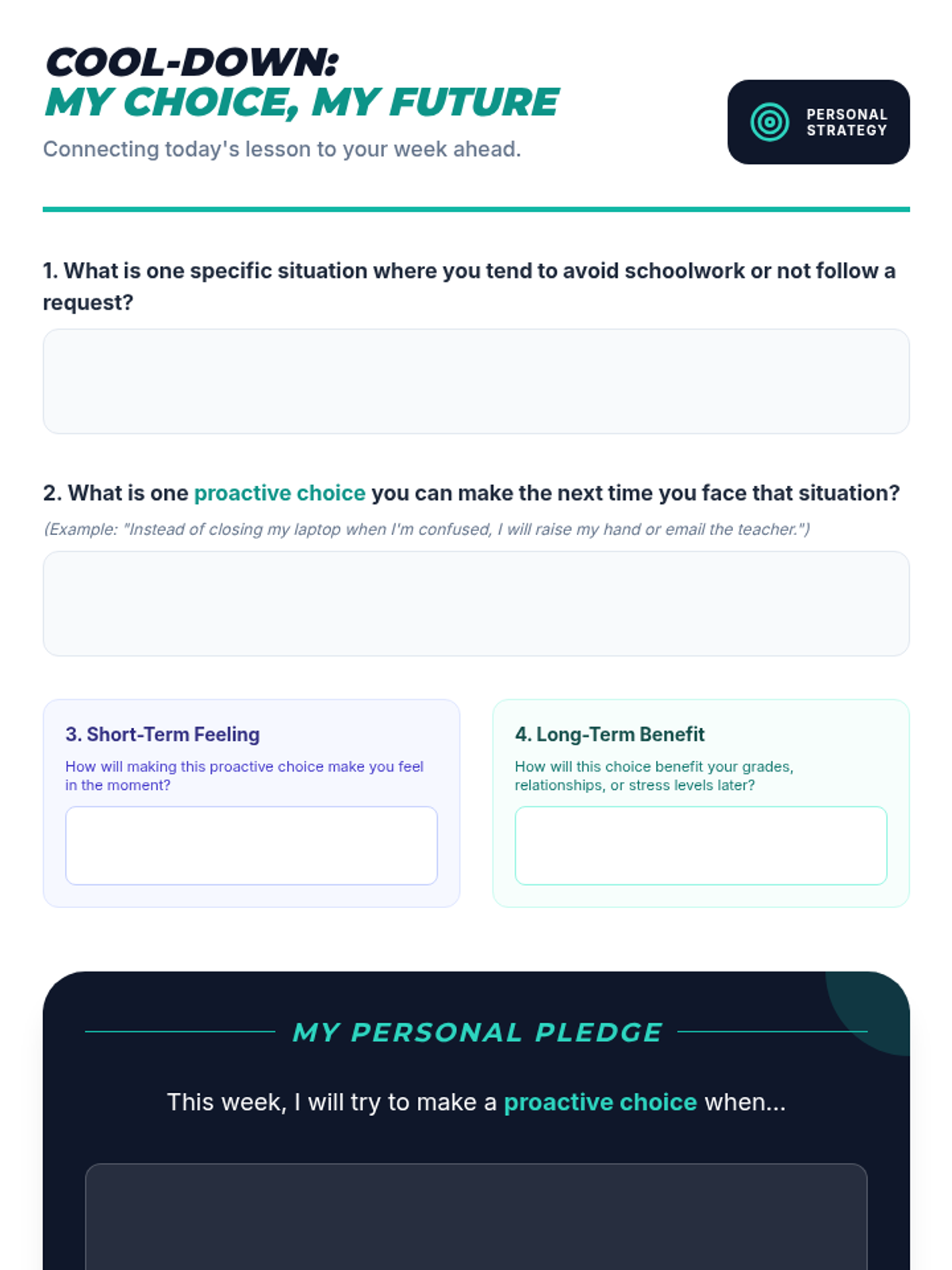 A 30-minute interactive lesson for 9th graders focused on identifying triggers for school avoidance and practicing proactive decision-making to take ownership of academic success.