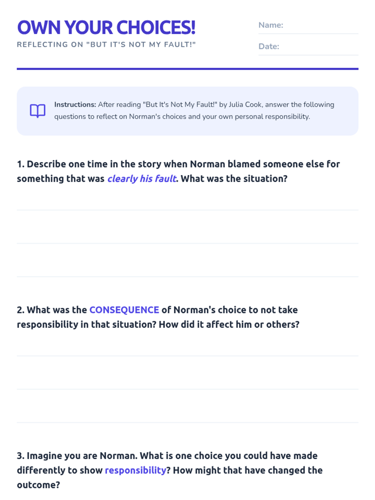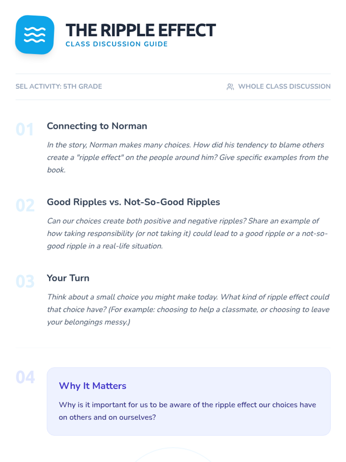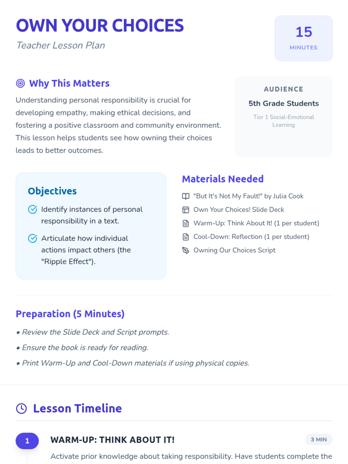 A 15-minute SEL lesson for 5th graders focused on personal responsibility and the ripple effect of choices, centered around the book 'But It's Not My Fault!' by Julia Cook.
