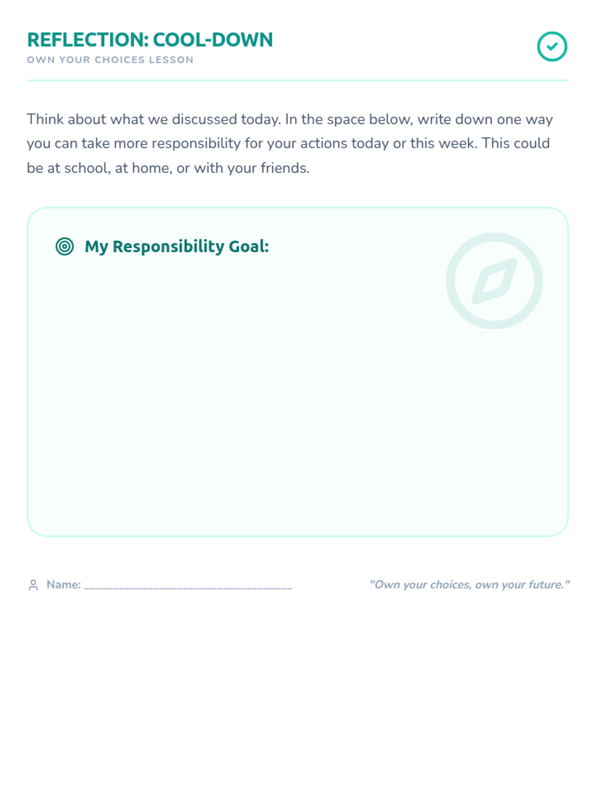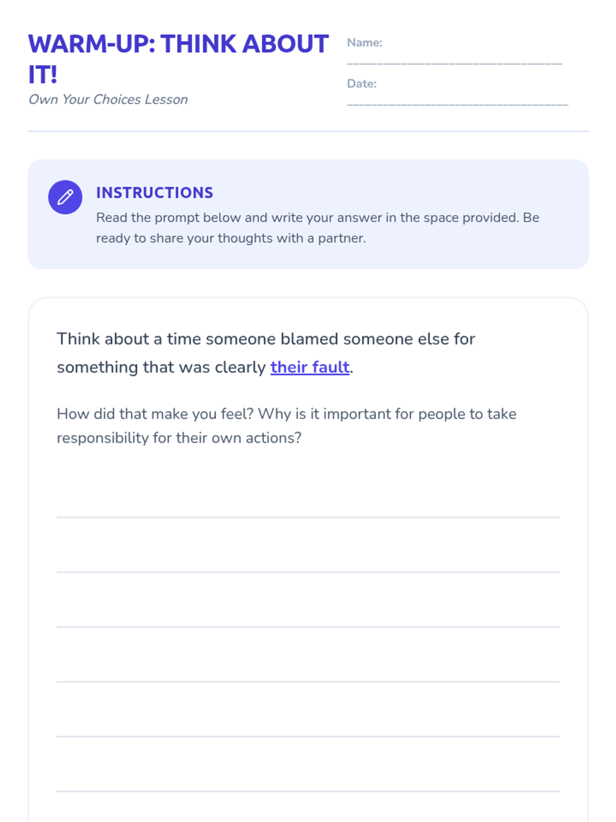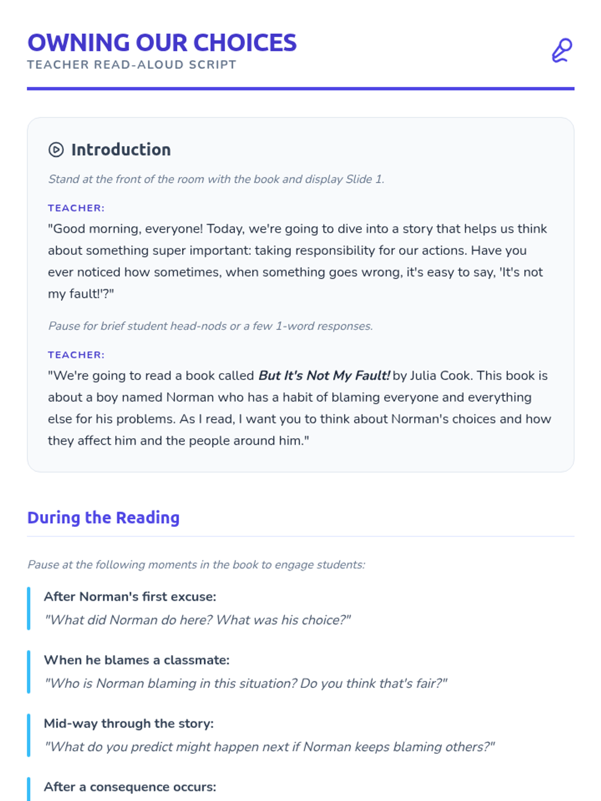 A 15-minute SEL lesson for 5th graders focused on personal responsibility and the ripple effect of choices, centered around the book 'But It's Not My Fault!' by Julia Cook.