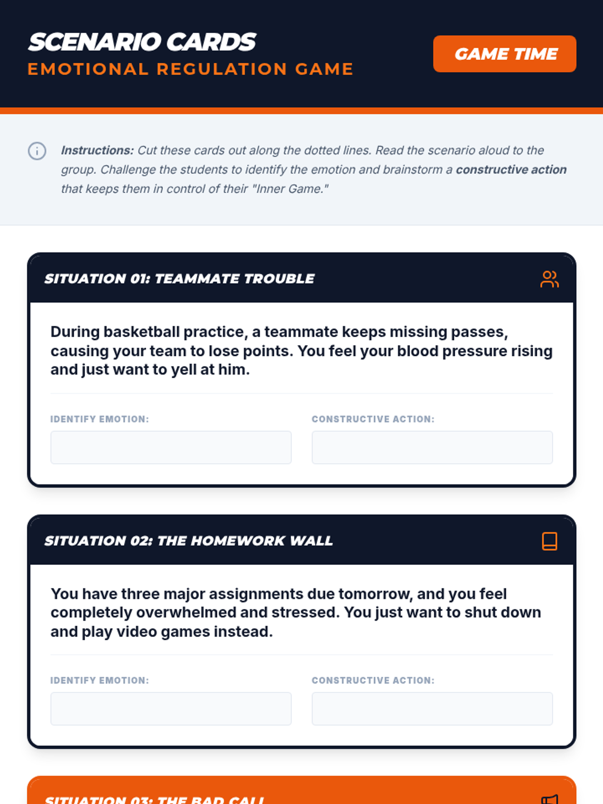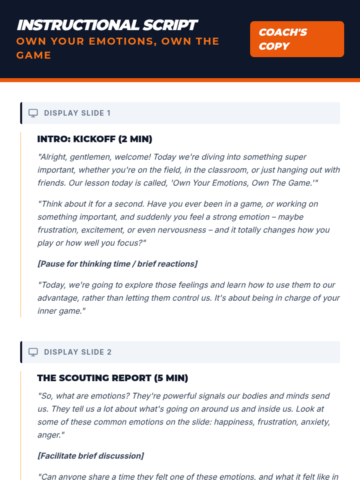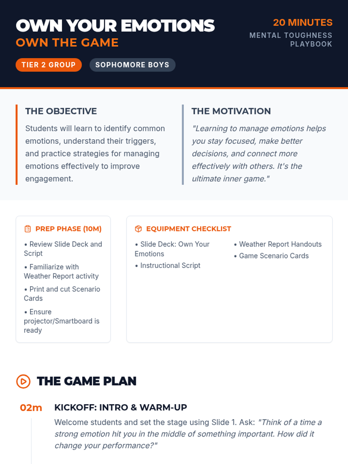 A 20-minute Tier 2 group lesson for sophomore boys focused on emotional regulation and self-awareness through an athletic-themed 'game plan' approach.